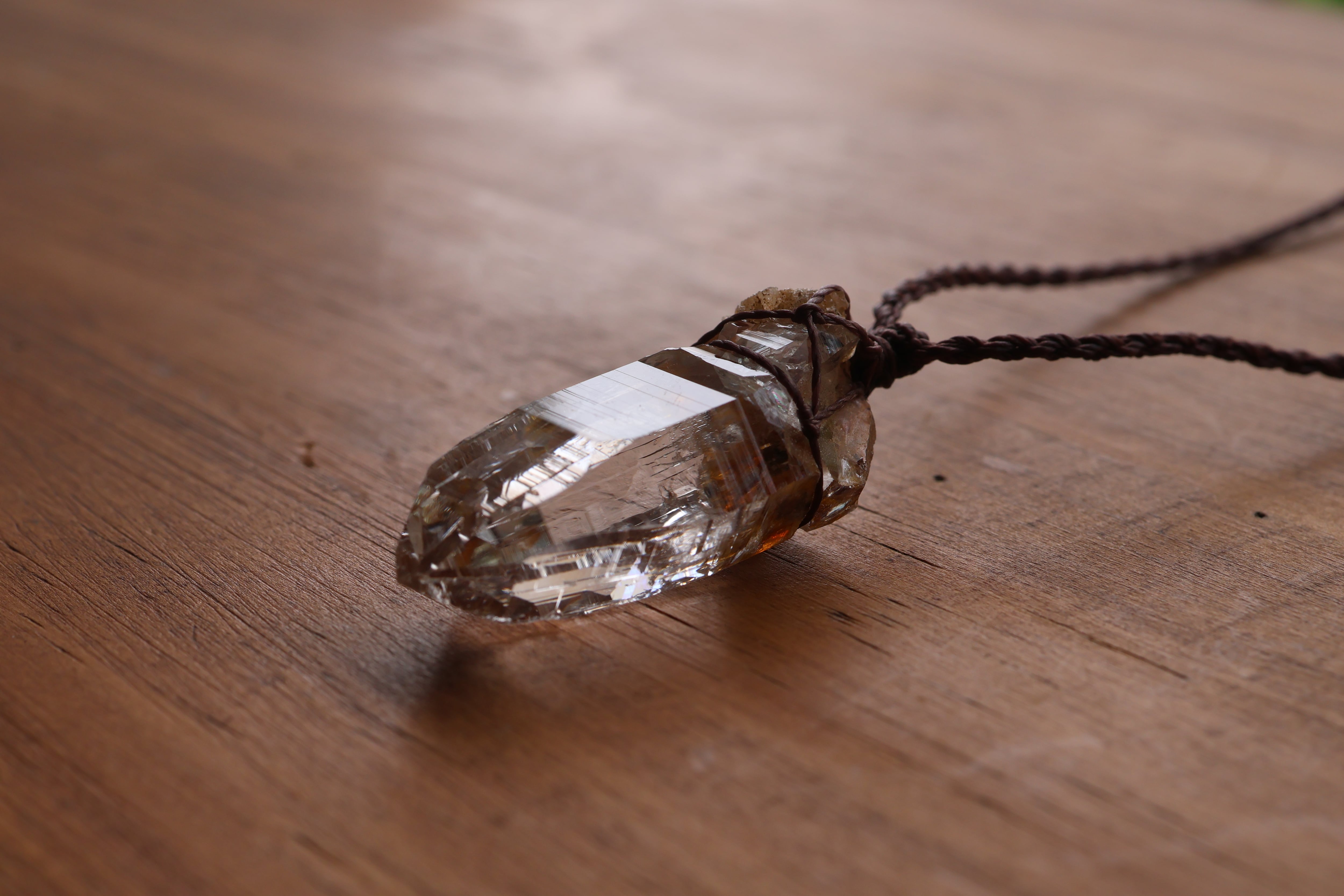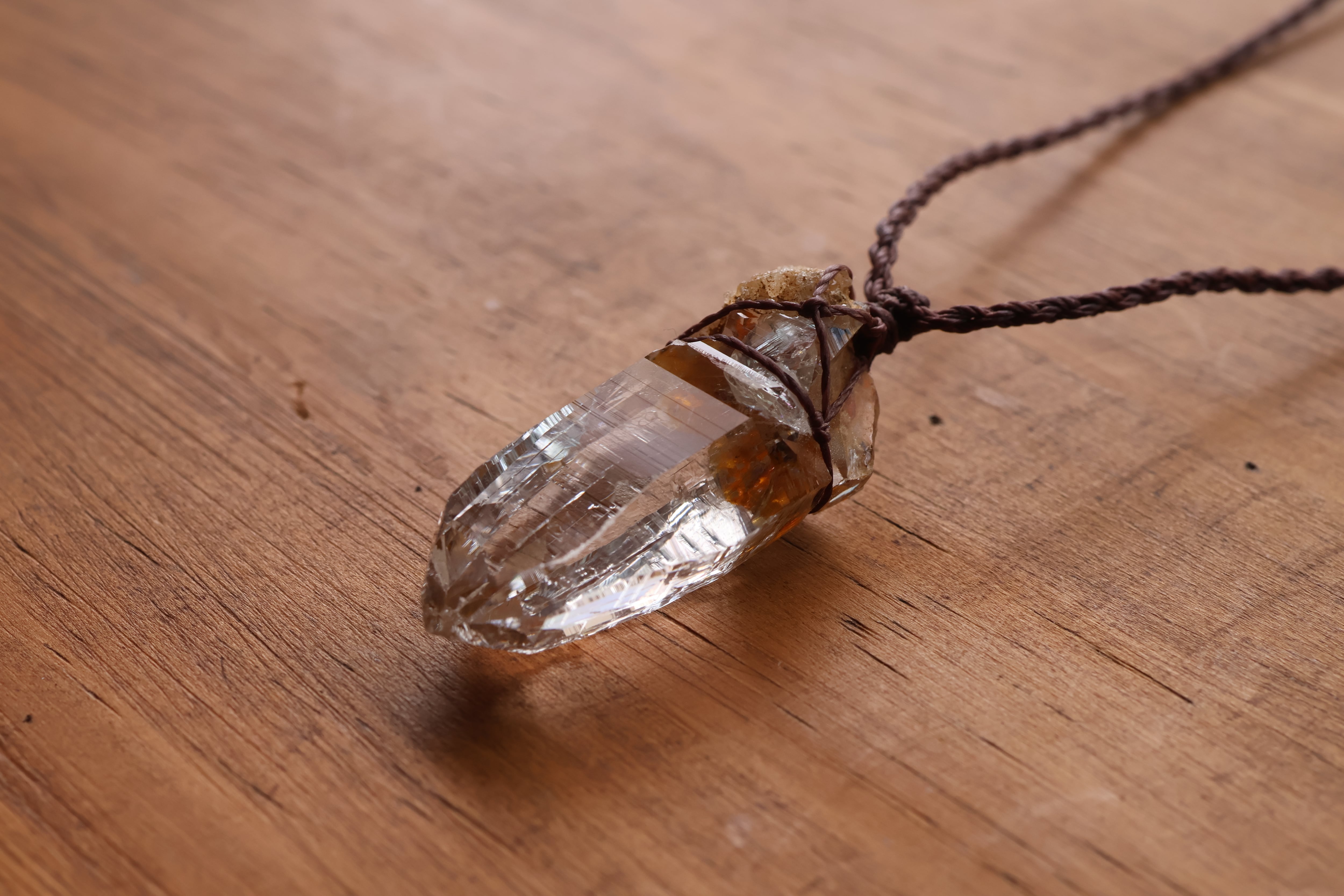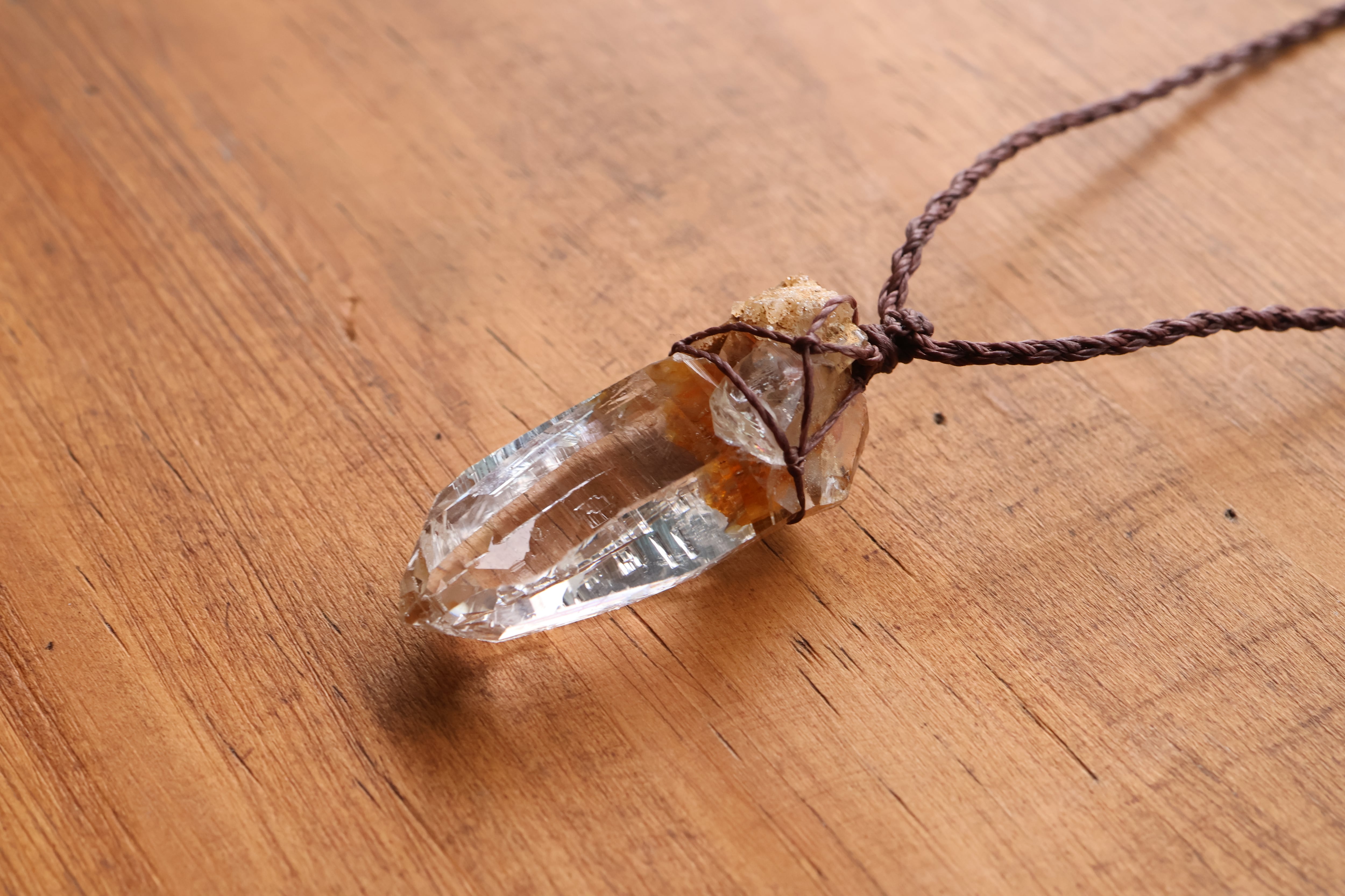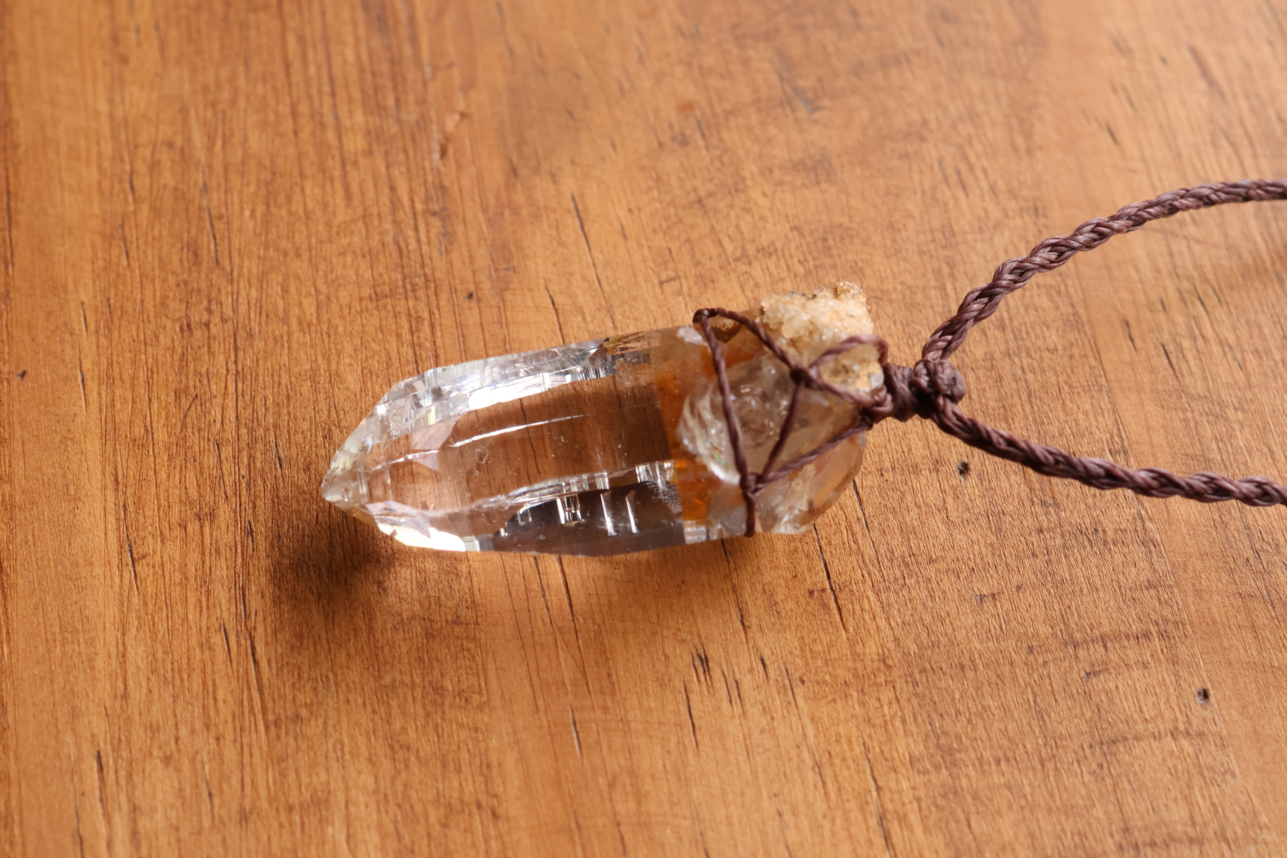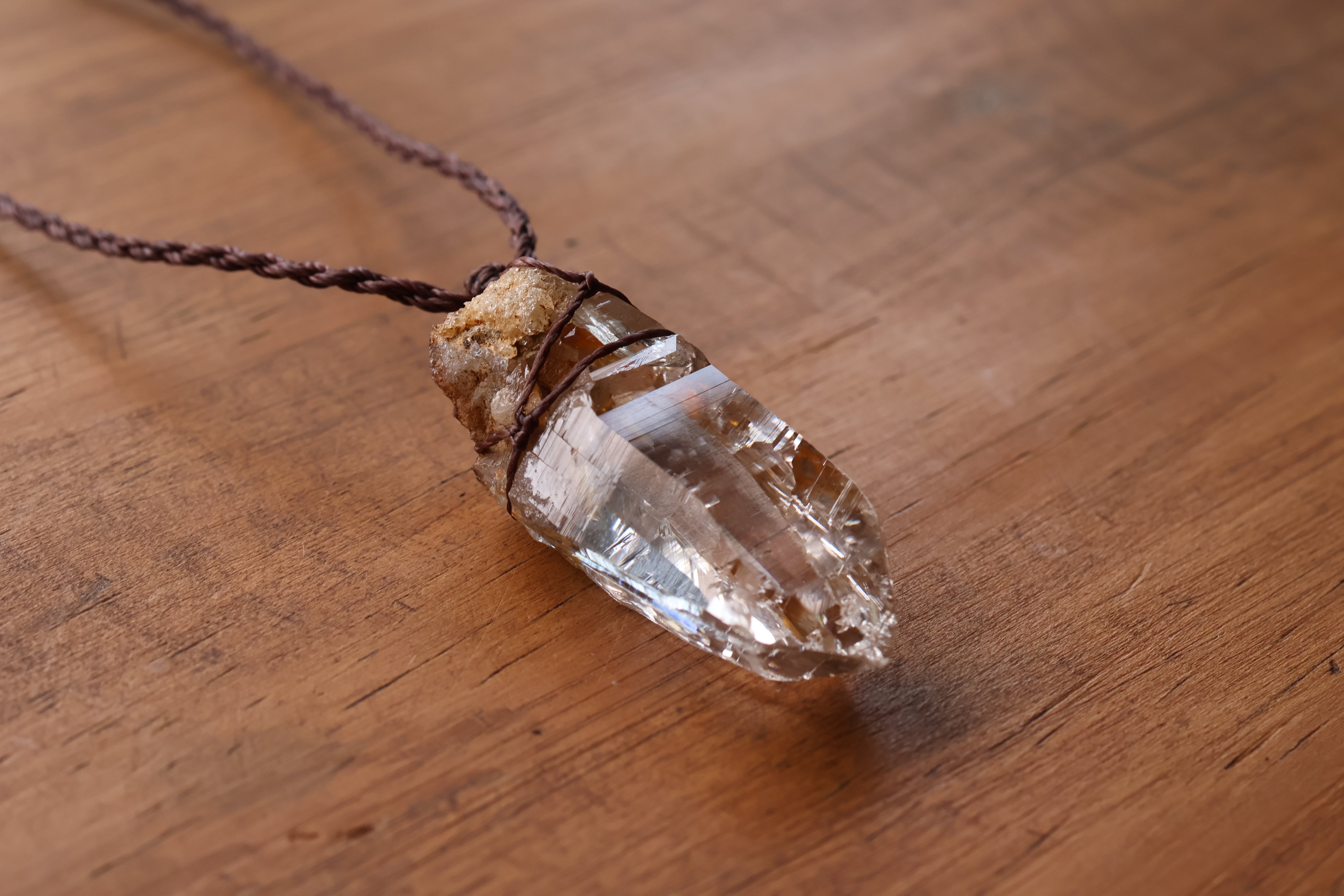 透き通る水の雫のような透明度が高いガネーシュヒマール産のヒマラヤ水晶をシンプルに編み、ペンダントに仕立てました。