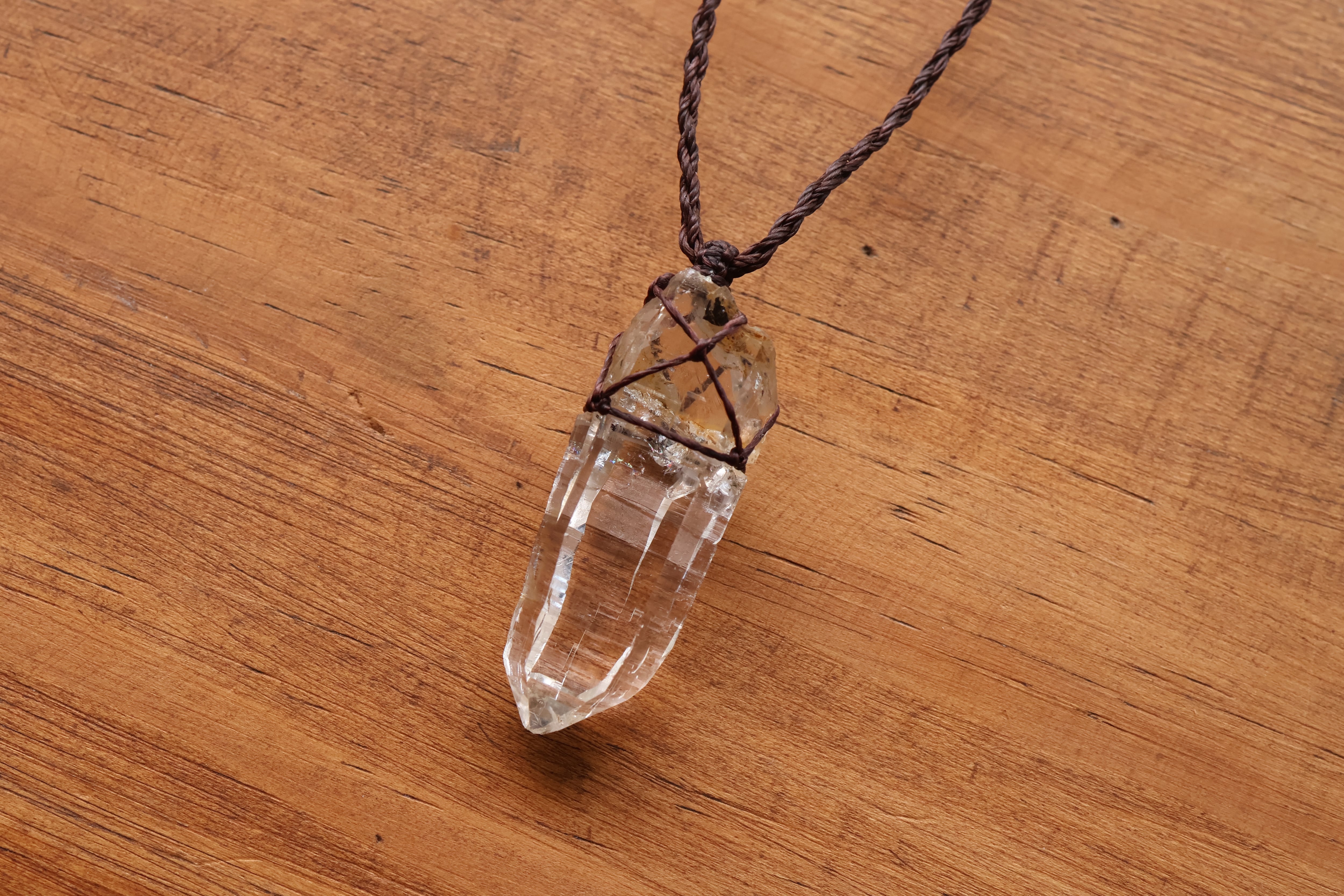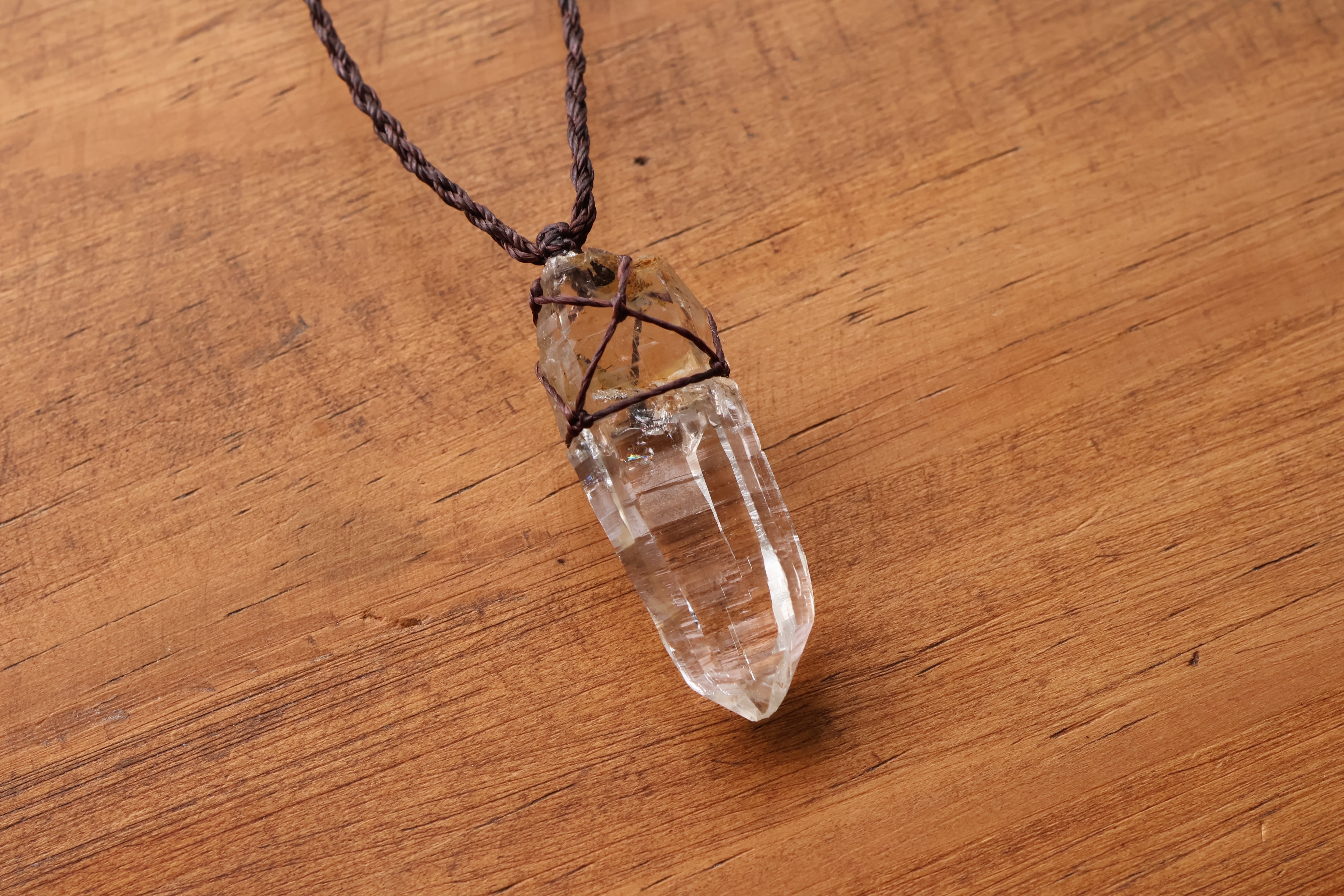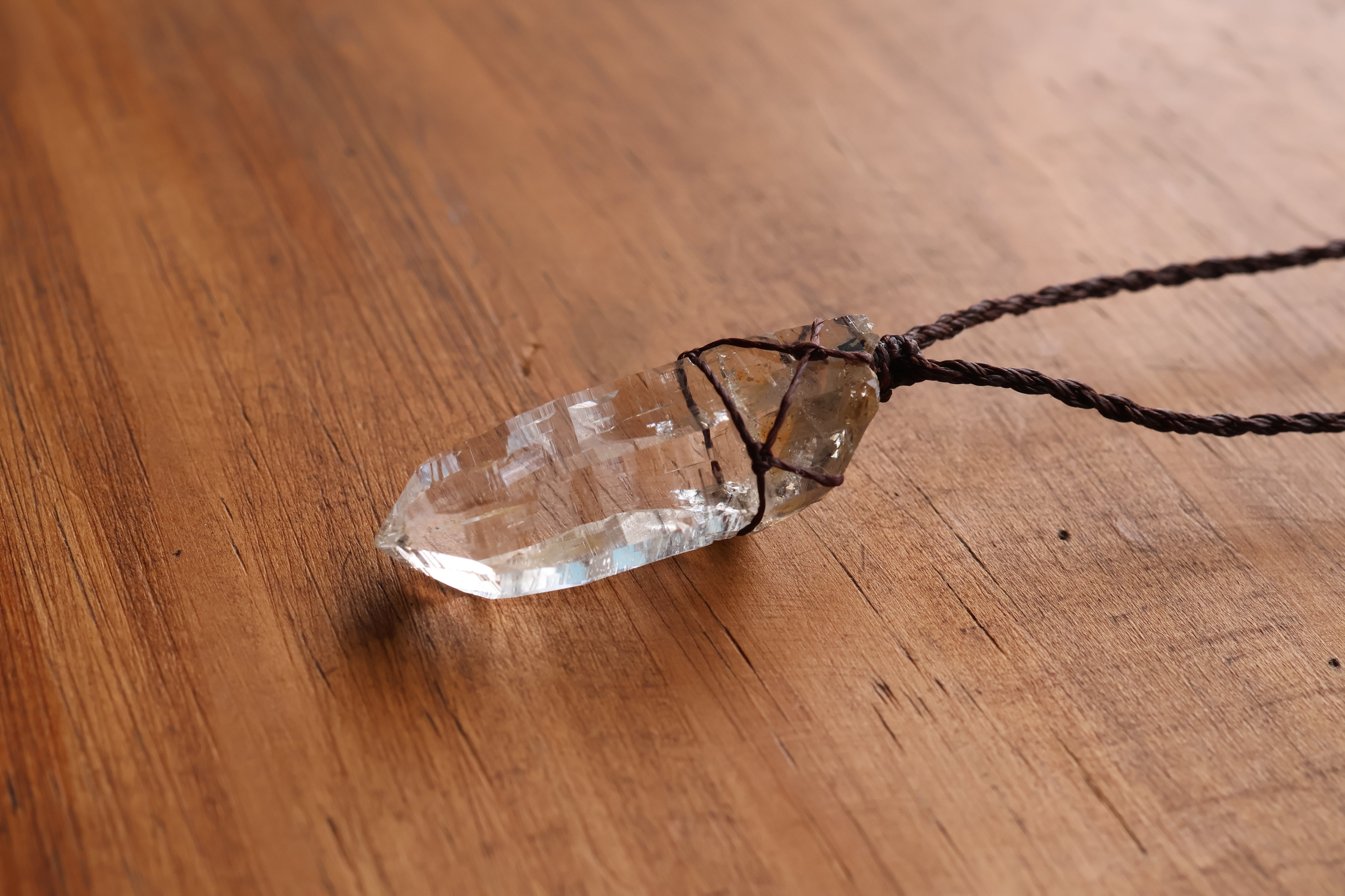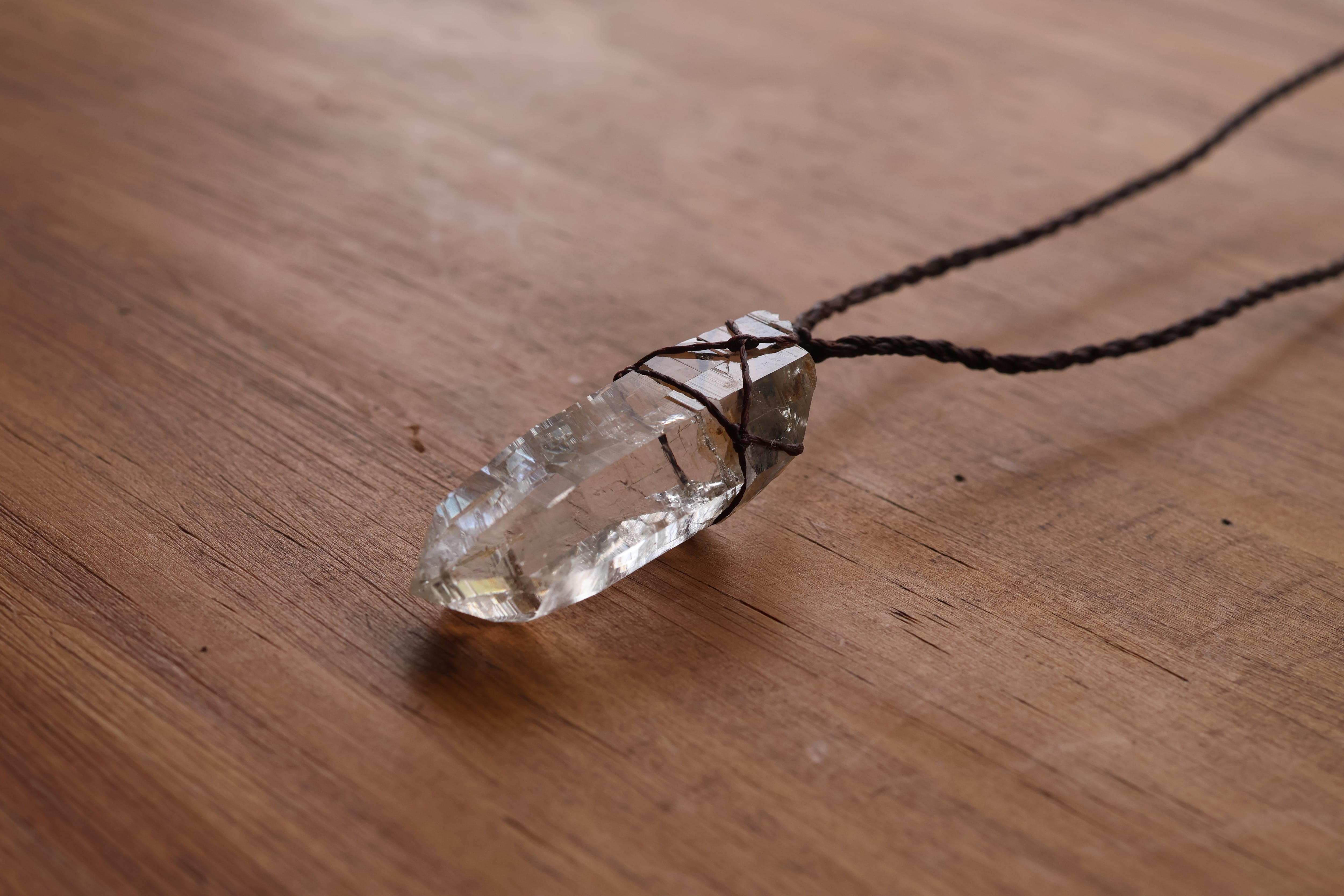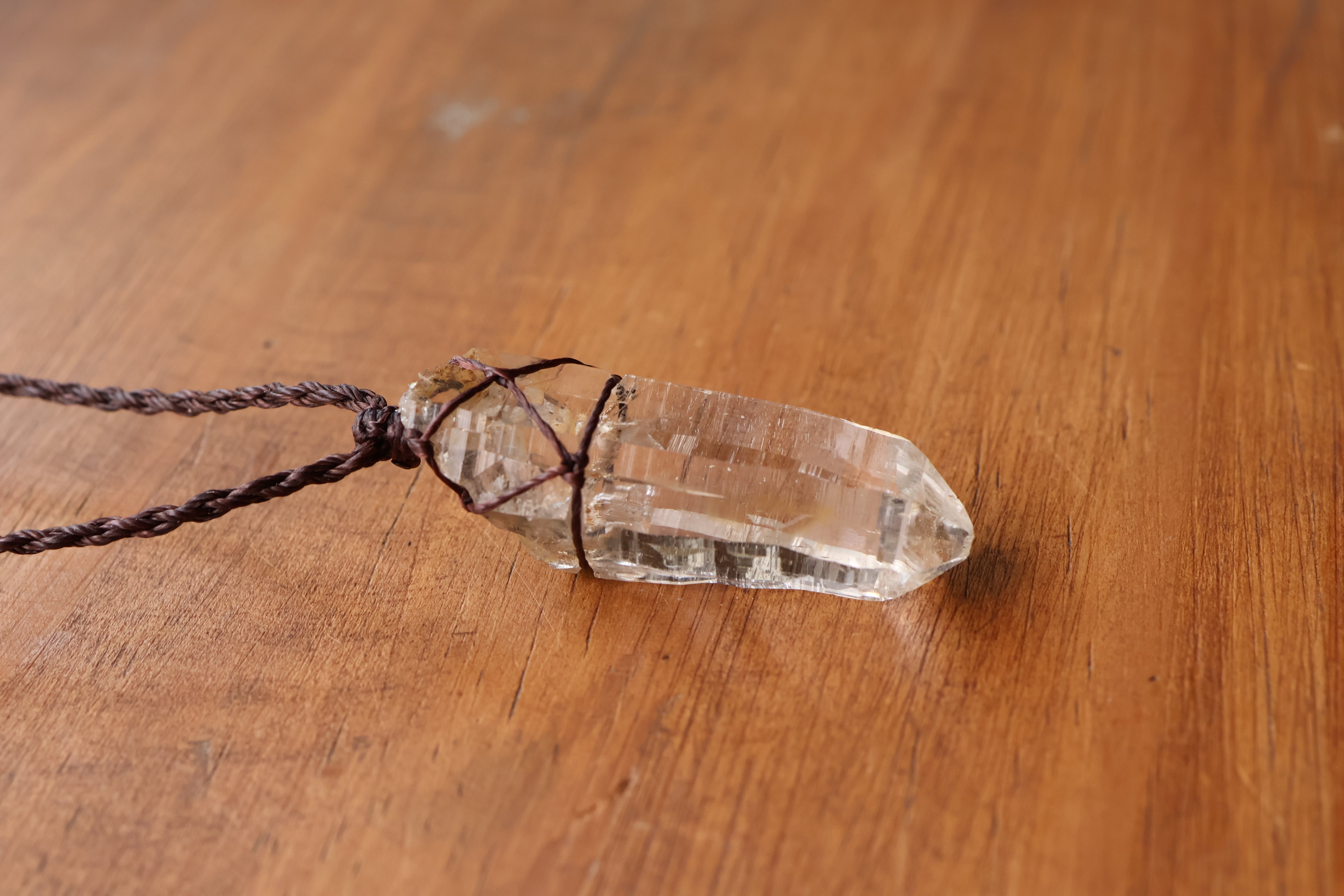 透き通る水の雫のような透明度が高いガネーシュヒマール産のヒマラヤ水晶をシンプルに編み、ペンダントに仕立てました。