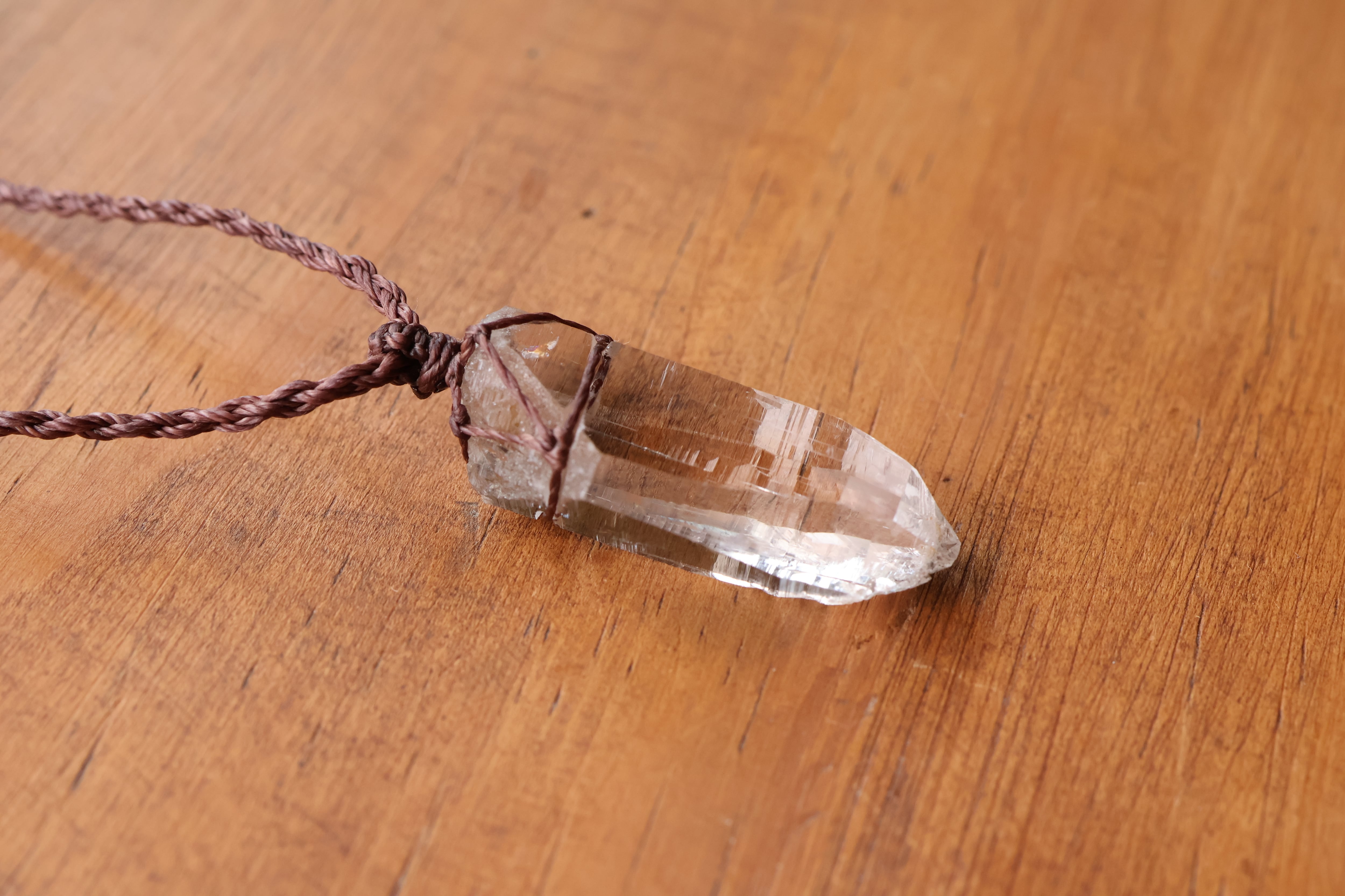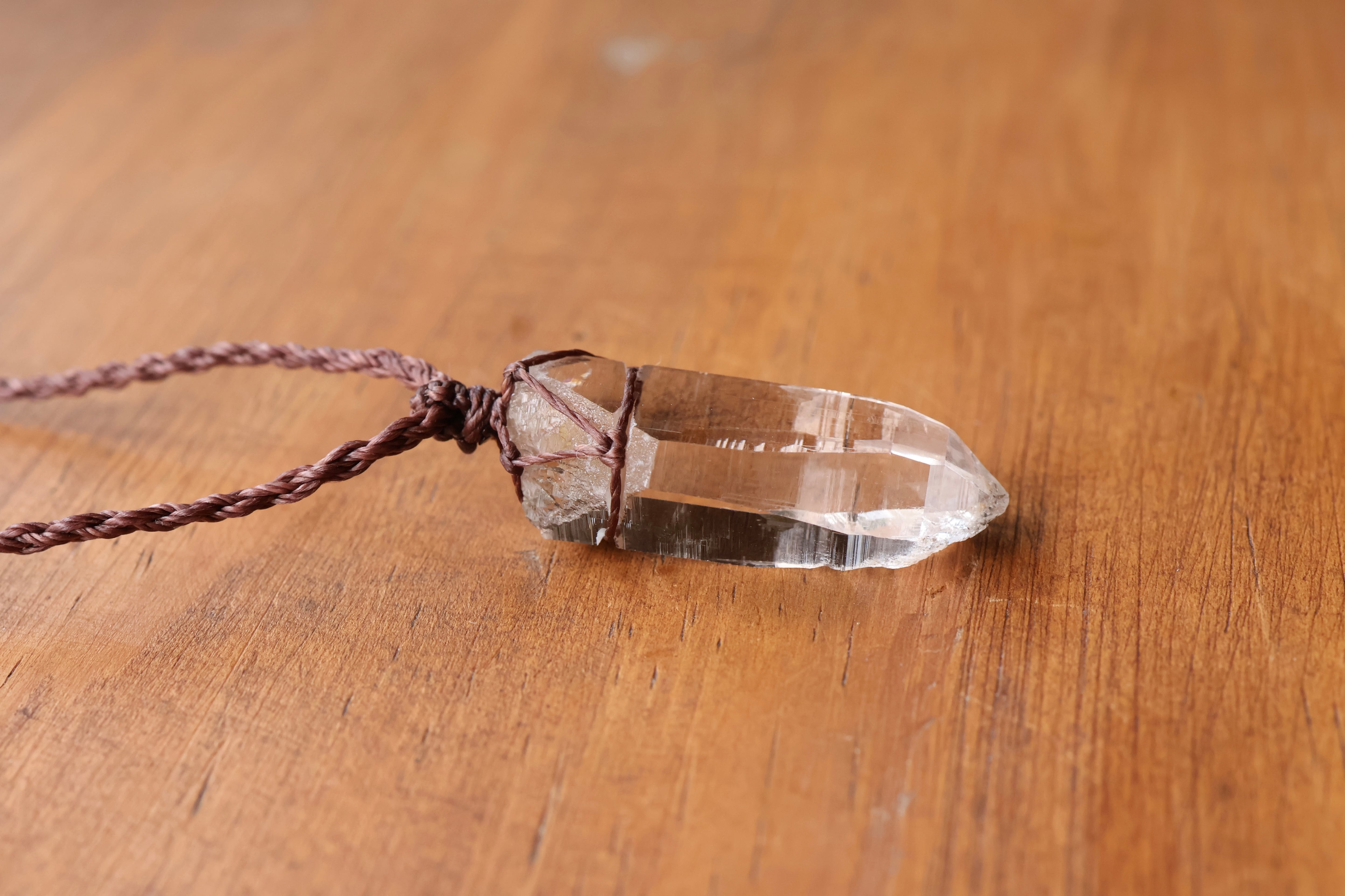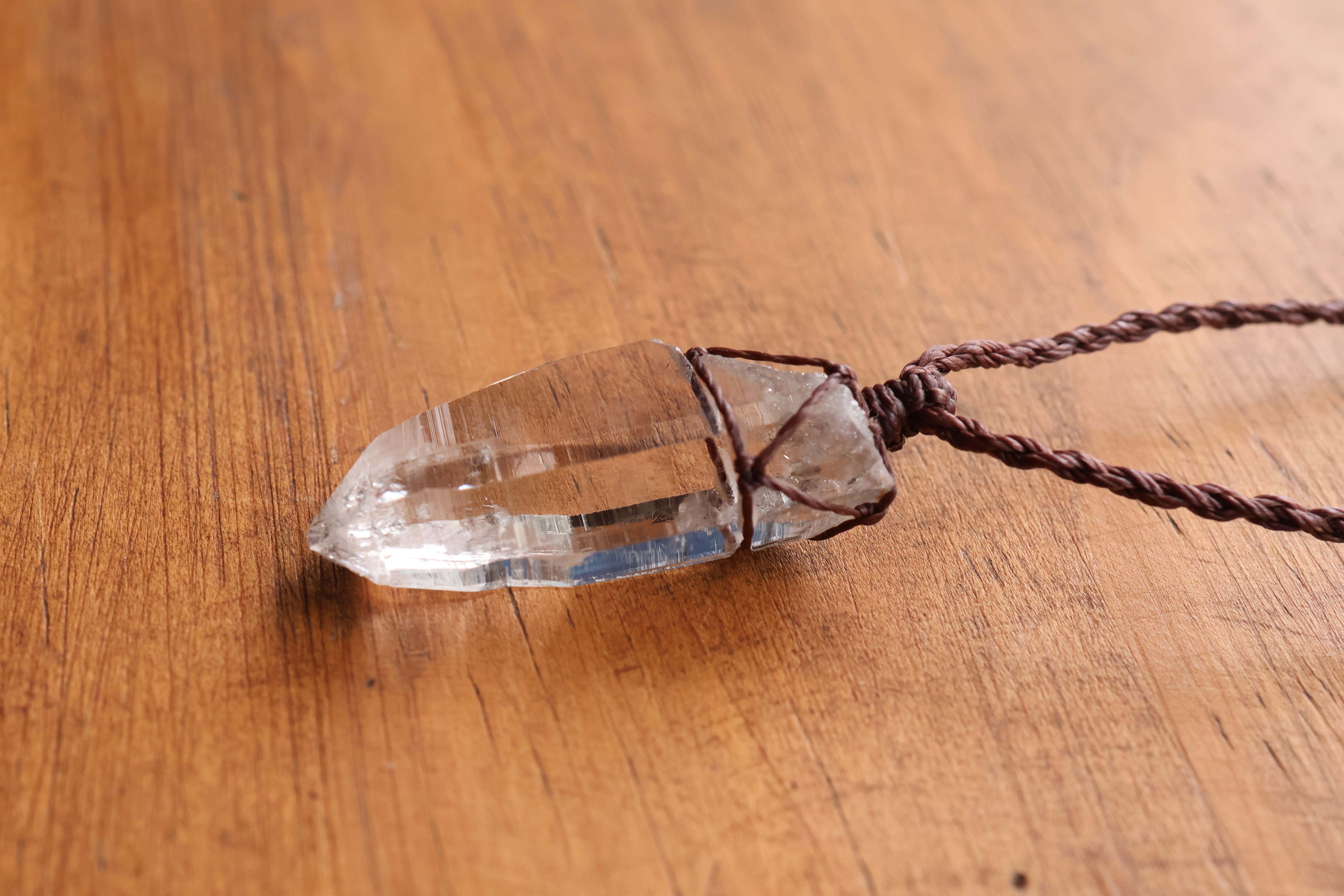 透き通る水の雫のような透明度が高いガネーシュヒマール産のヒマラヤ水晶をシンプルに編み、ペンダントに仕立てました。