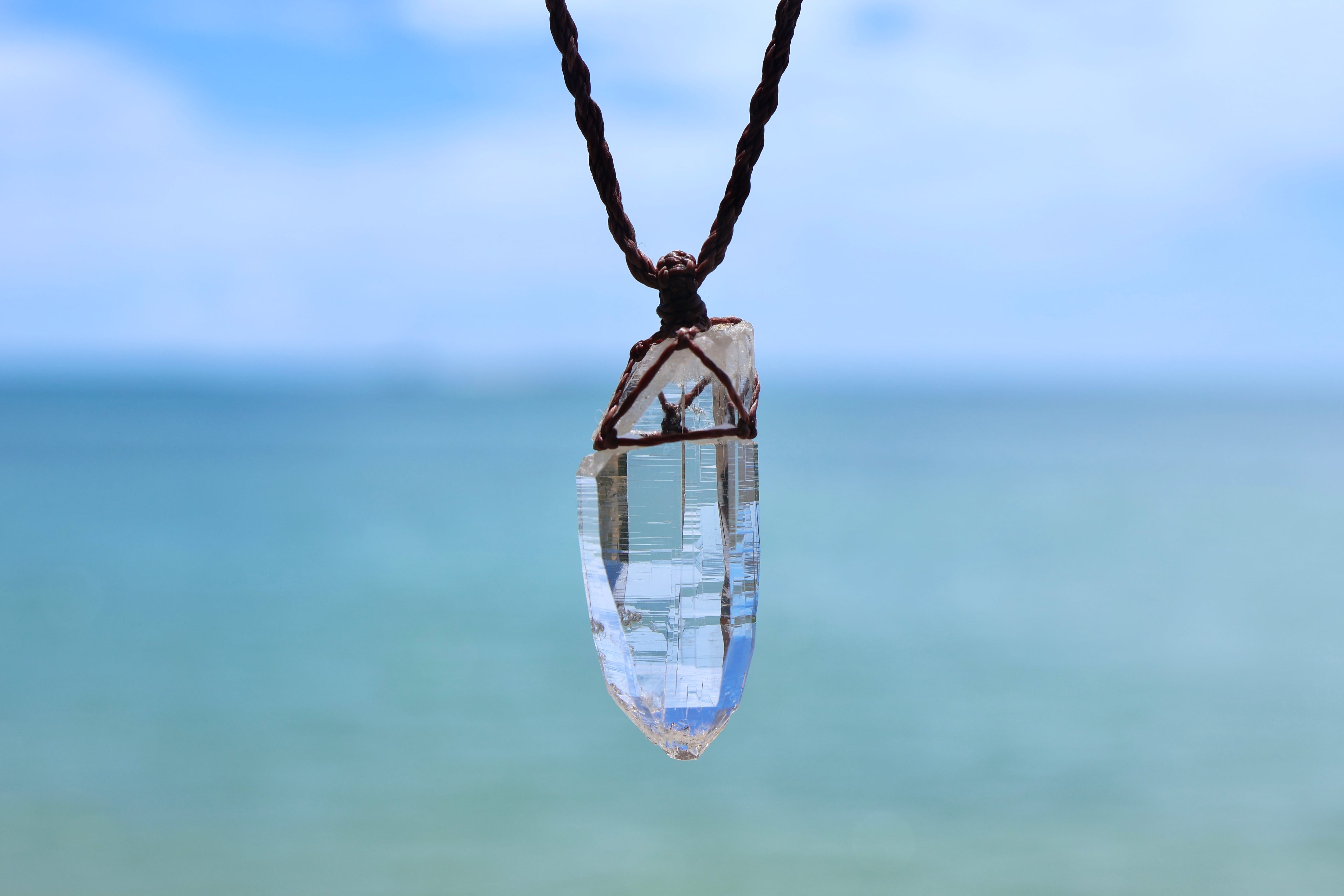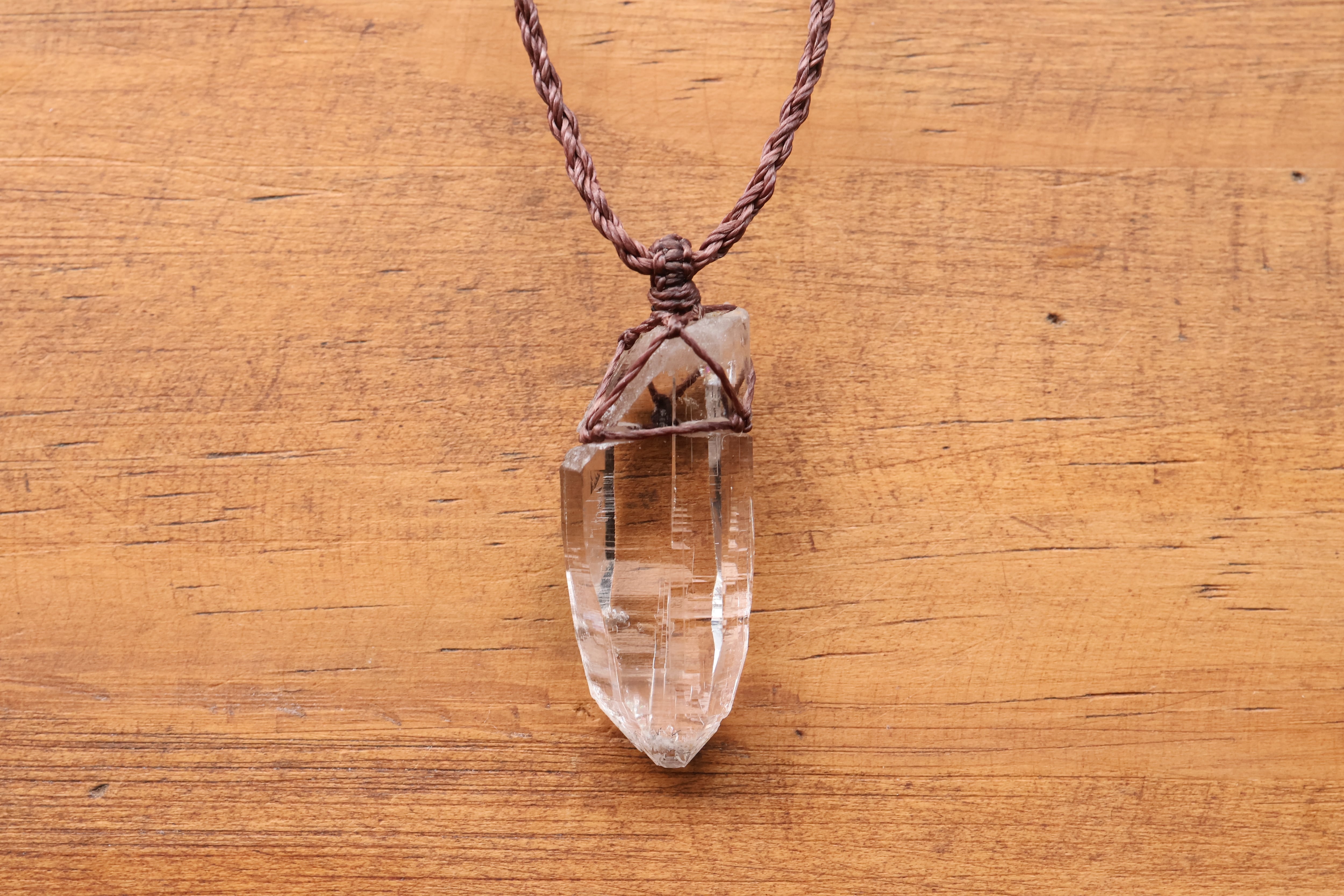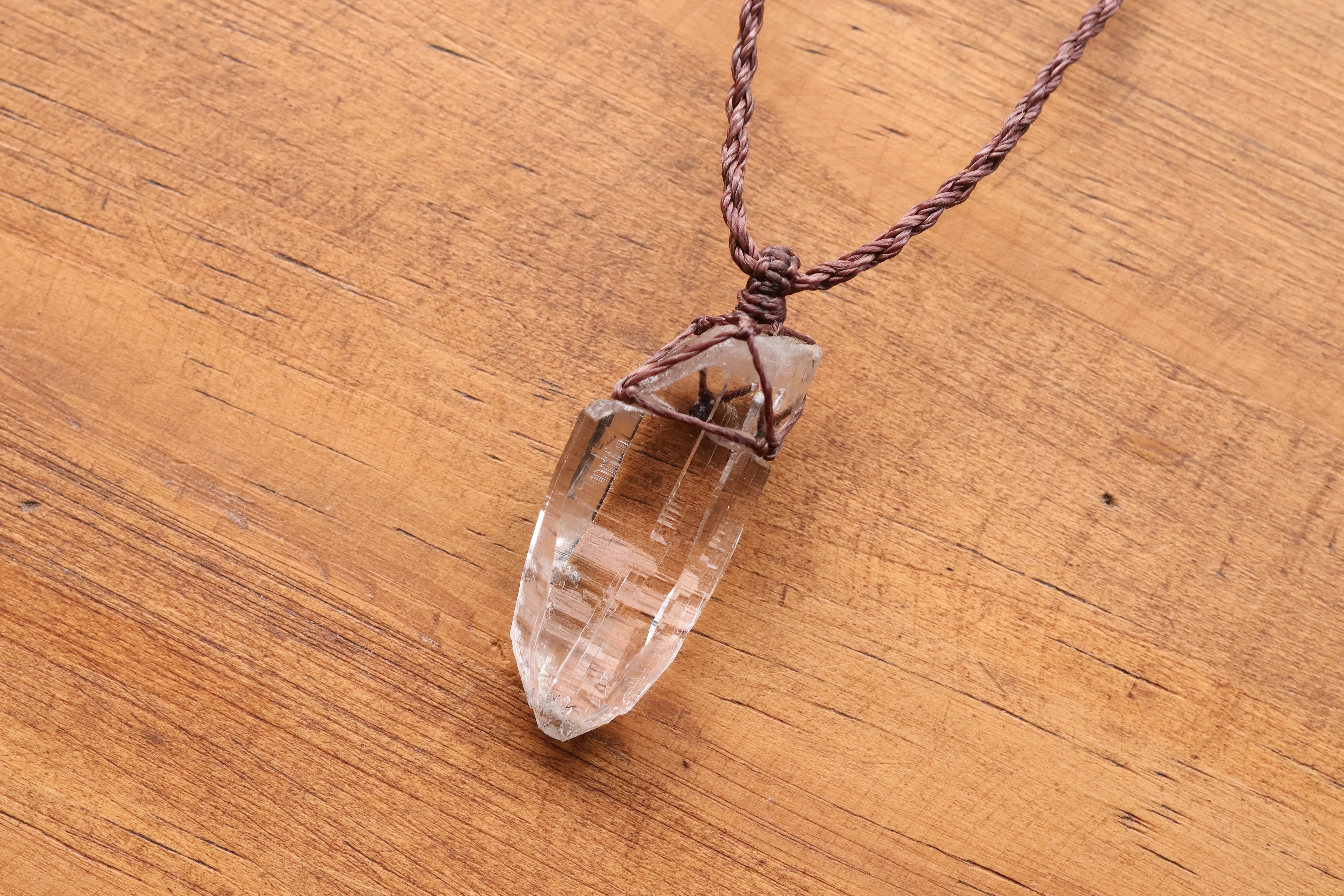 透き通る水の雫のような透明度が高いガネーシュヒマール産のヒマラヤ水晶をシンプルに編み、ペンダントに仕立てました。