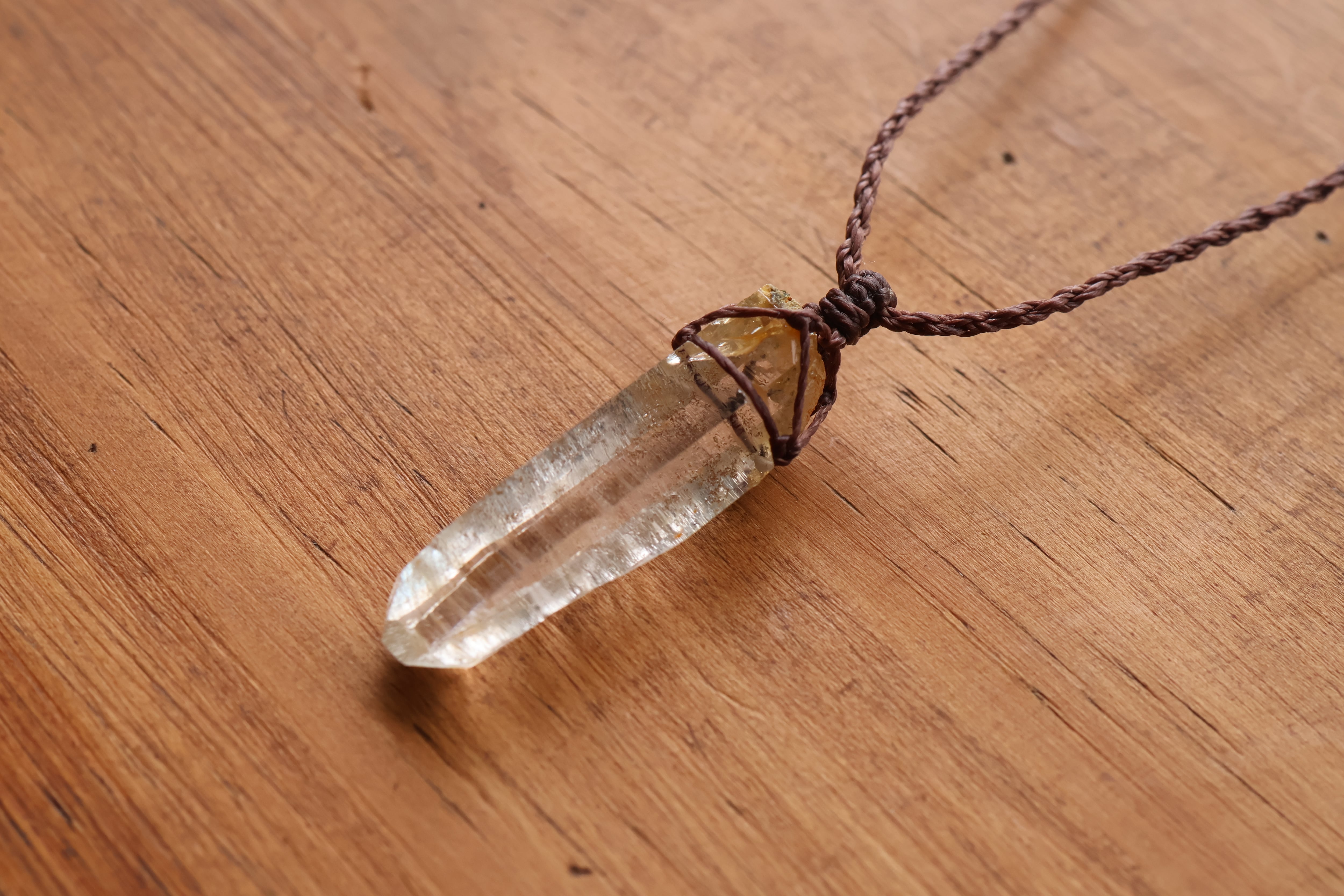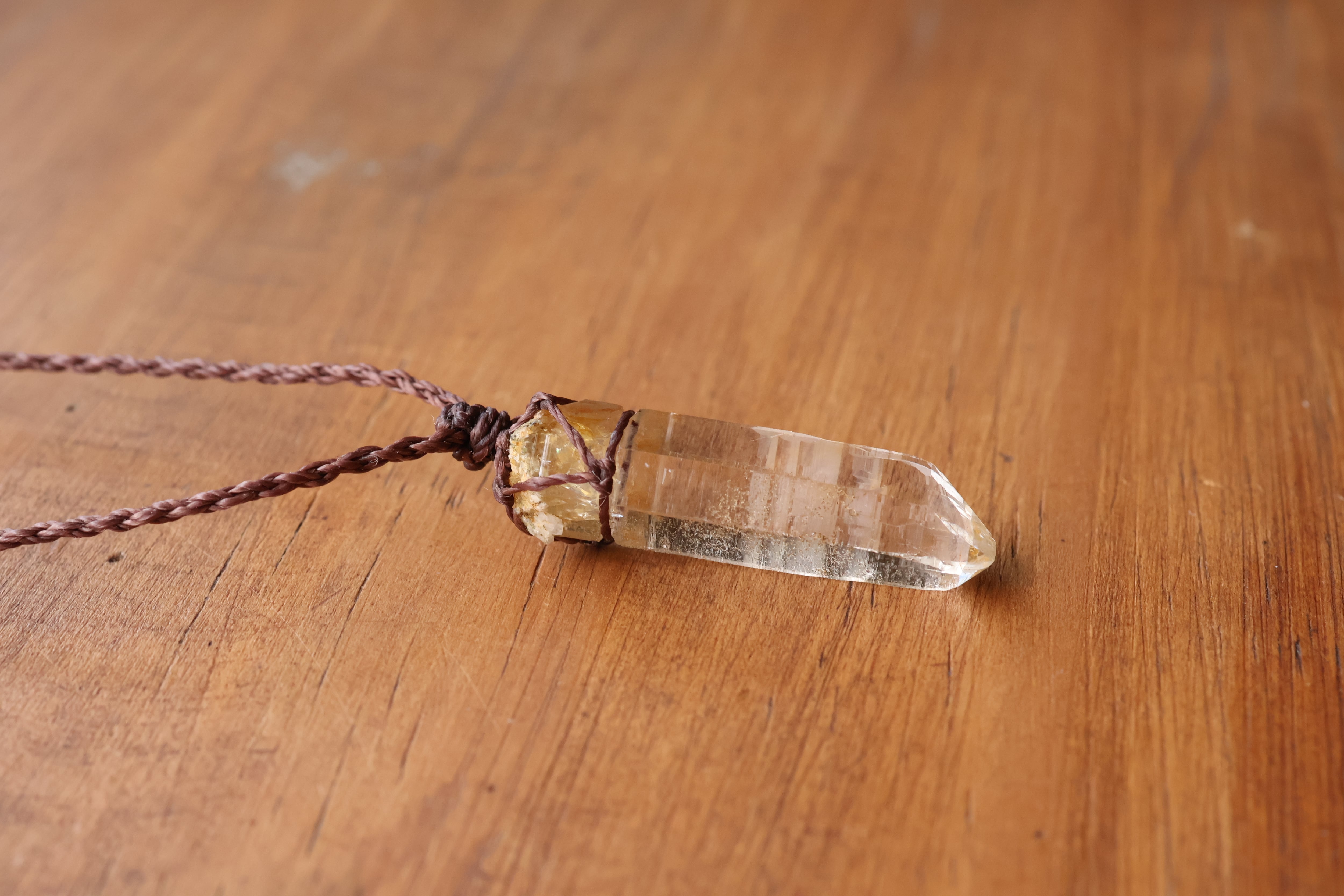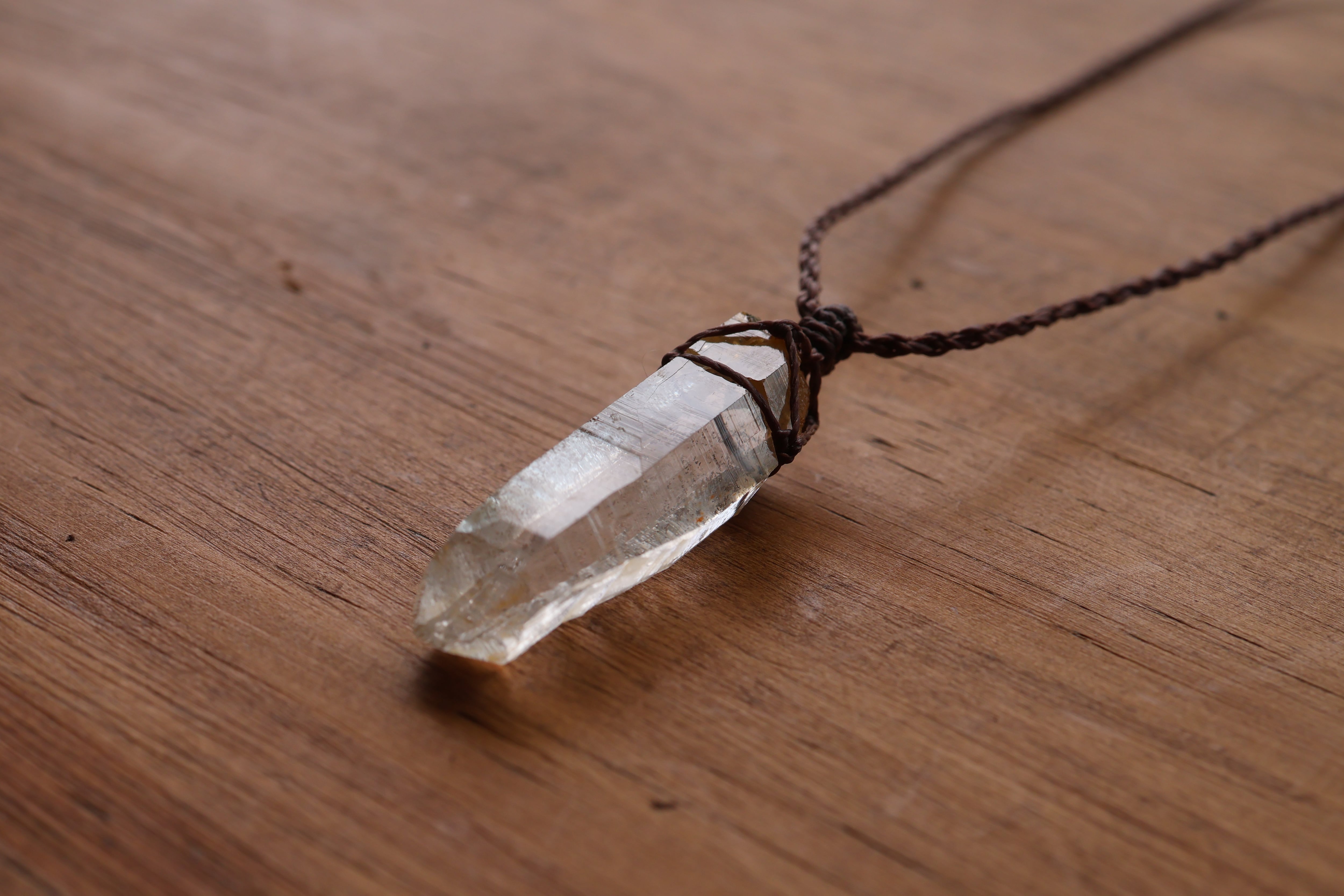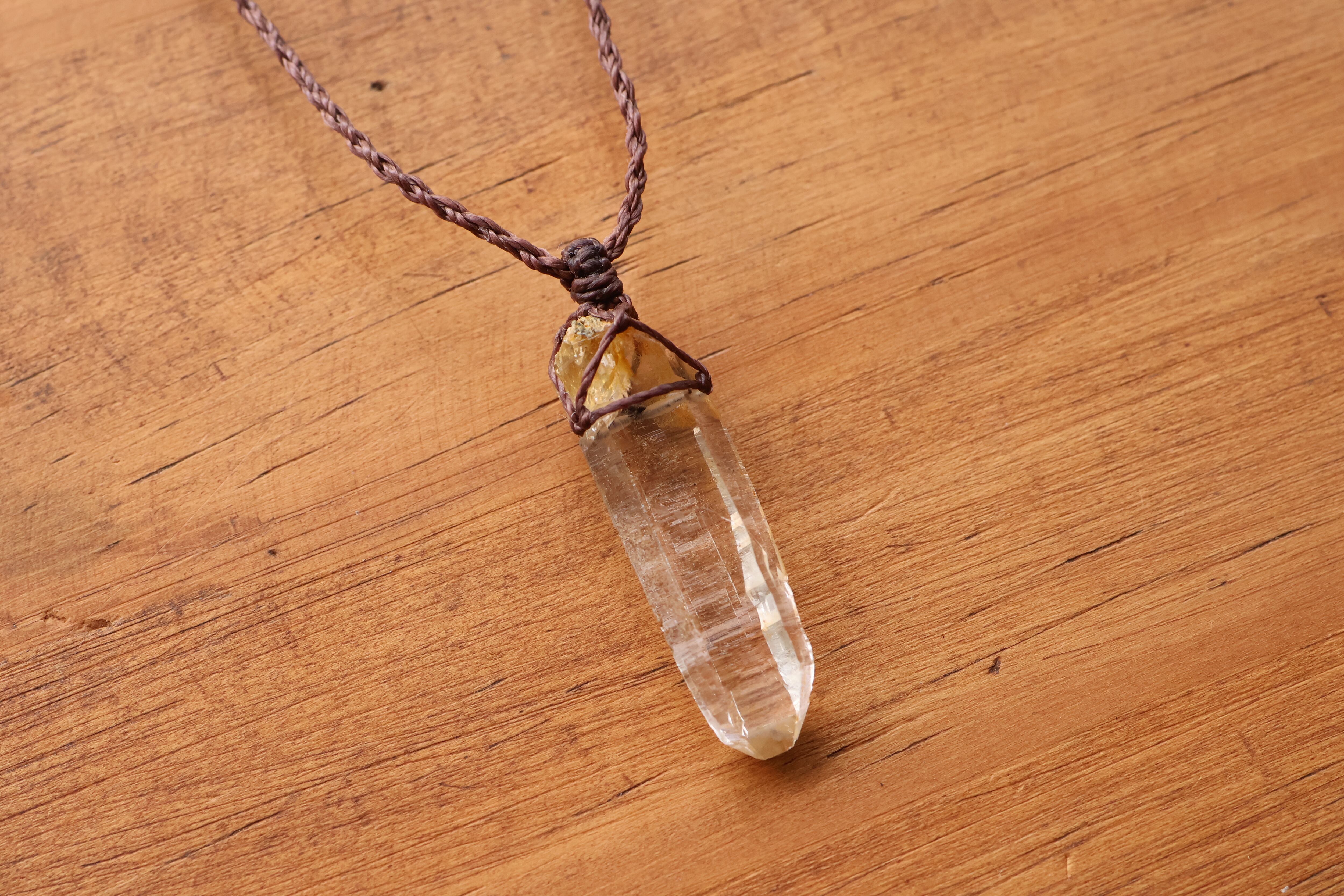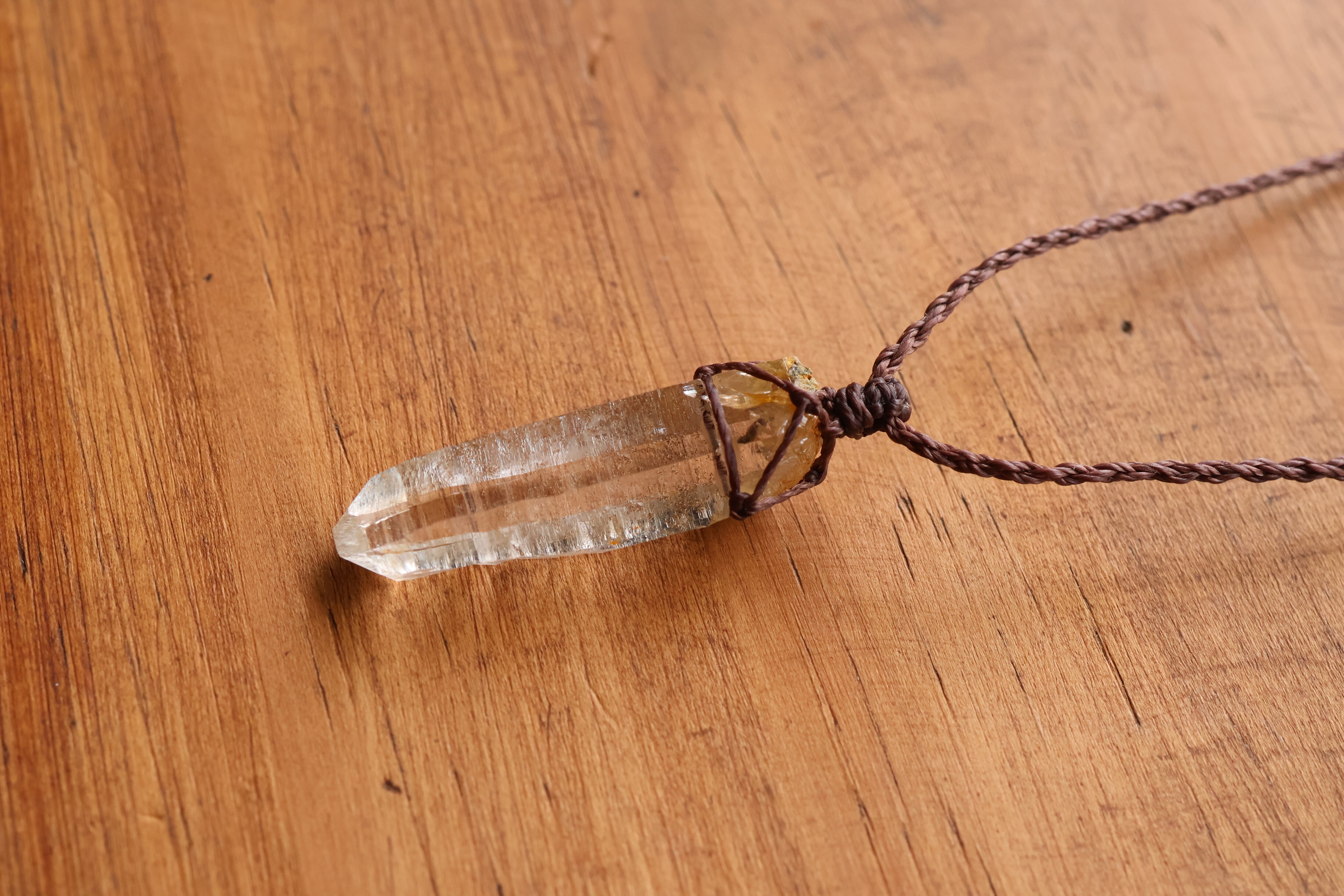 透き通る水の雫のような透明度が高いガネーシュヒマール産のヒマラヤ水晶をシンプルに編み、ペンダントに仕立てました。