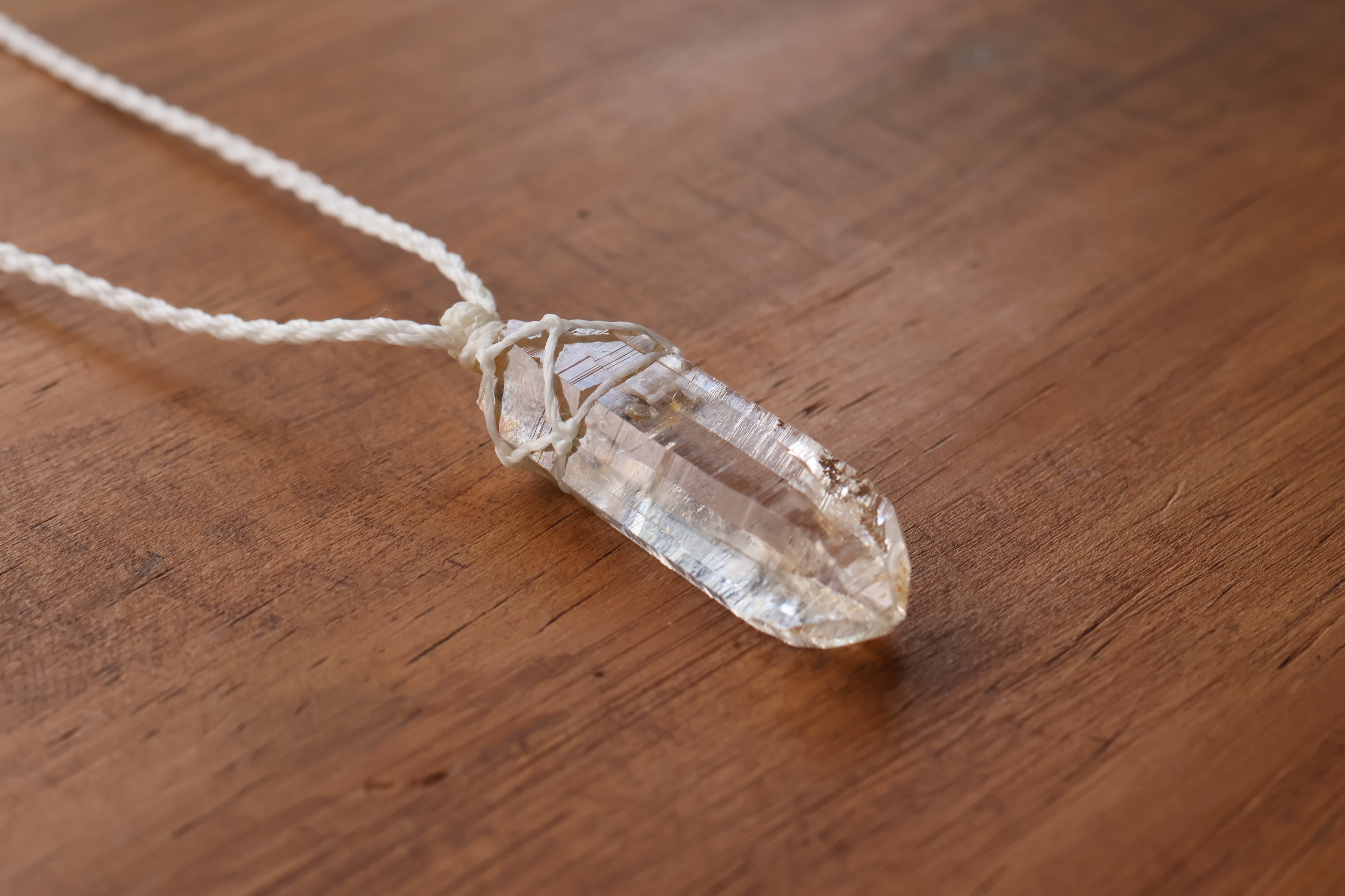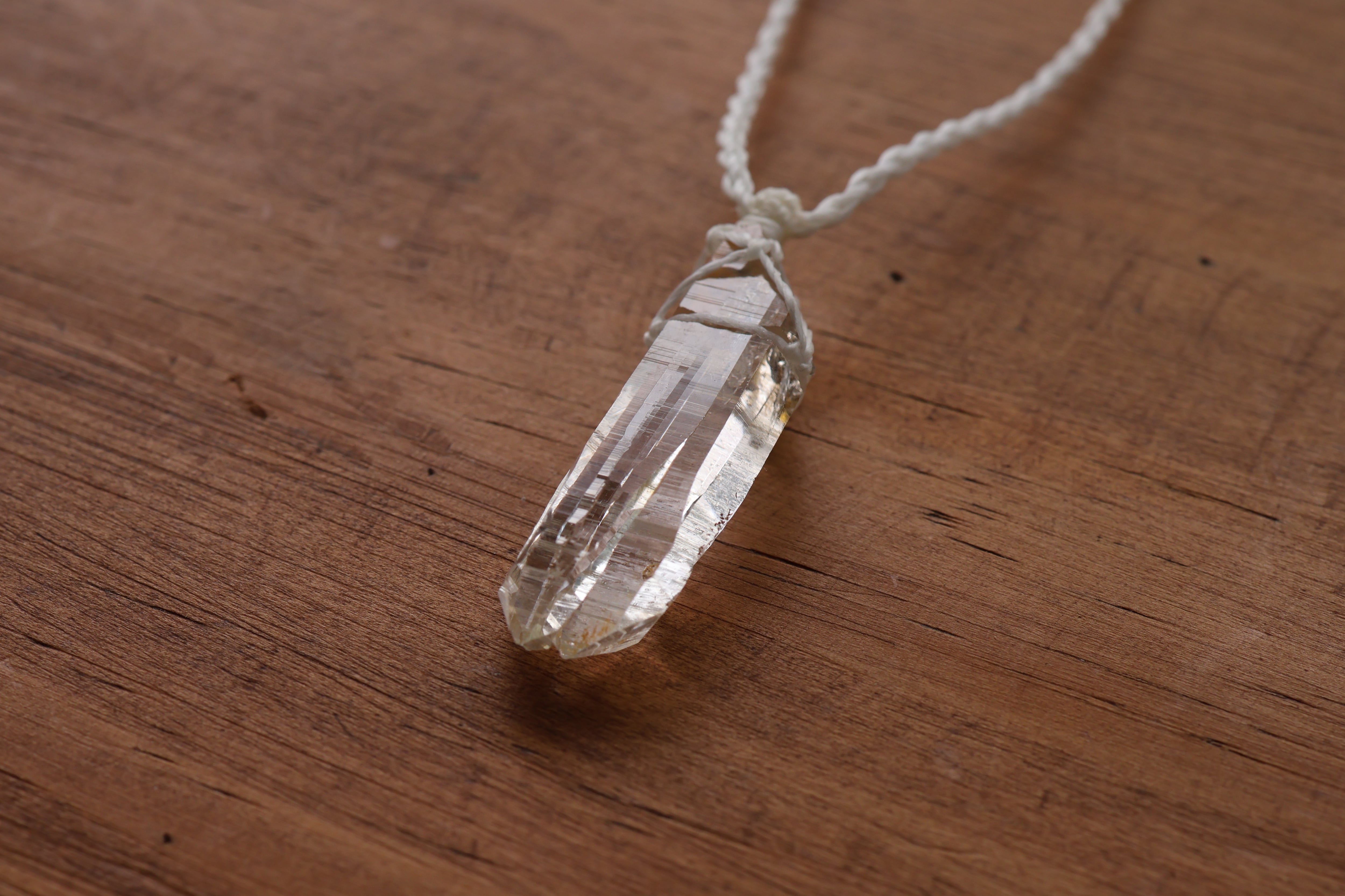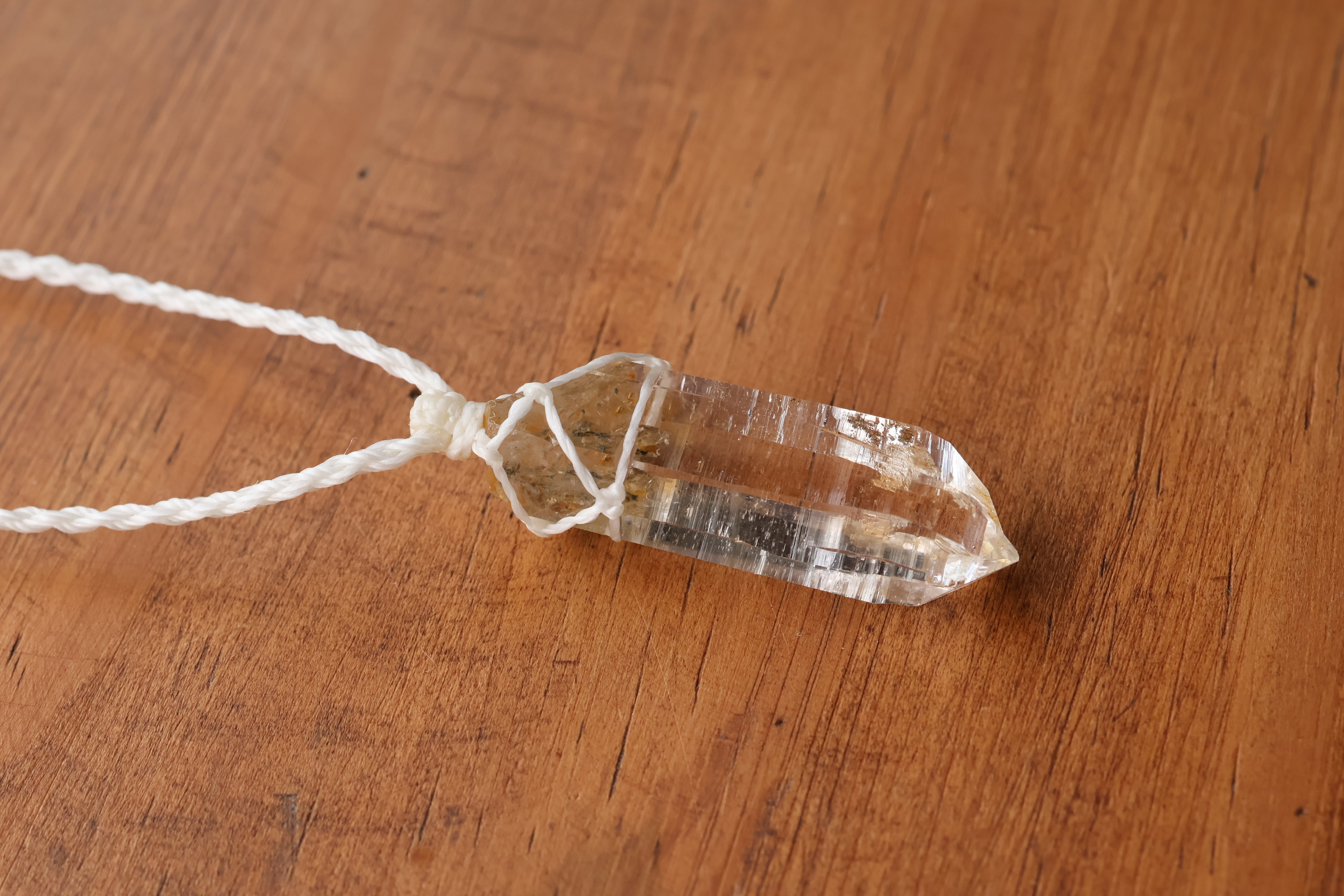 透き通る水の雫のような透明度が高いガネーシュヒマール産のヒマラヤ水晶をシンプルに編み、ペンダントに仕立てました。