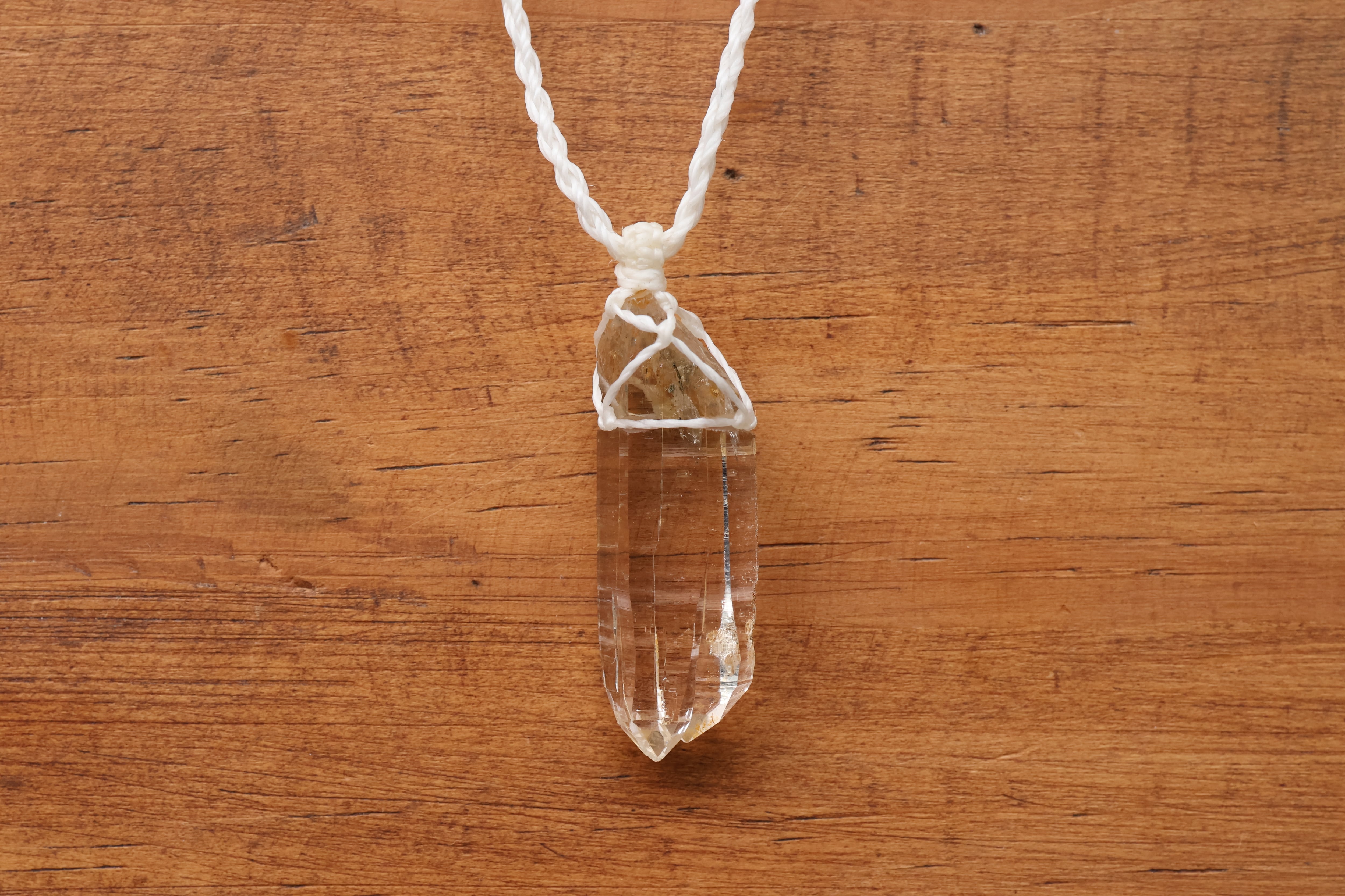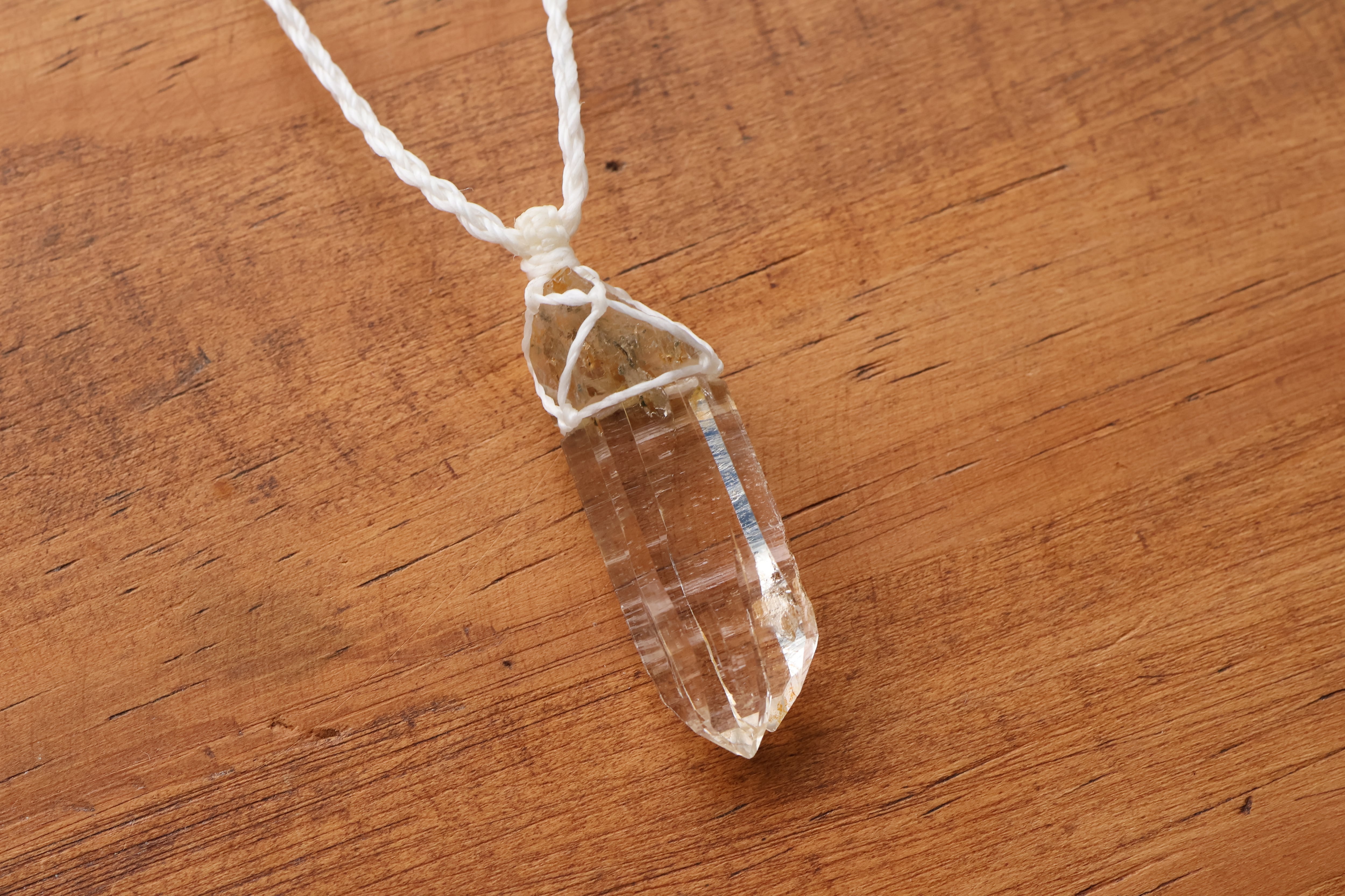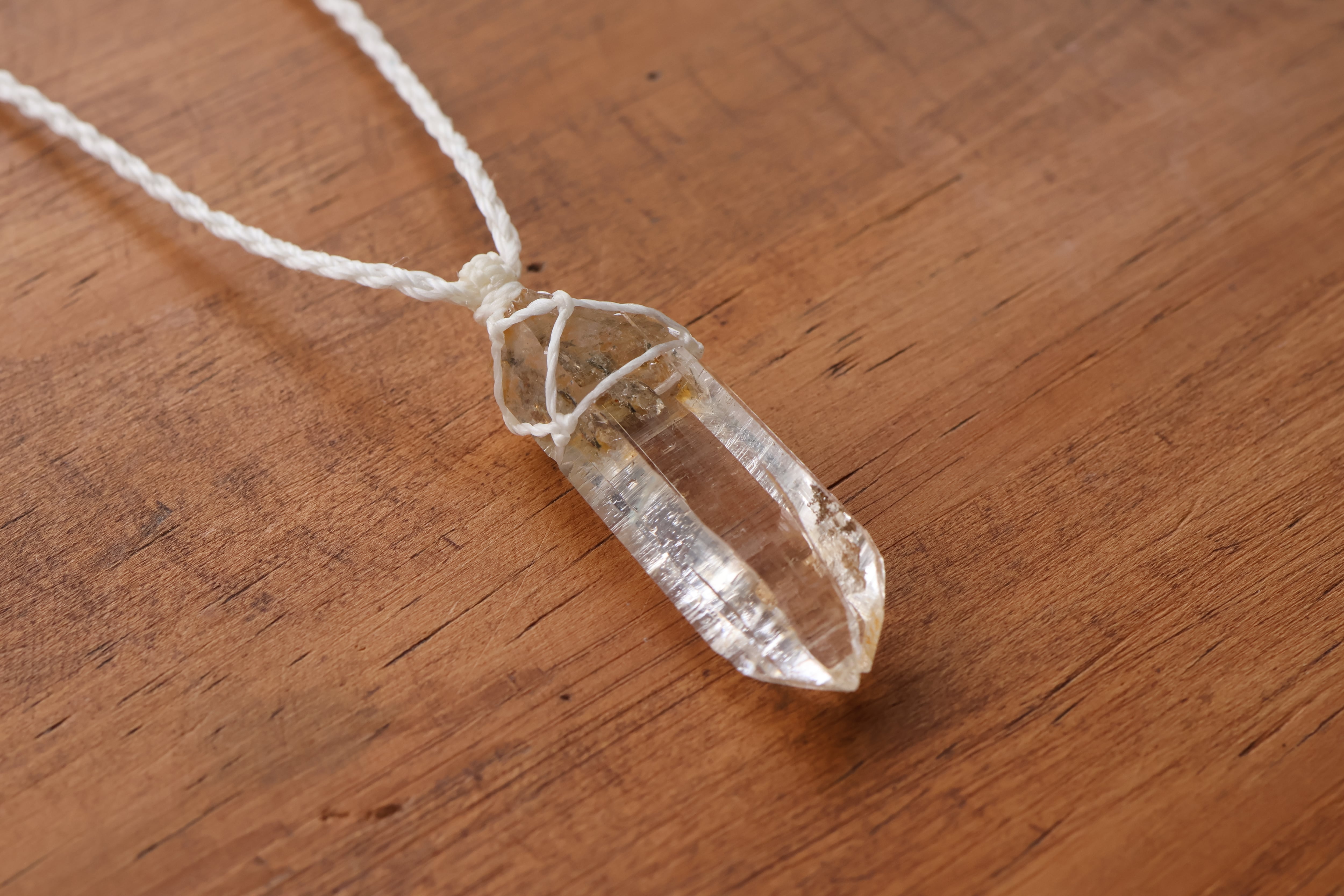 透き通る水の雫のような透明度が高いガネーシュヒマール産のヒマラヤ水晶をシンプルに編み、ペンダントに仕立てました。
