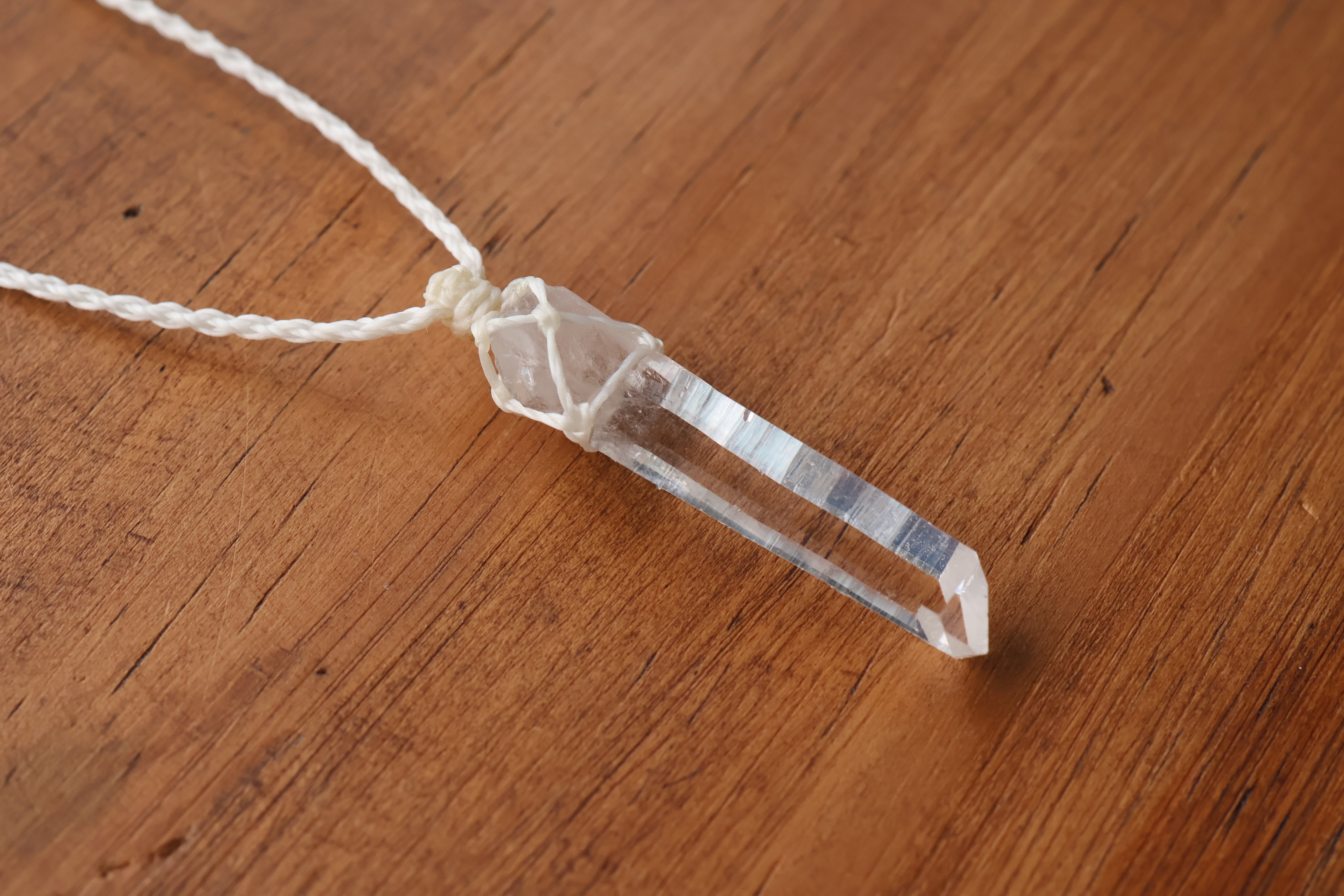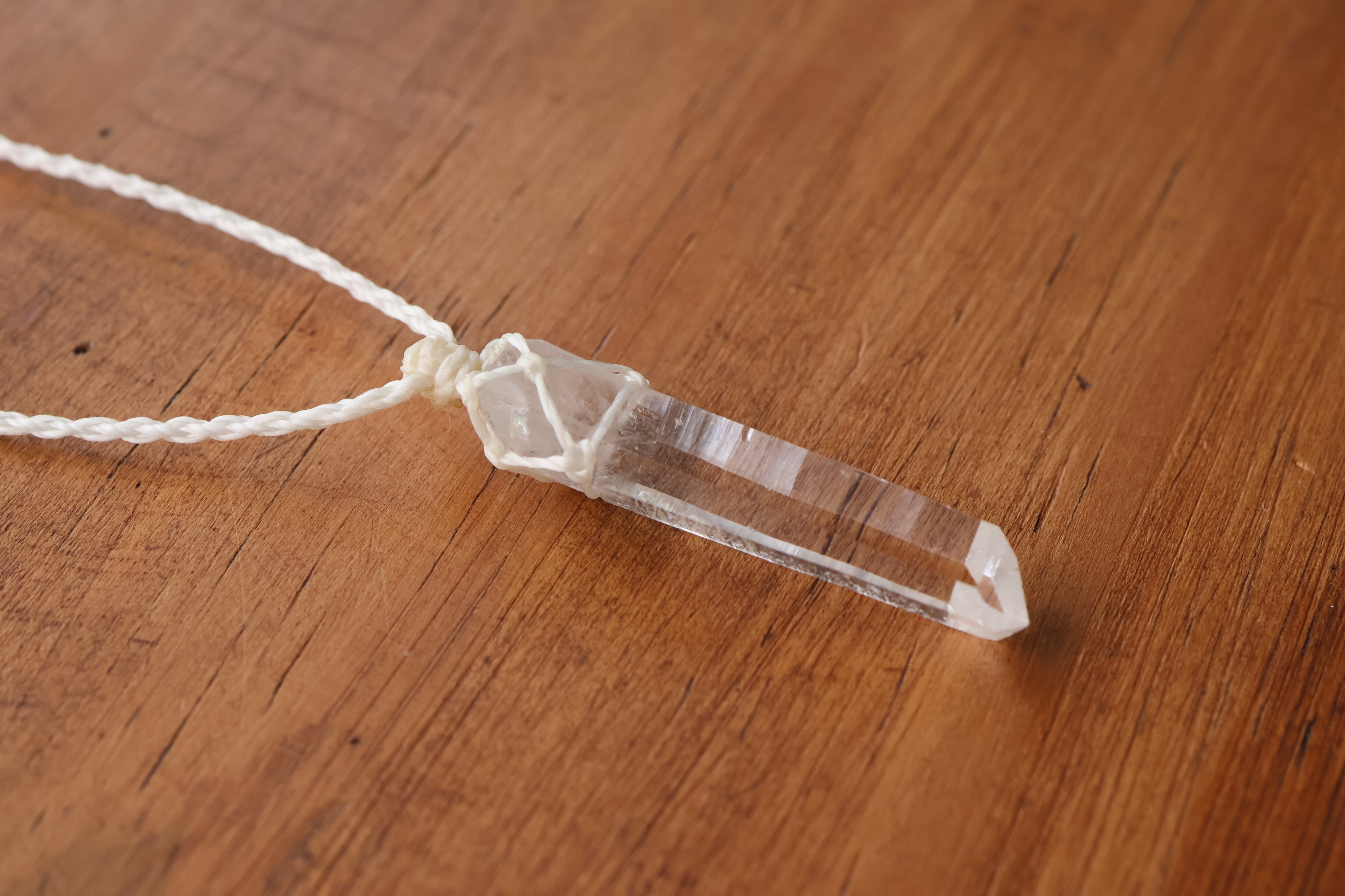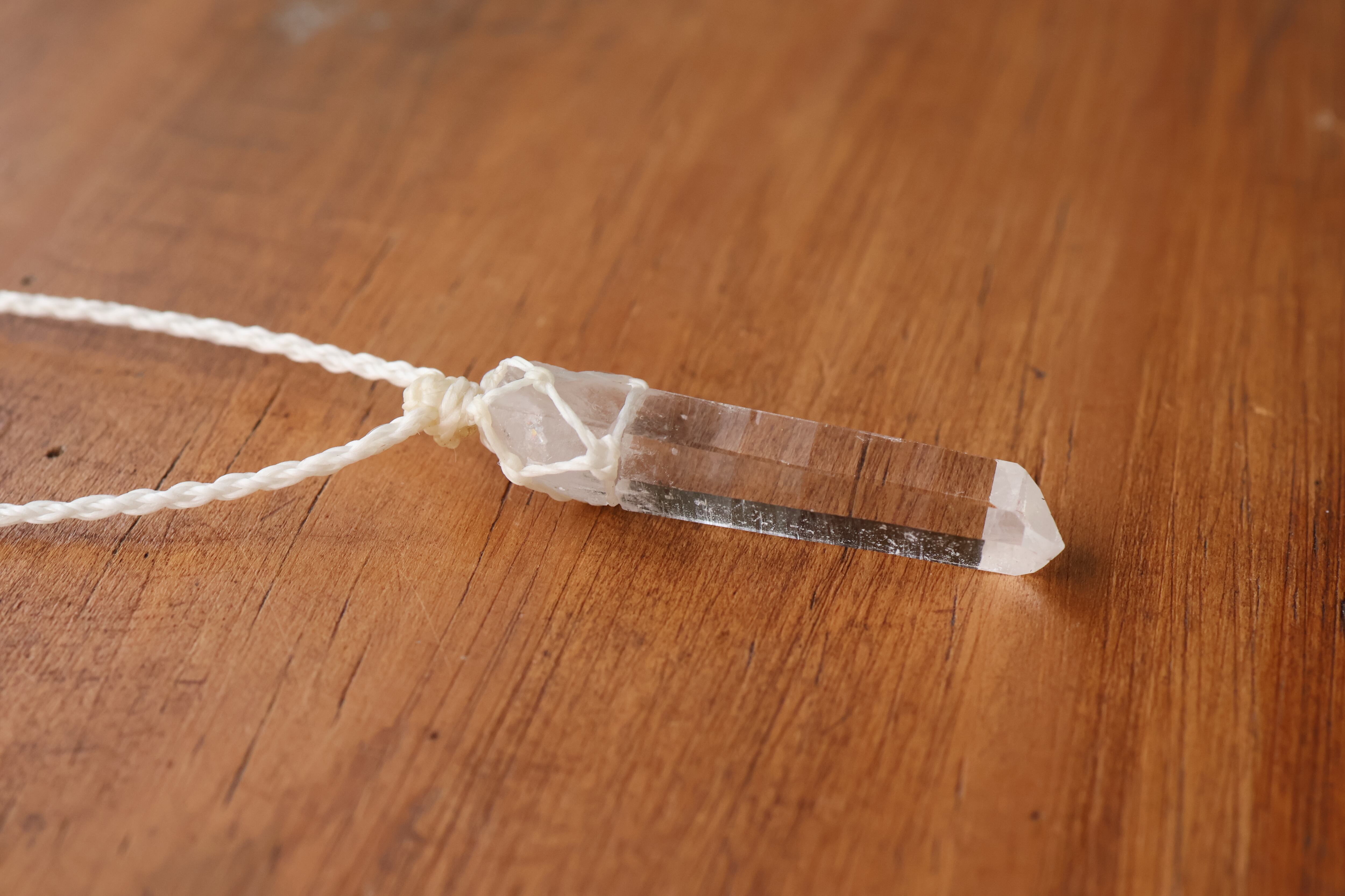 透き通る水の雫のような透明度が高いマカルー産のヒマラヤ水晶をシンプルに編み、ペンダントに仕立てました。
