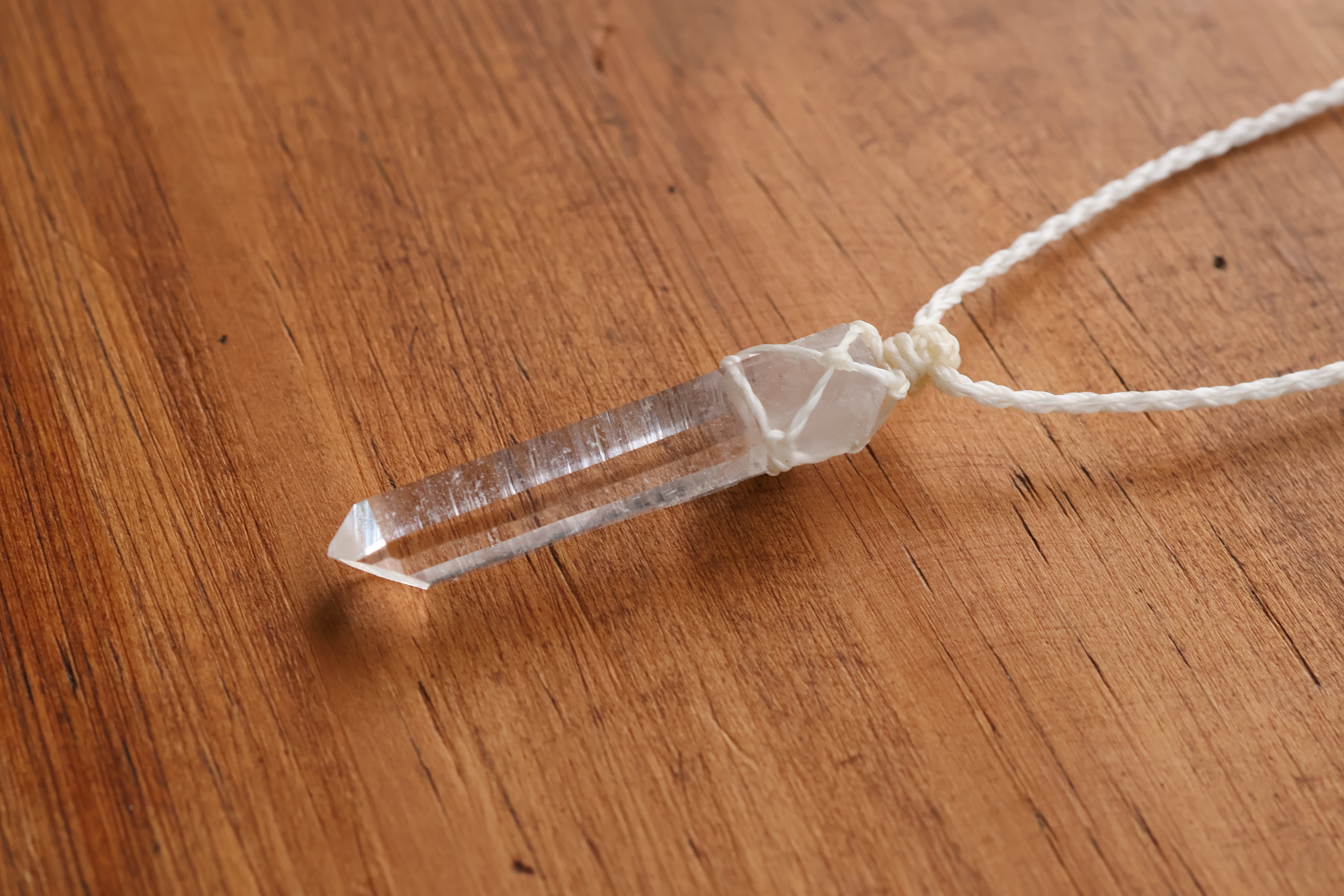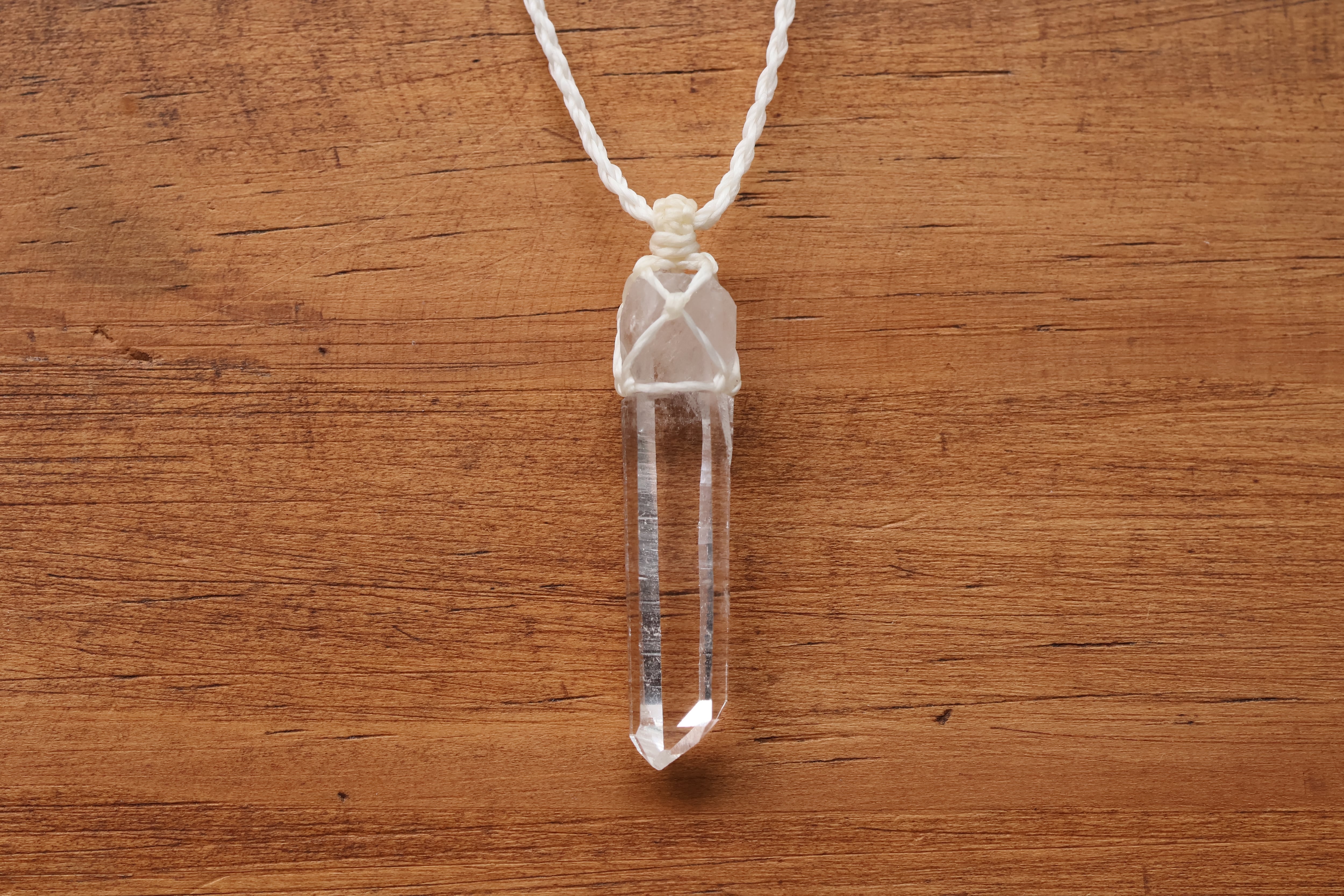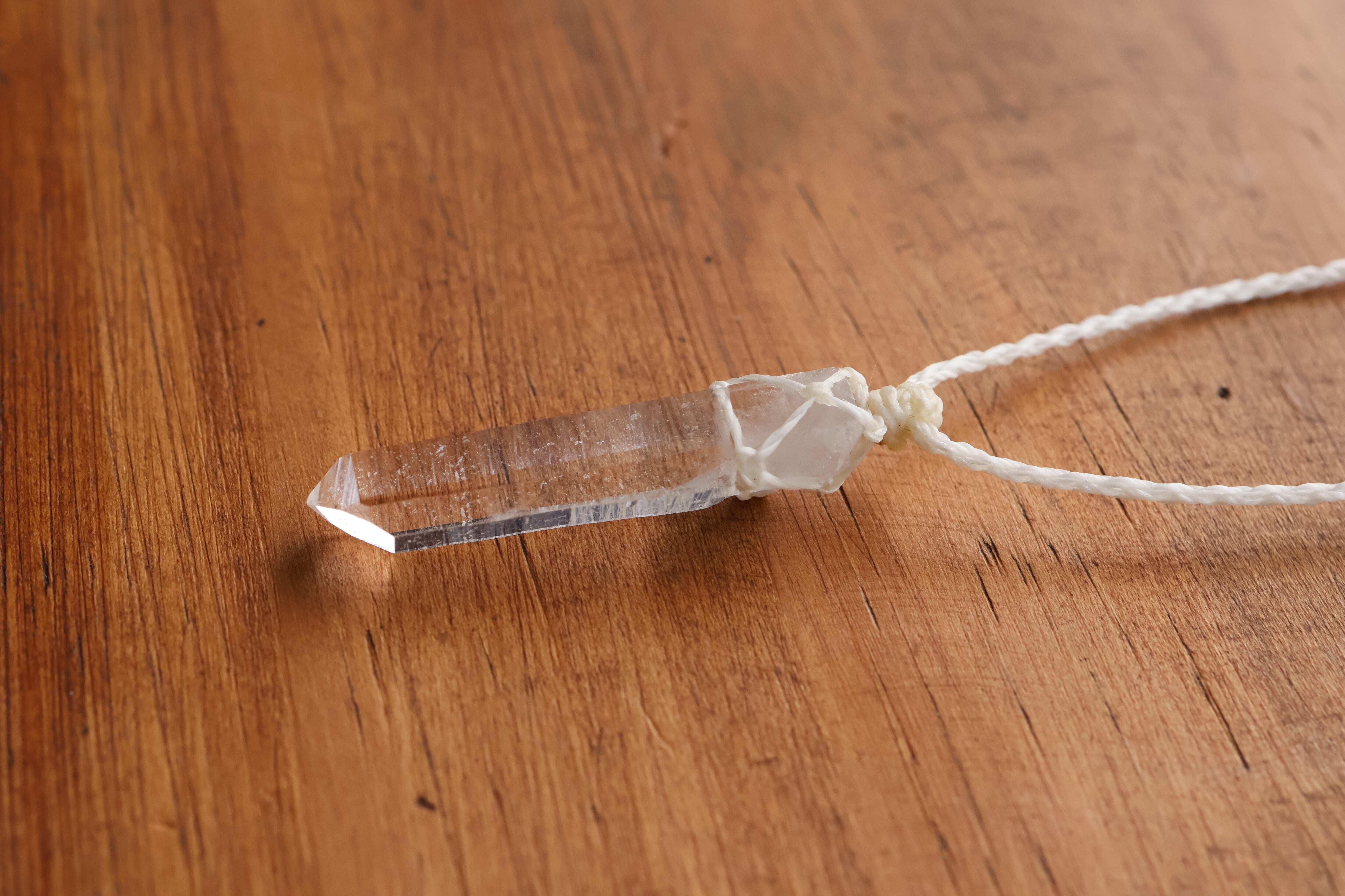透き通る水の雫のような透明度が高いマカルー産のヒマラヤ水晶をシンプルに編み、ペンダントに仕立てました。