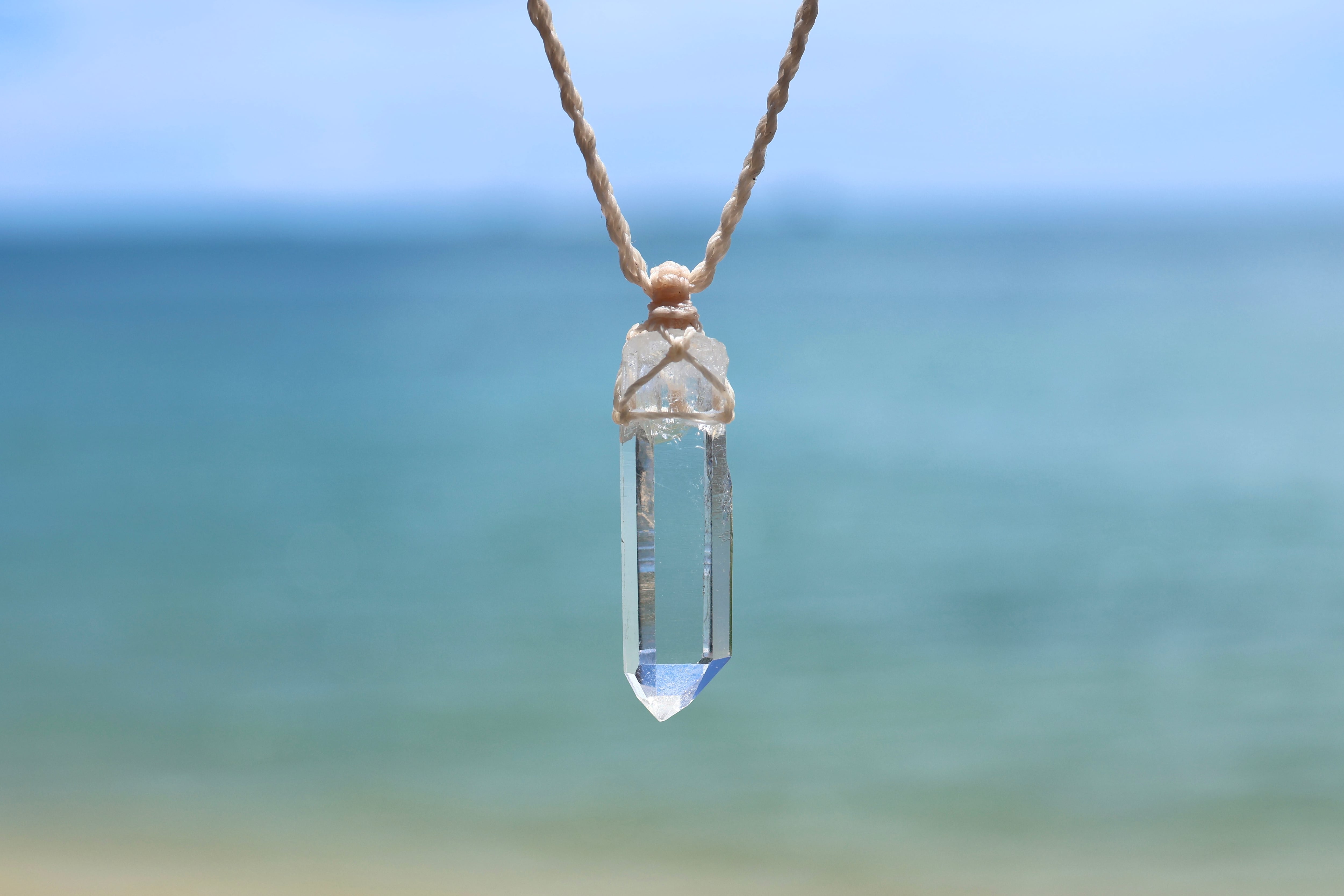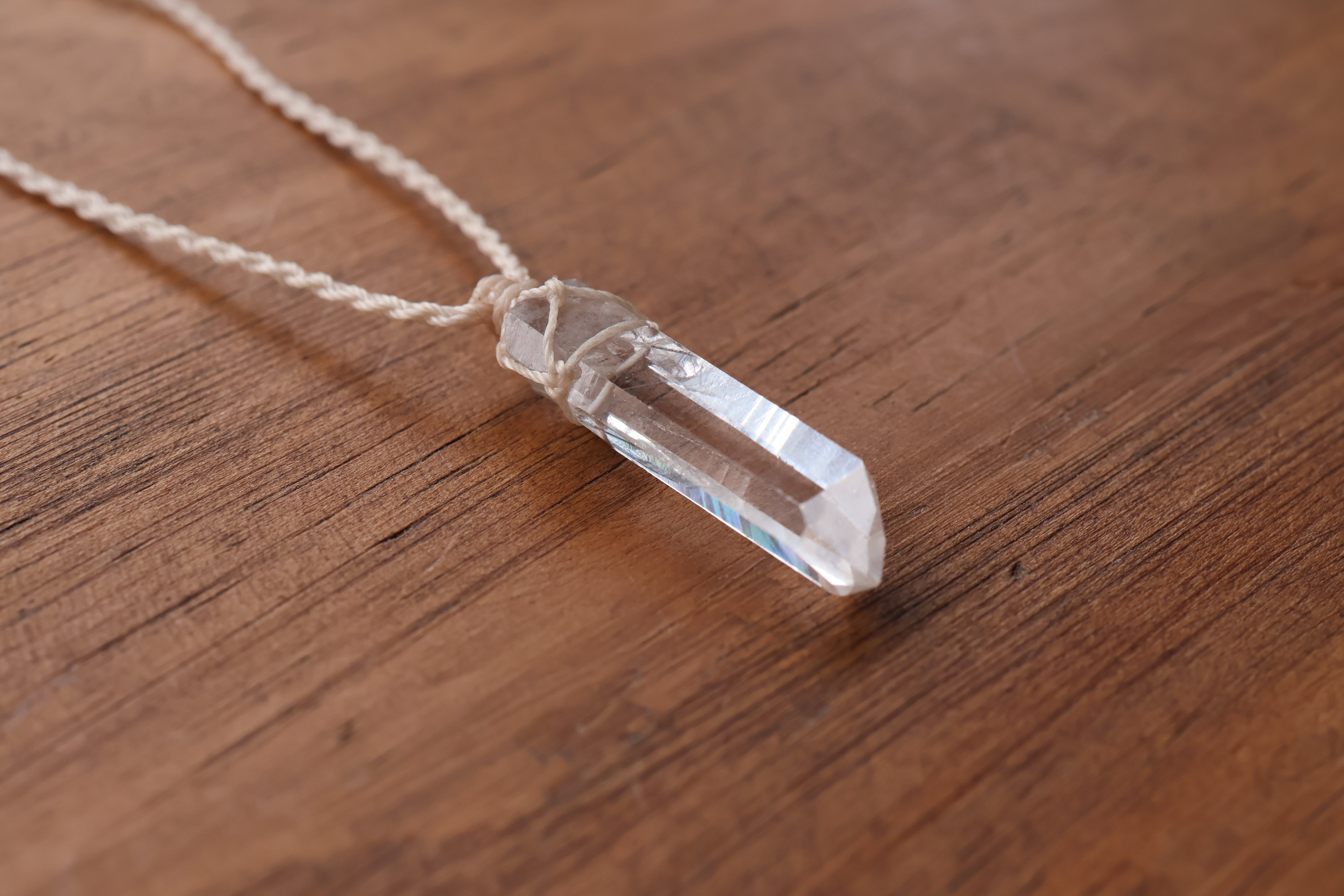 透き通る水の雫のような透明度が高いマカルー産のヒマラヤ水晶をシンプルに編み、ペンダントに仕立てました。