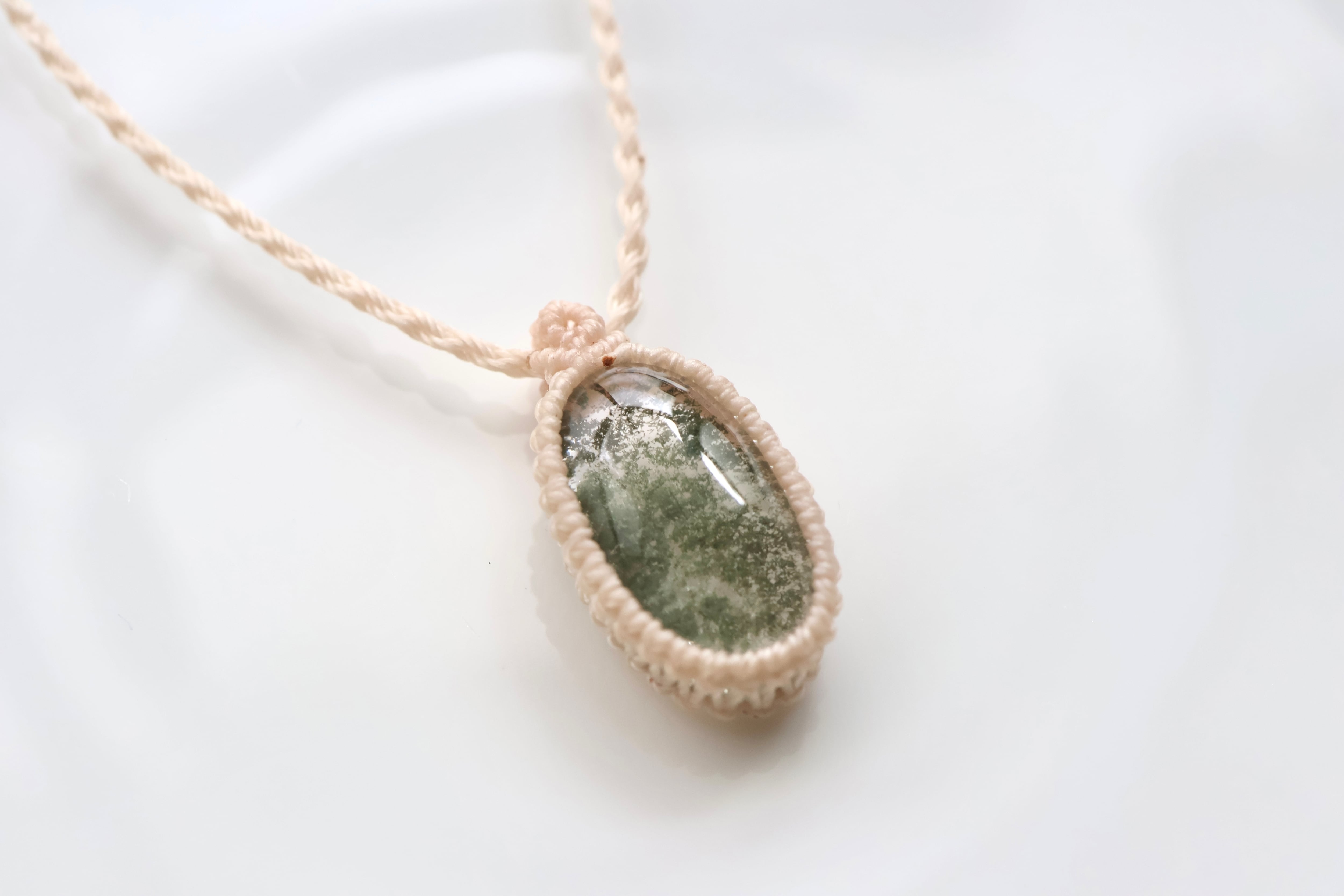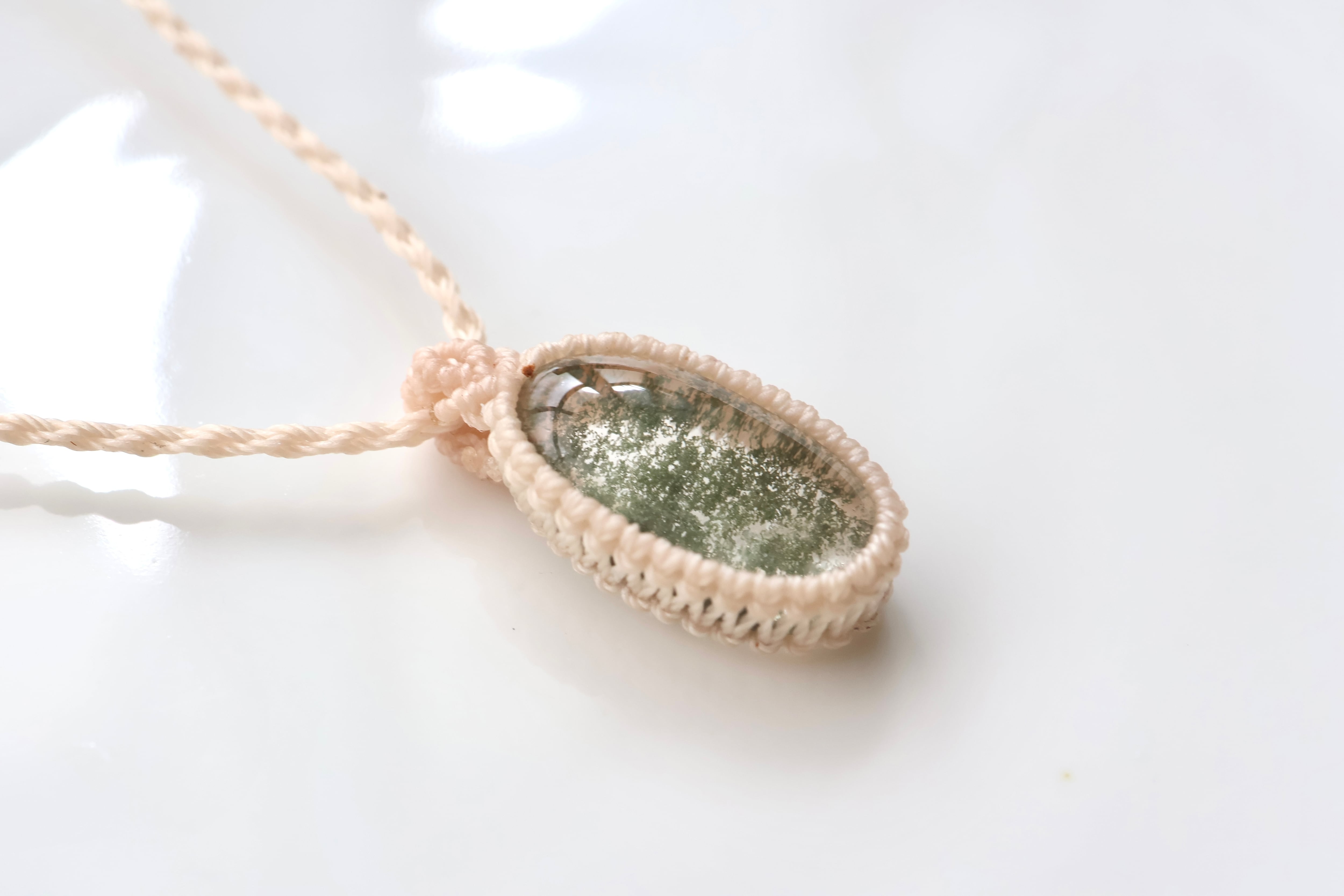 透き通る水の雫のような透明度が高いガネーシュヒマール産のヒマラヤ水晶をシンプルに編み、ペンダントに仕立てました。