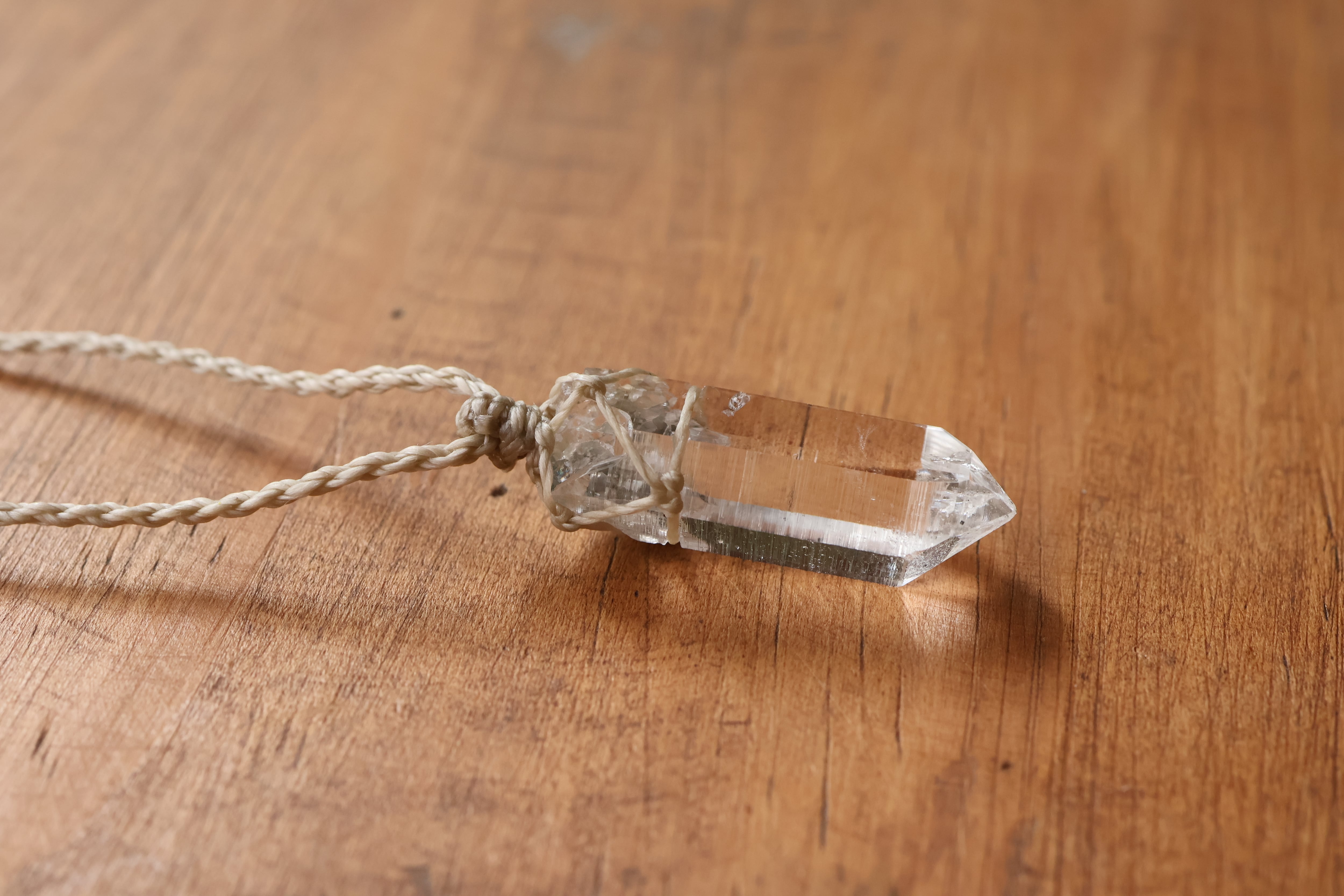 透き通る水の雫のような透明度が高いマニハール産のヒマラヤ水晶をシンプルに編み、ペンダントに仕立てました。