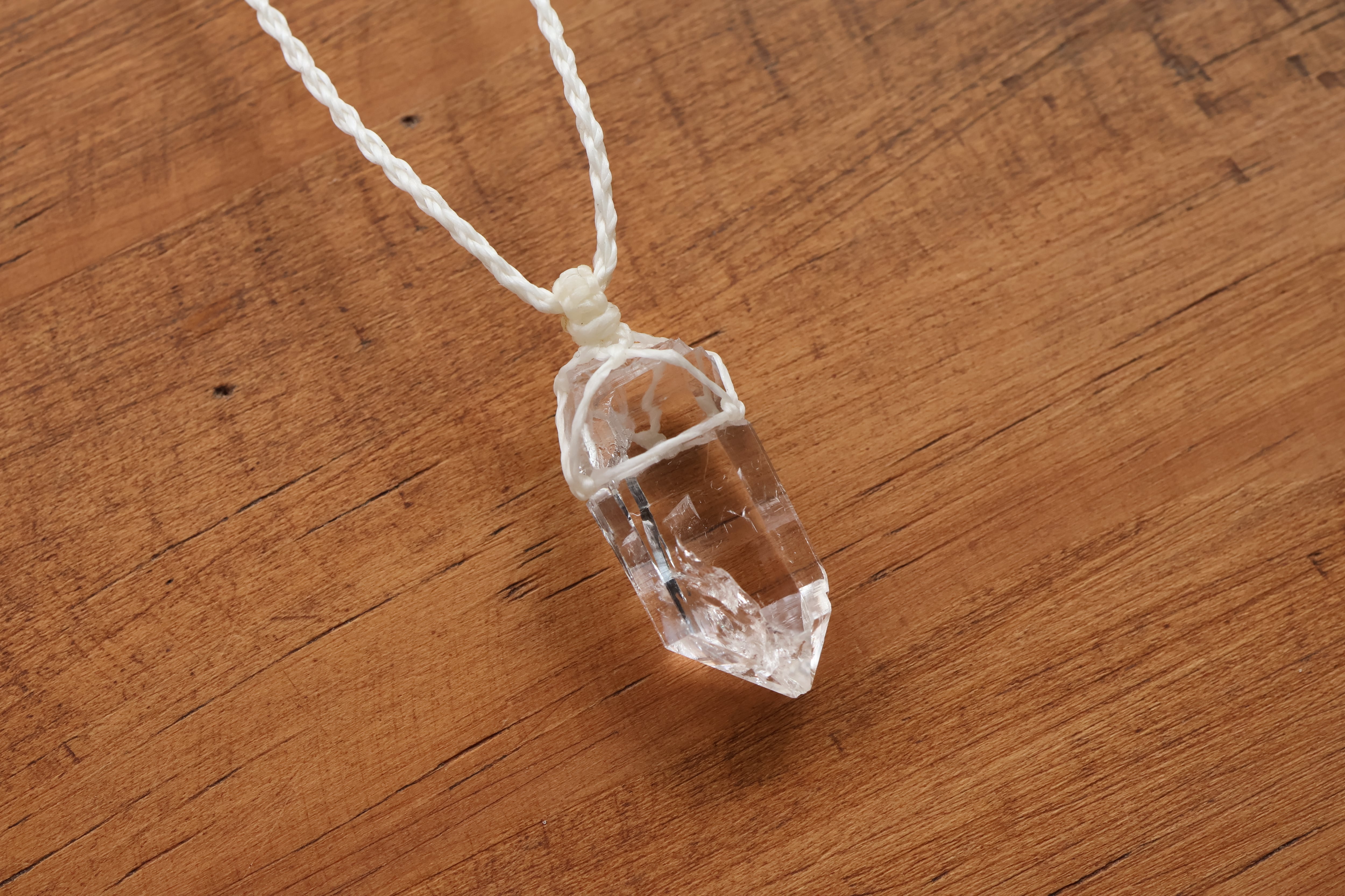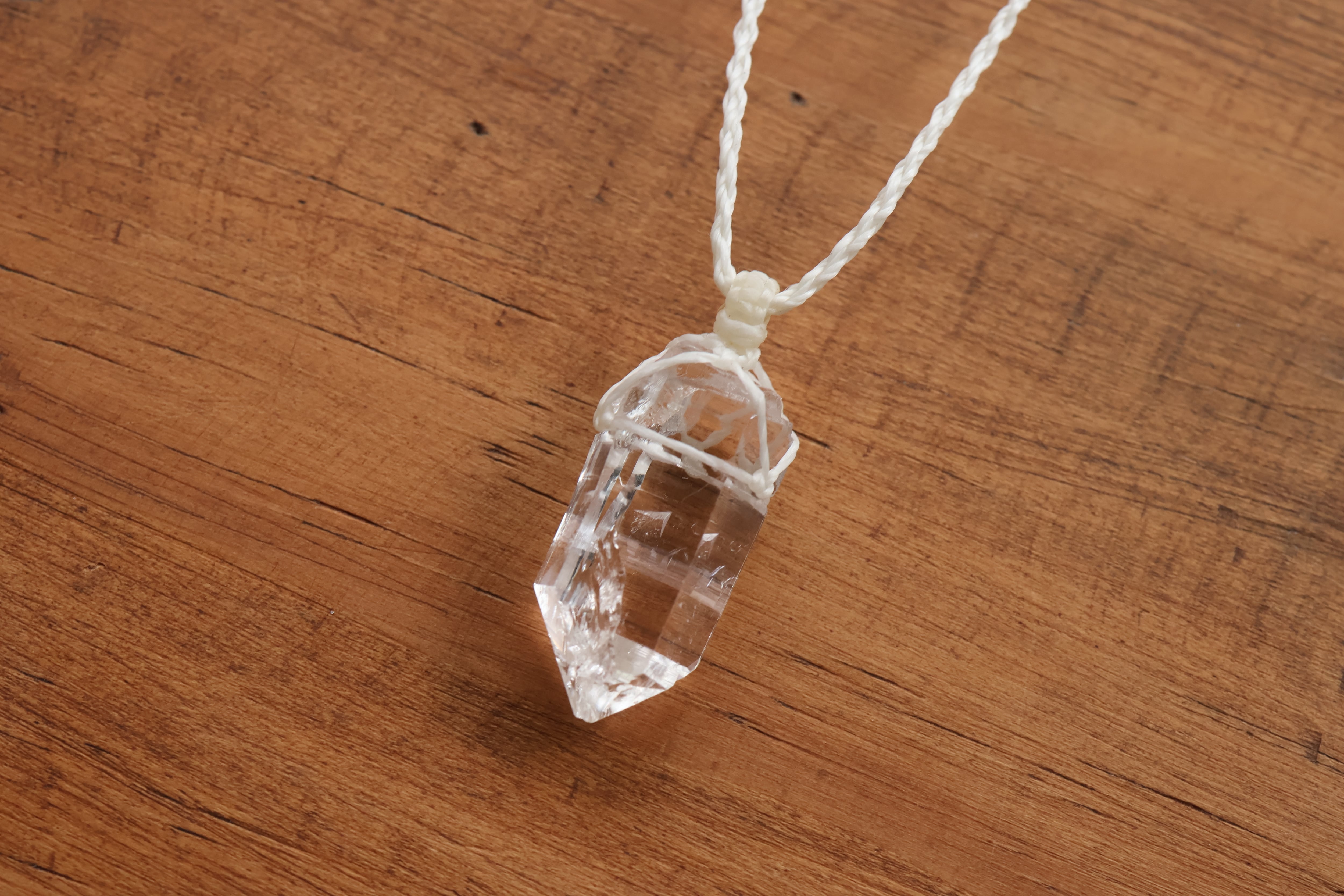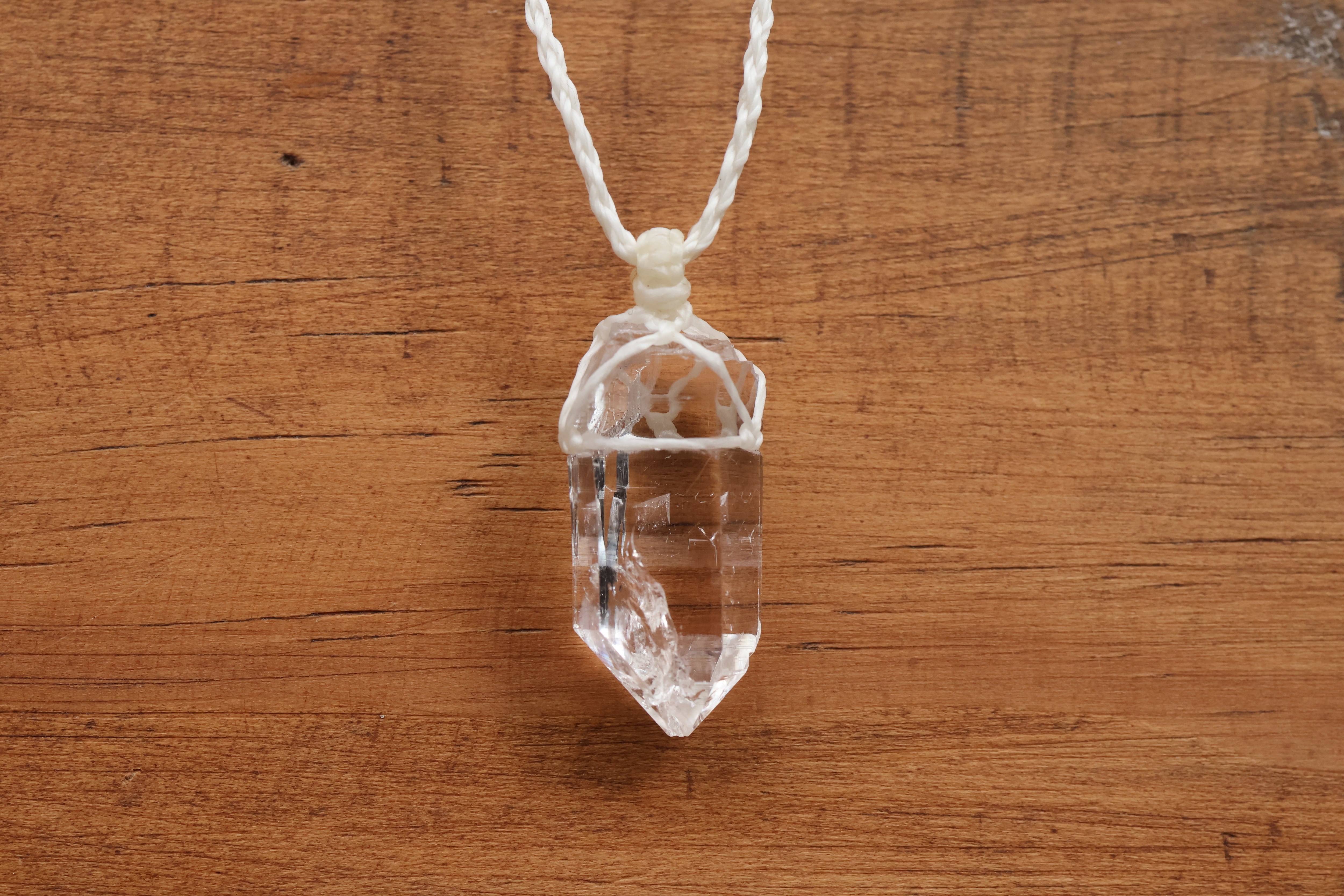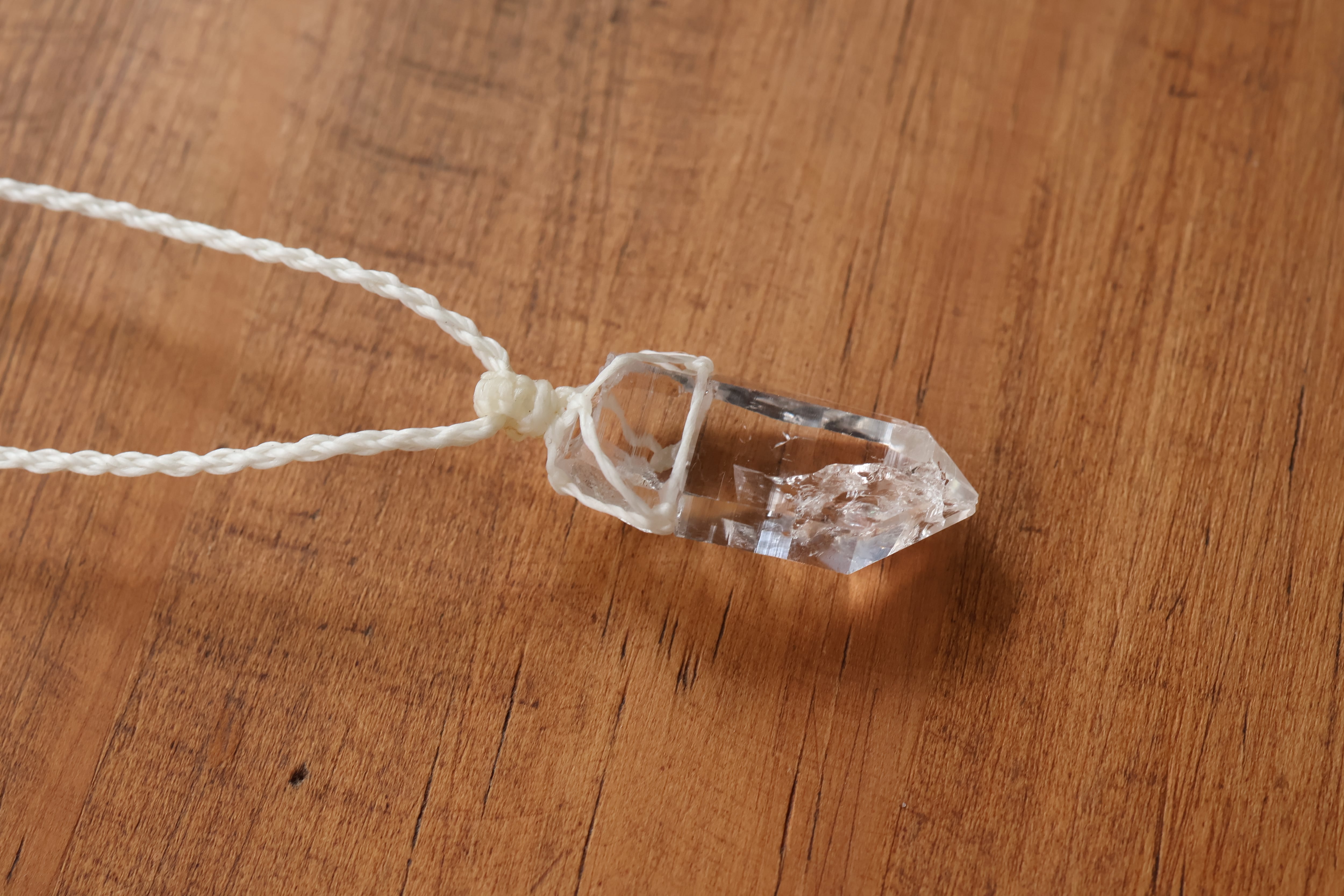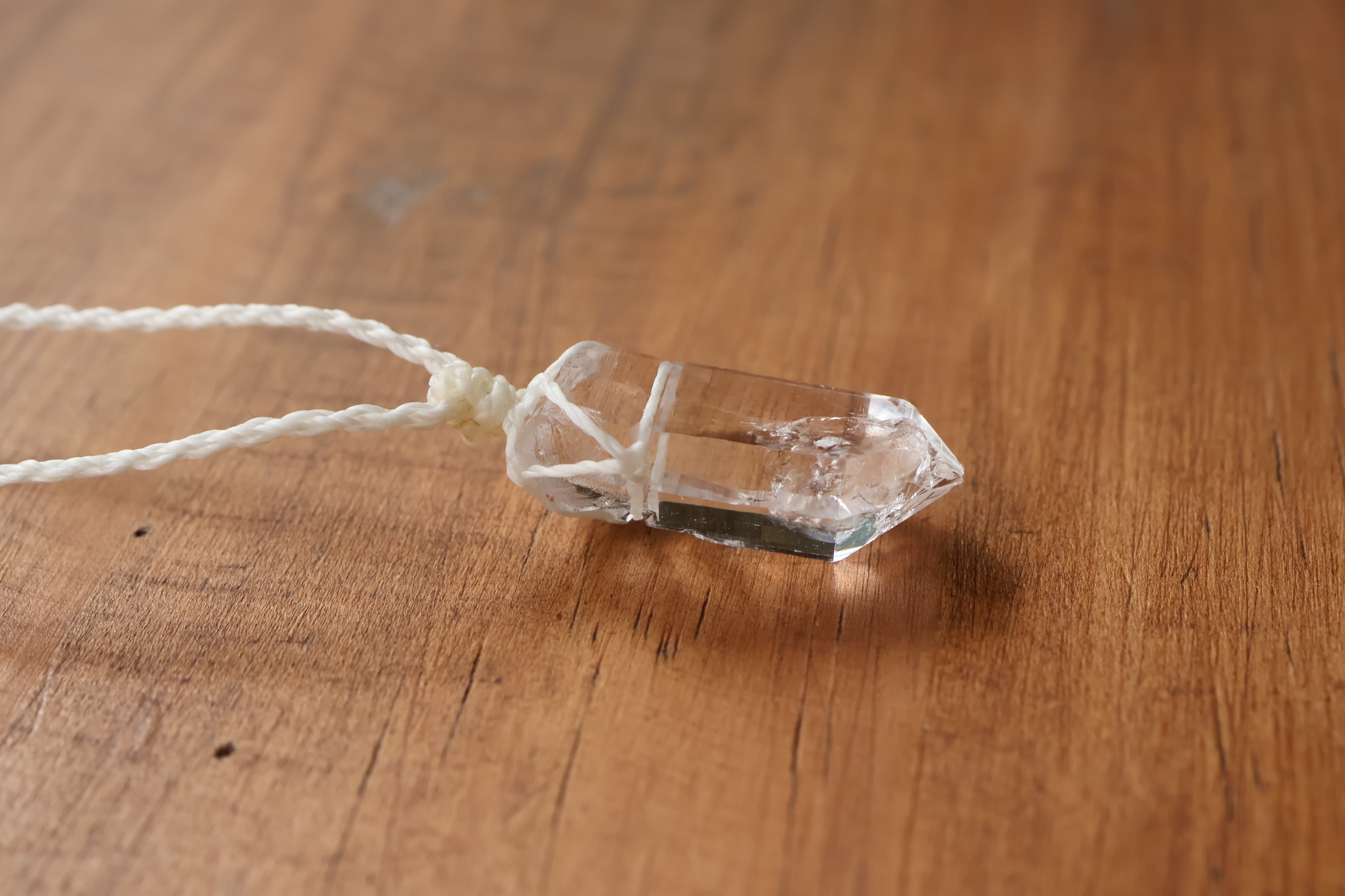 透き通る水の雫のような透明度が高いマニハール産のヒマラヤ水晶をシンプルに編み、ペンダントに仕立てました。