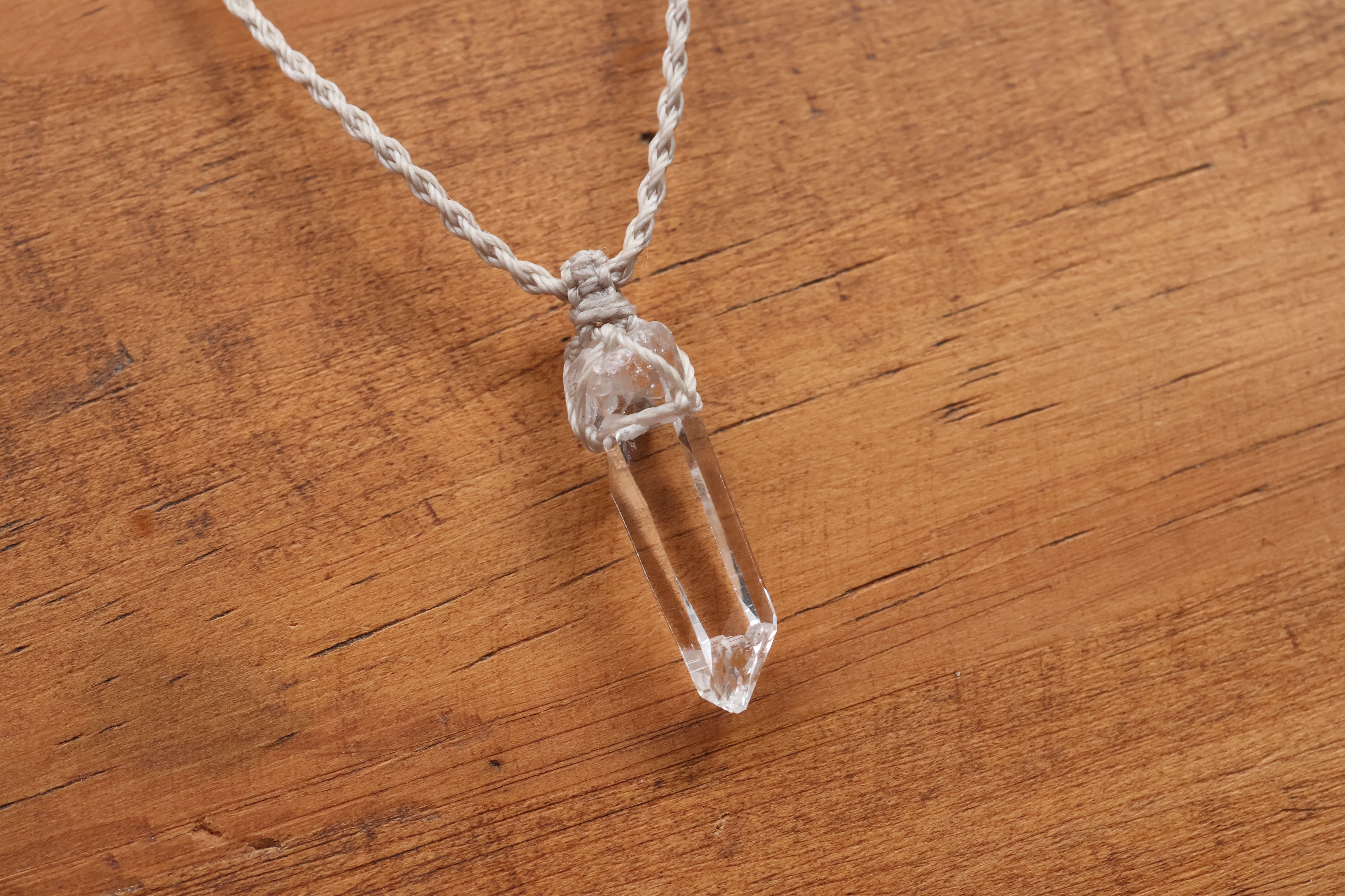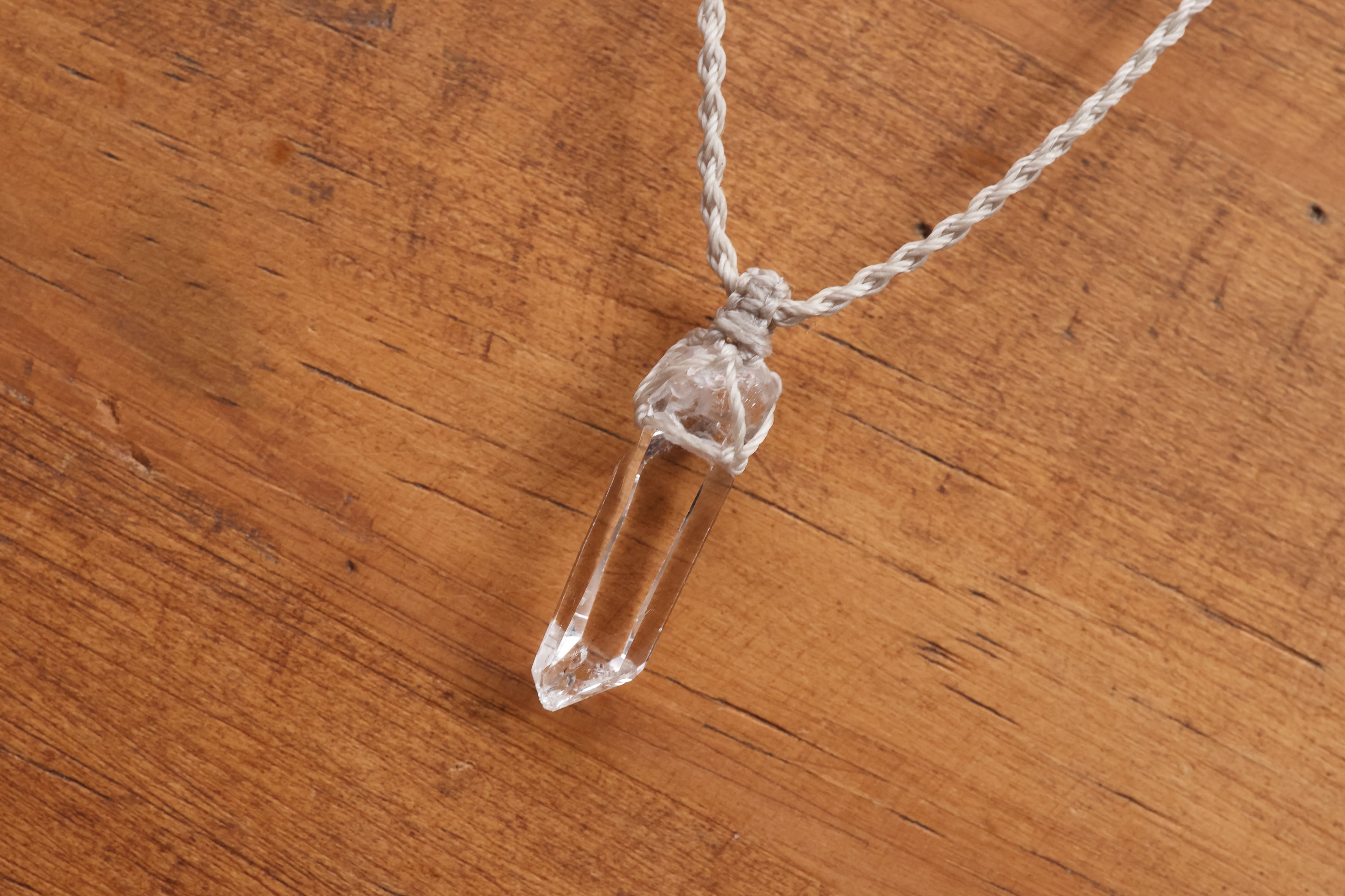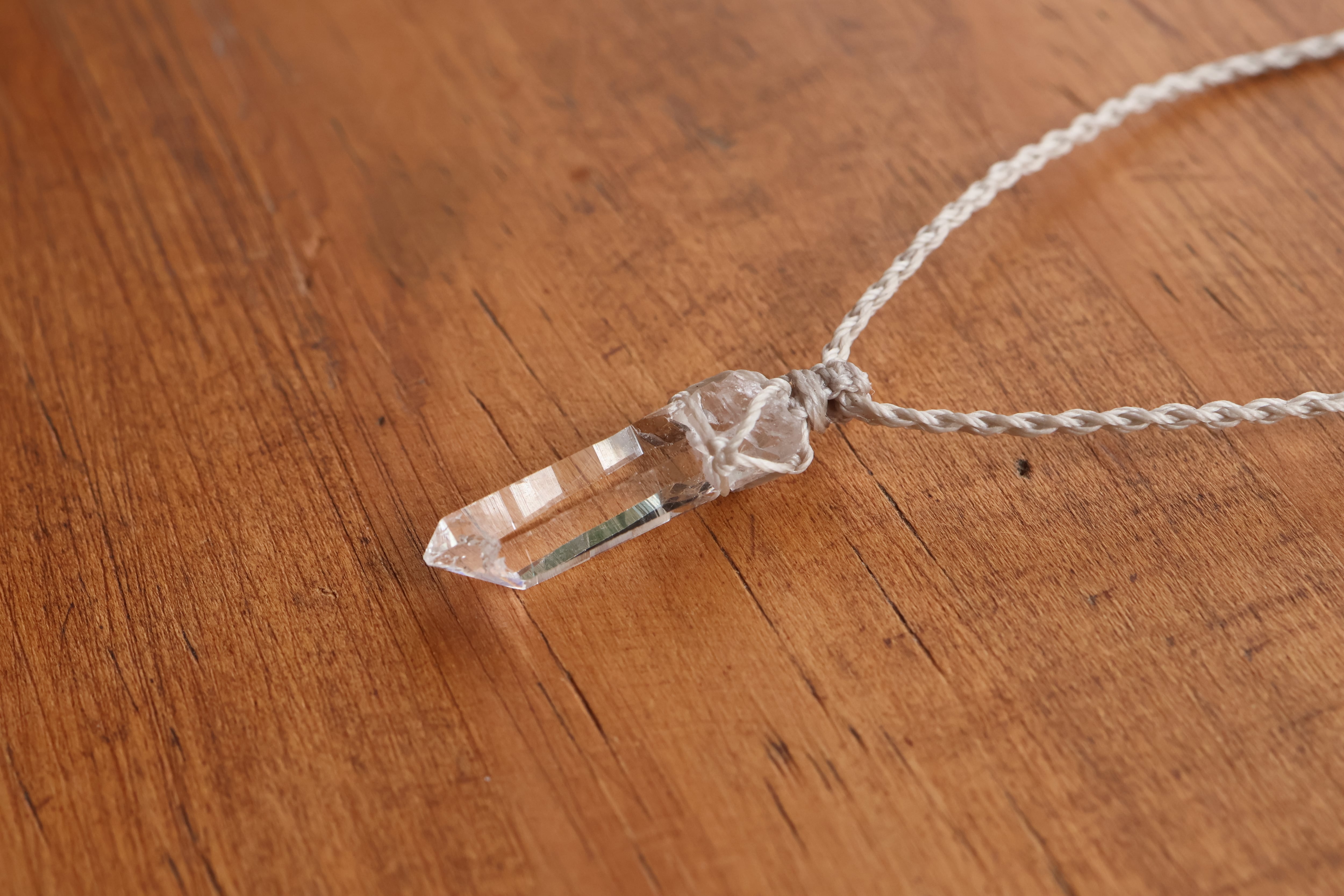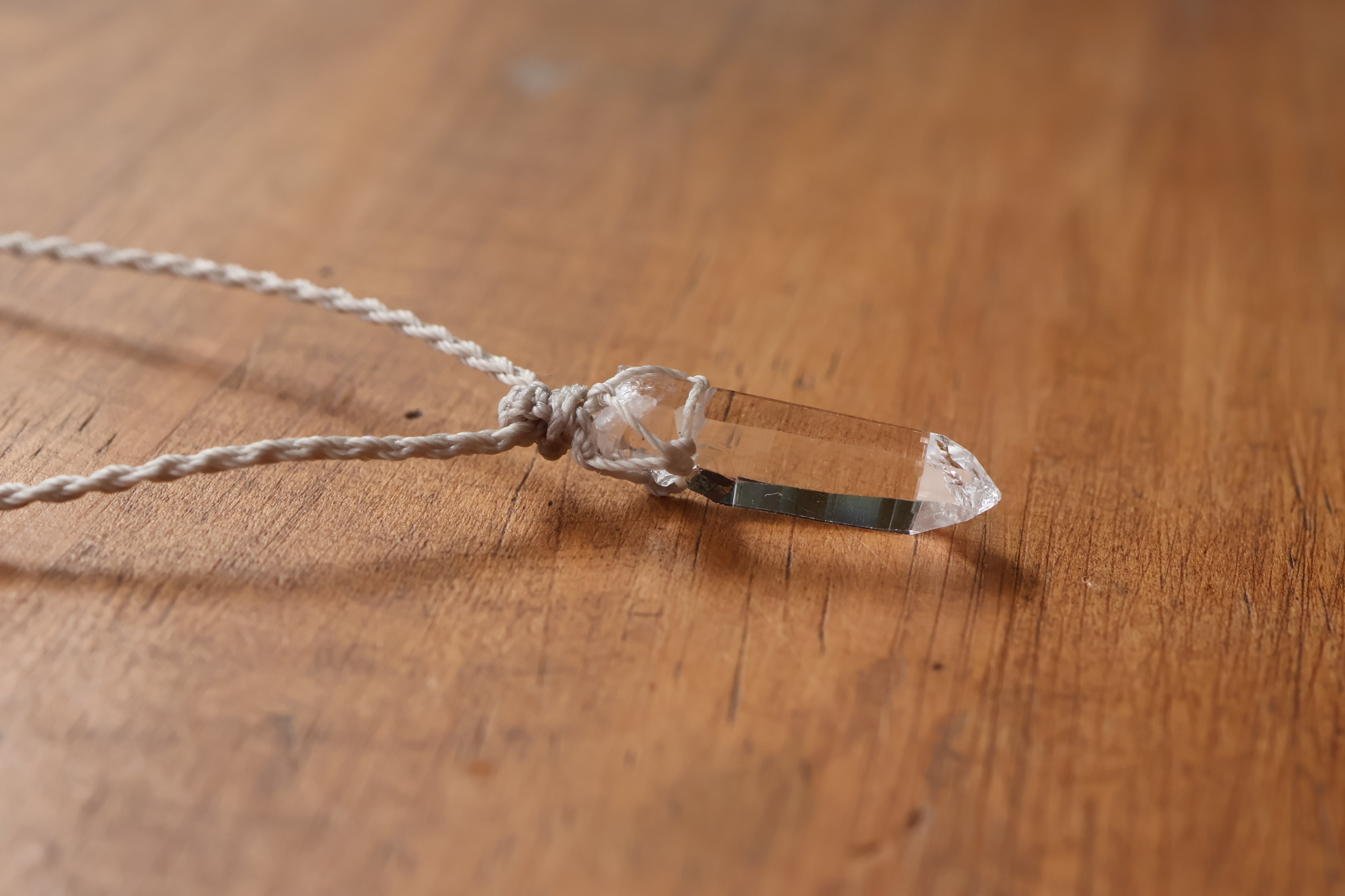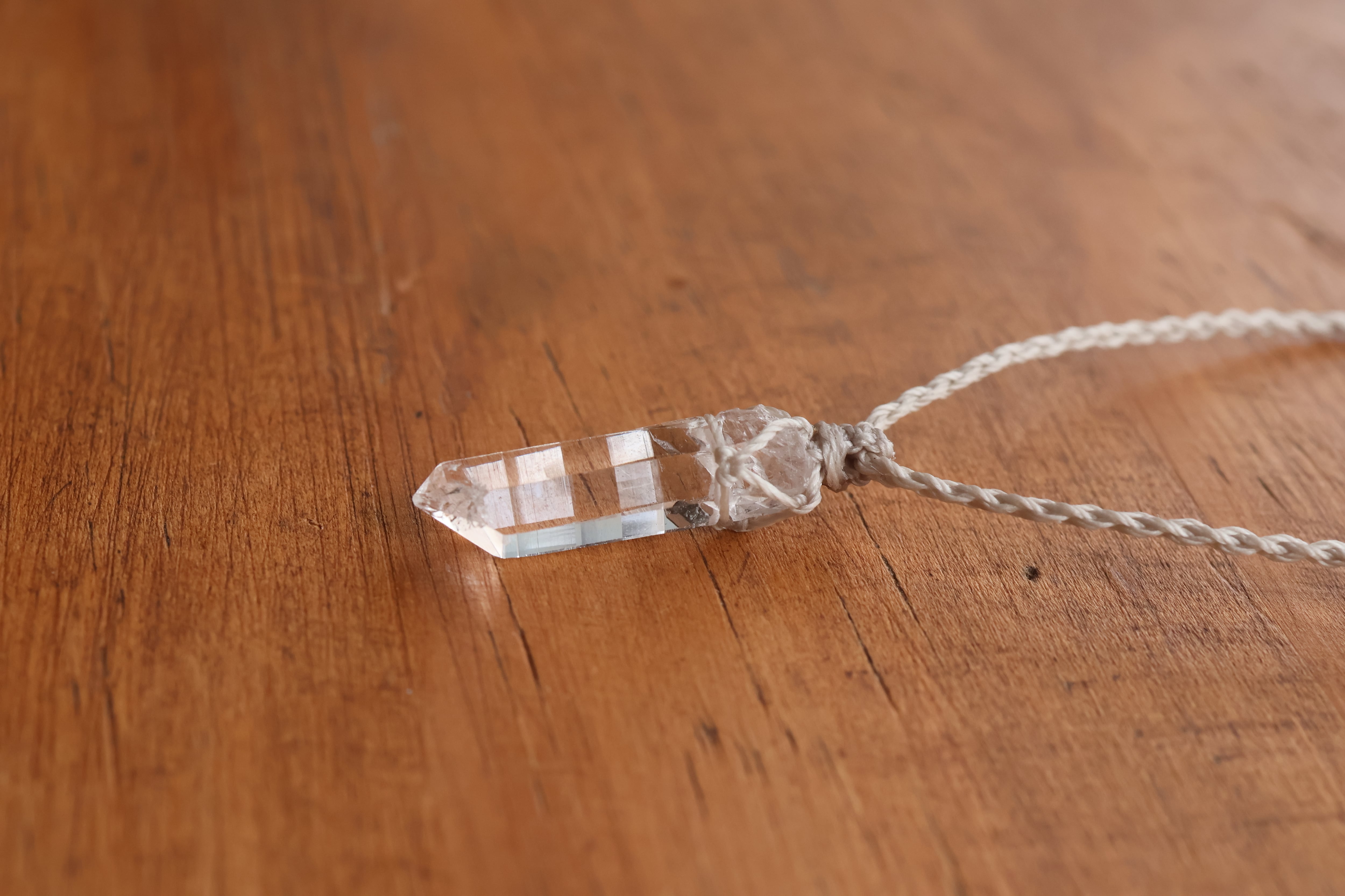 透き通る水の雫のような透明度が高いマニハール産のヒマラヤ水晶をシンプルに編み、ペンダントに仕立てました。