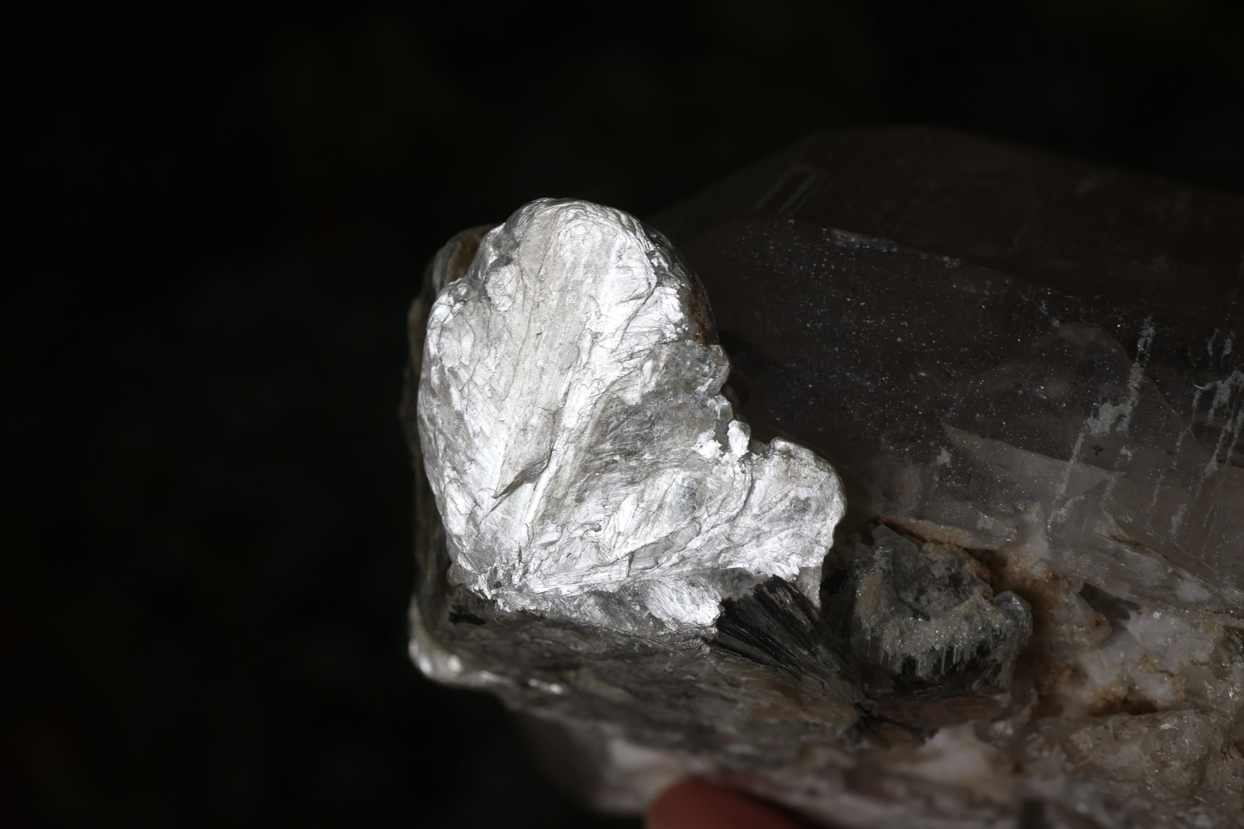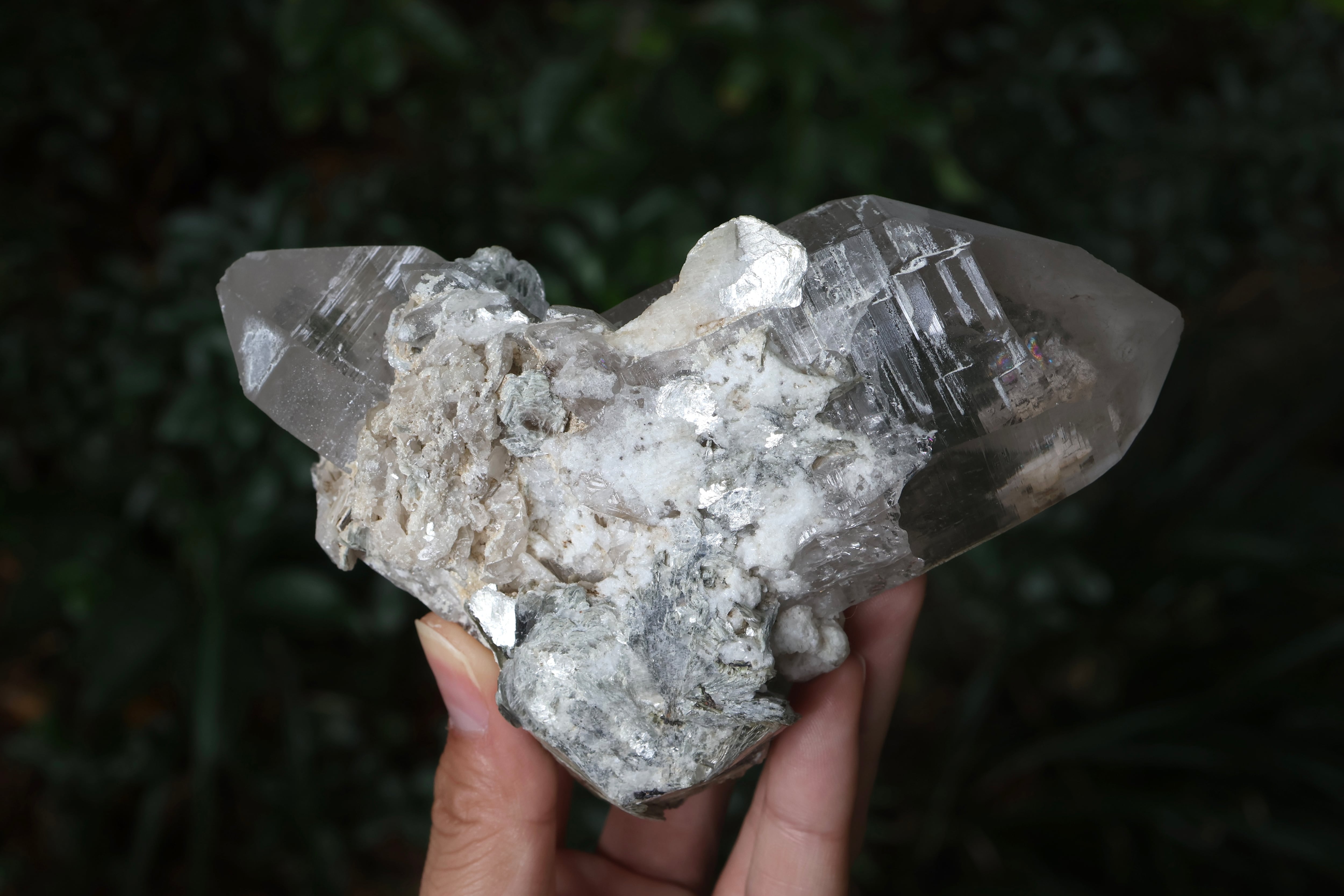 こちらは2000年代初頭にアクアマリンと同じポケット(晶洞)から産出された希少な水晶で、虹を内包した両側に先端を持つ両剣水晶(DT.ダブルターミネーテッド)で、根元付近にモスコバイトが共生しています。