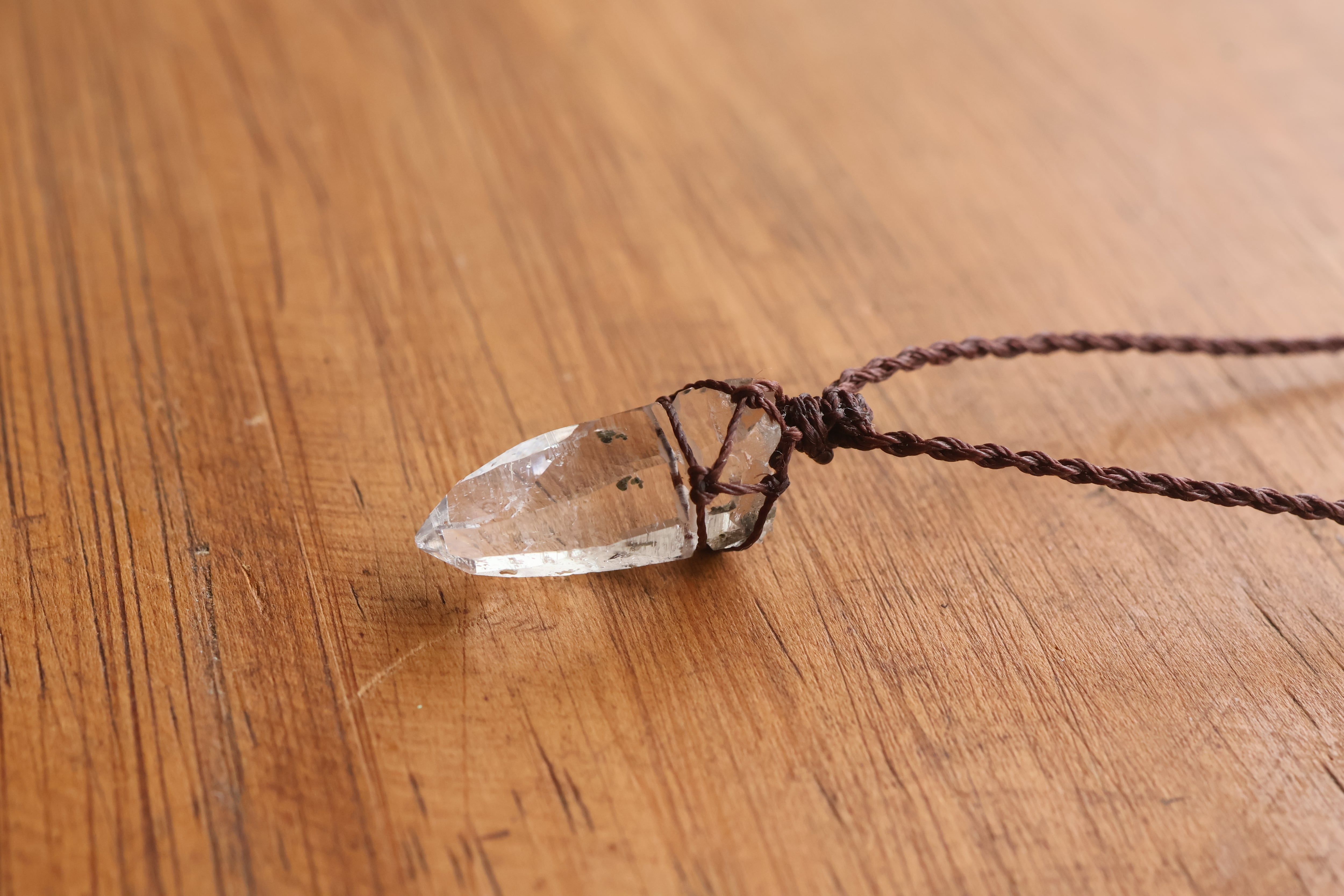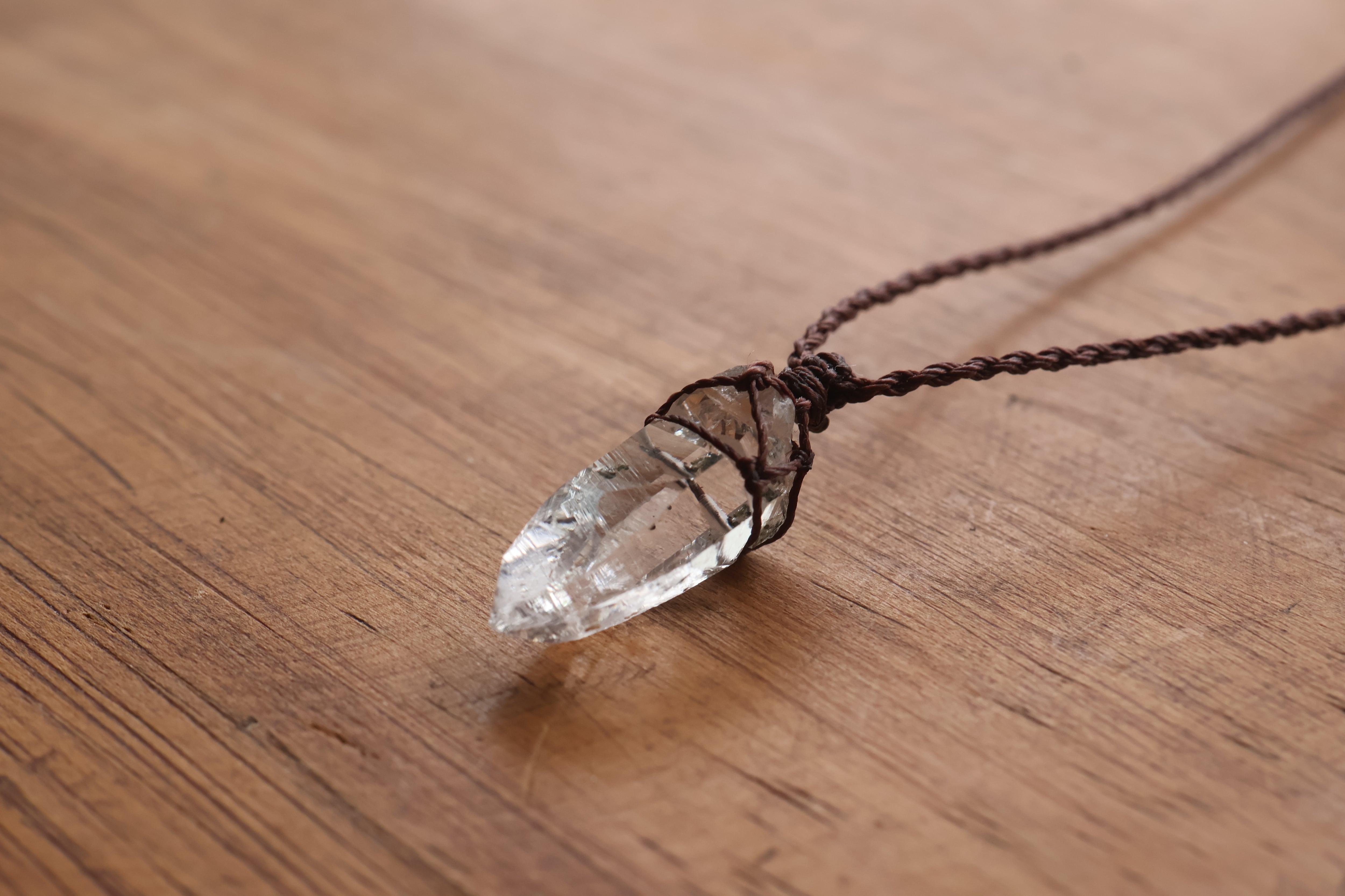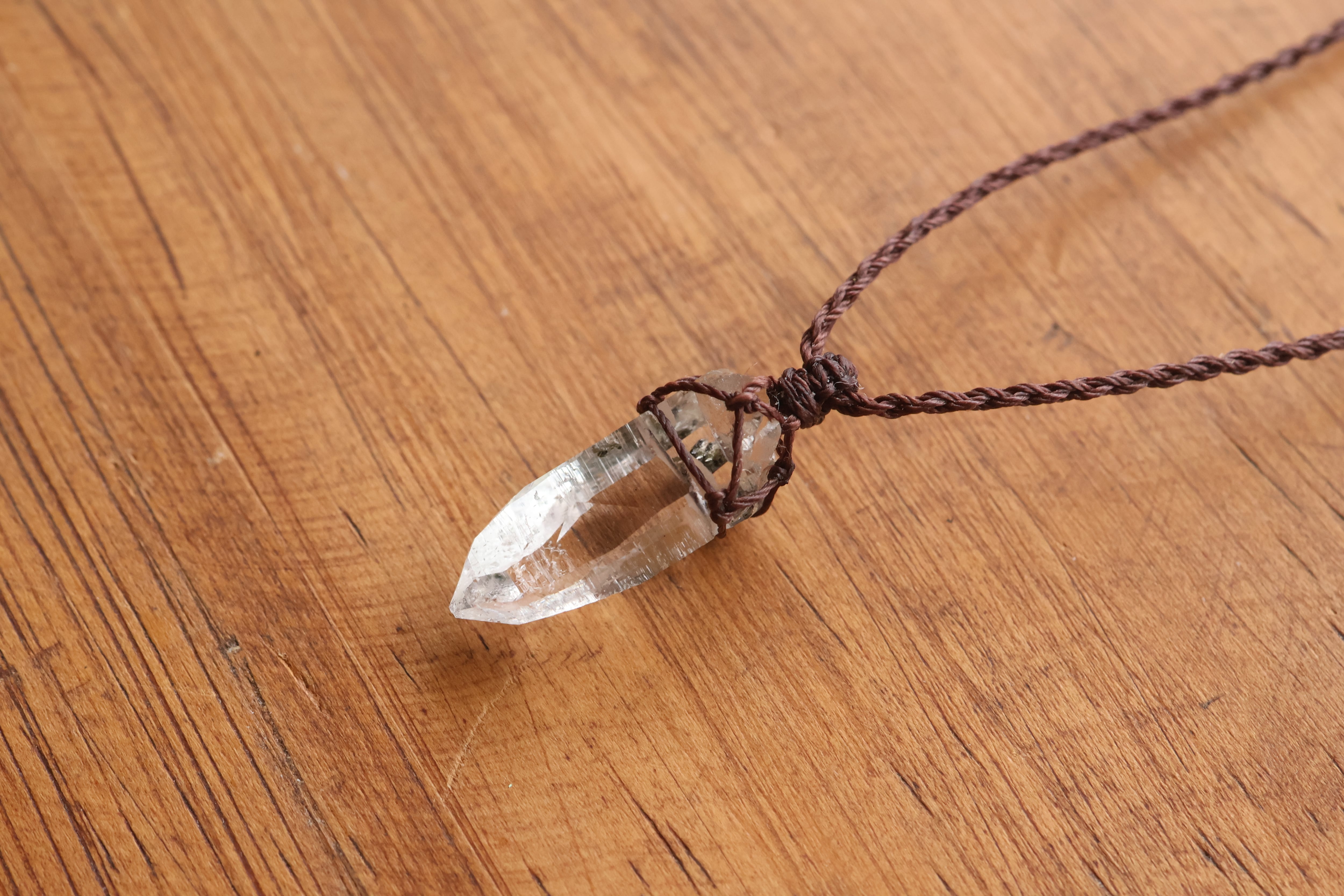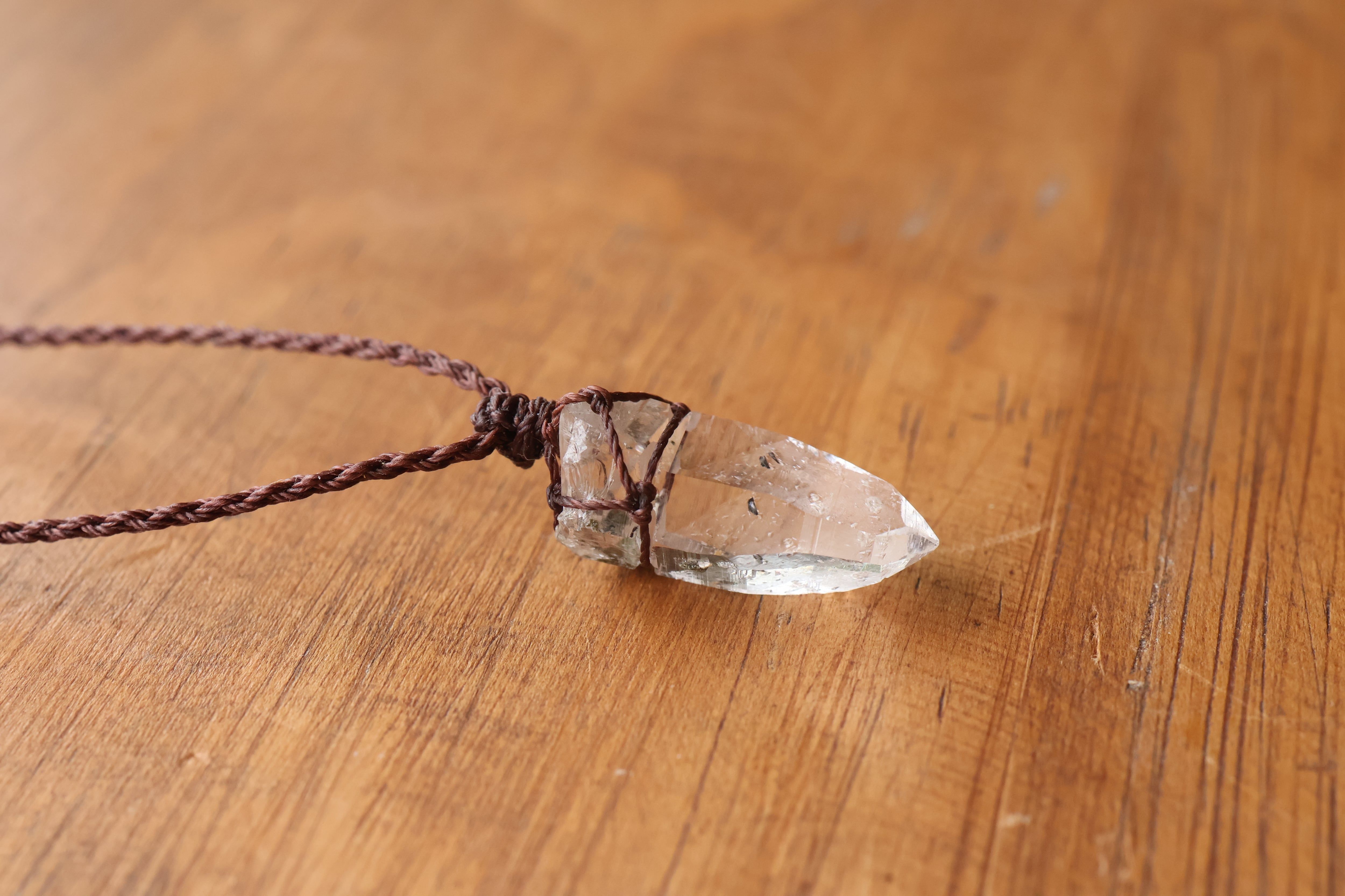 透き通る水の雫のような透明度が高いガネーシュヒマール産のヒマラヤ水晶をシンプルに編み、ペンダントに仕立てました。