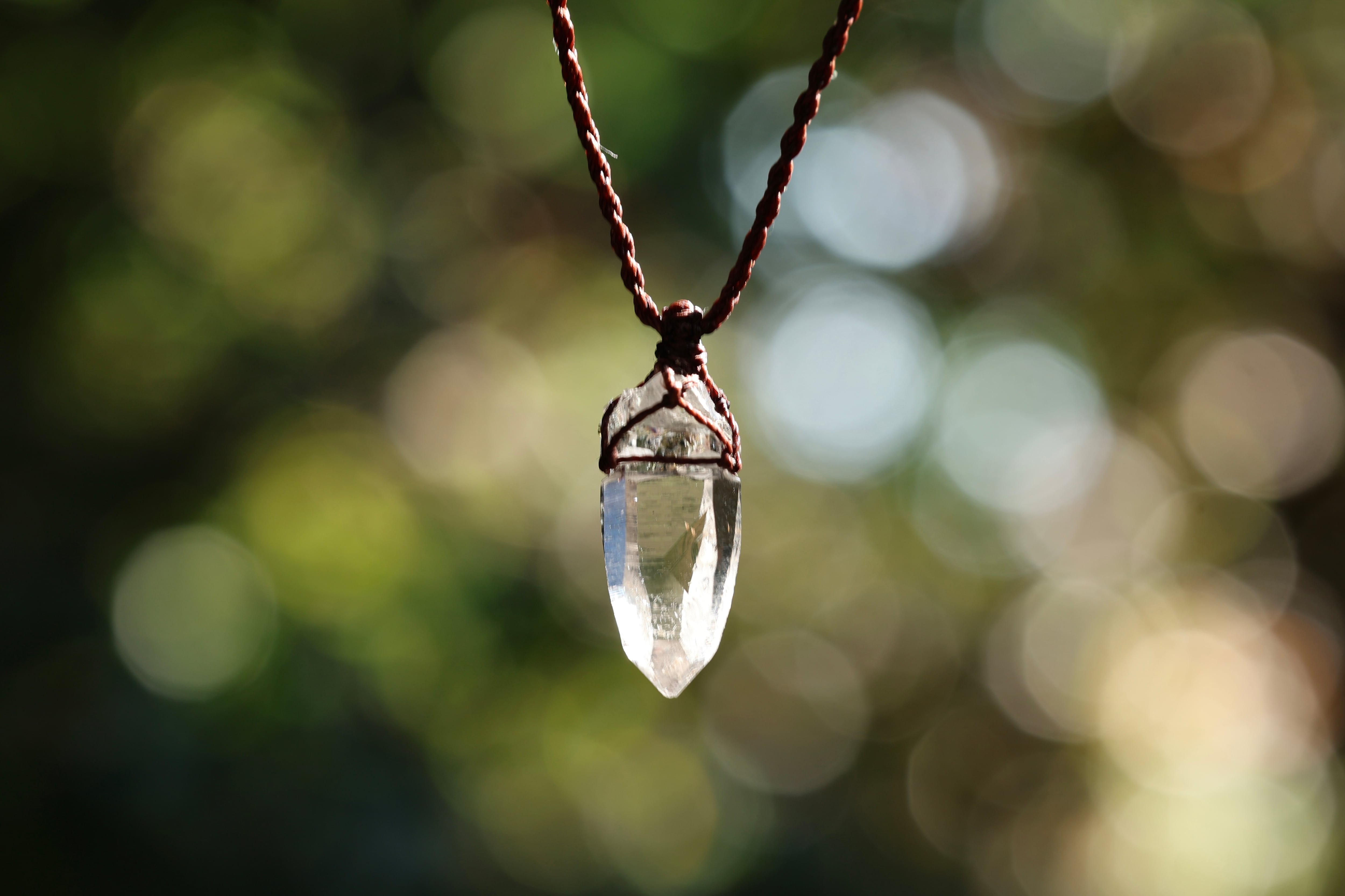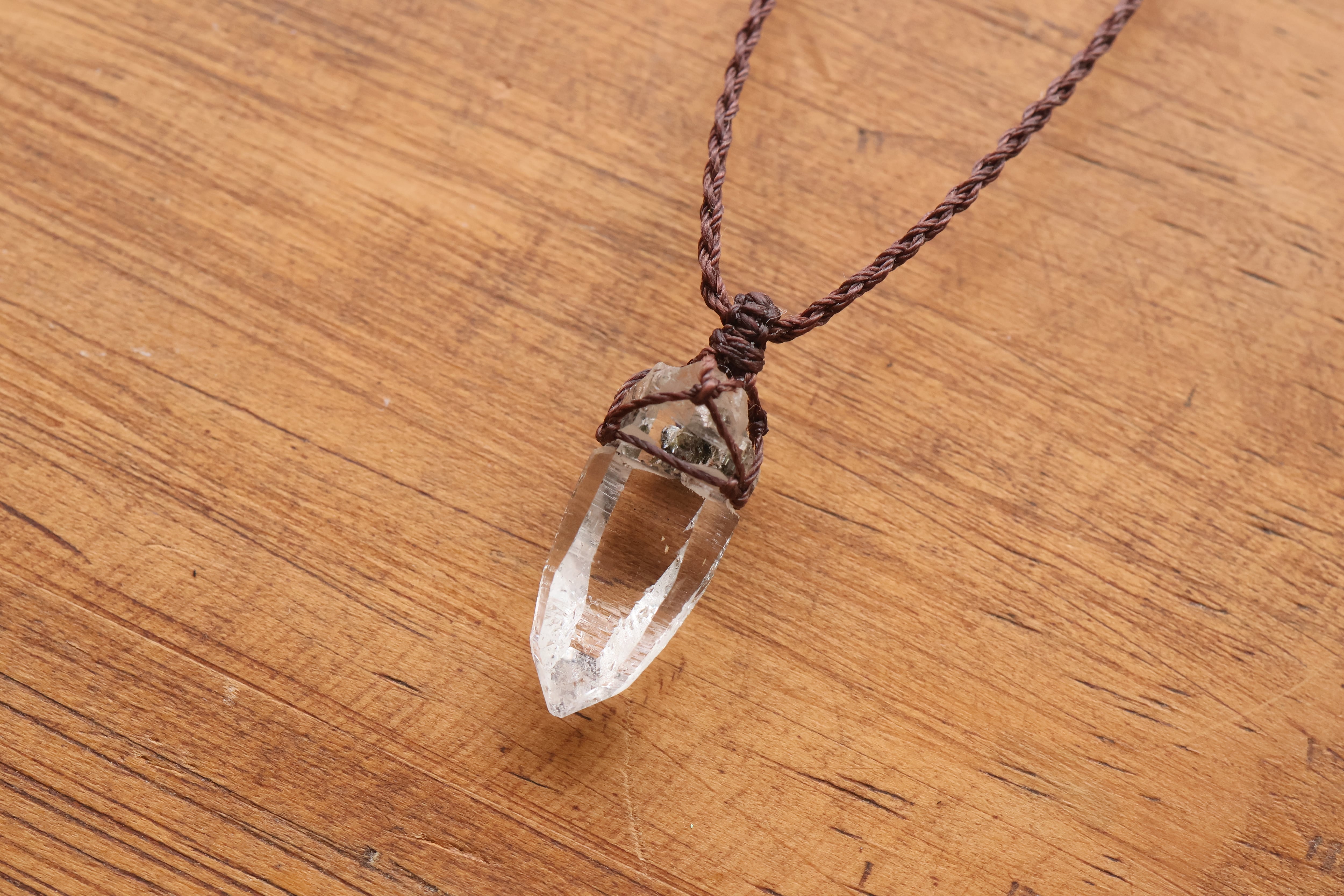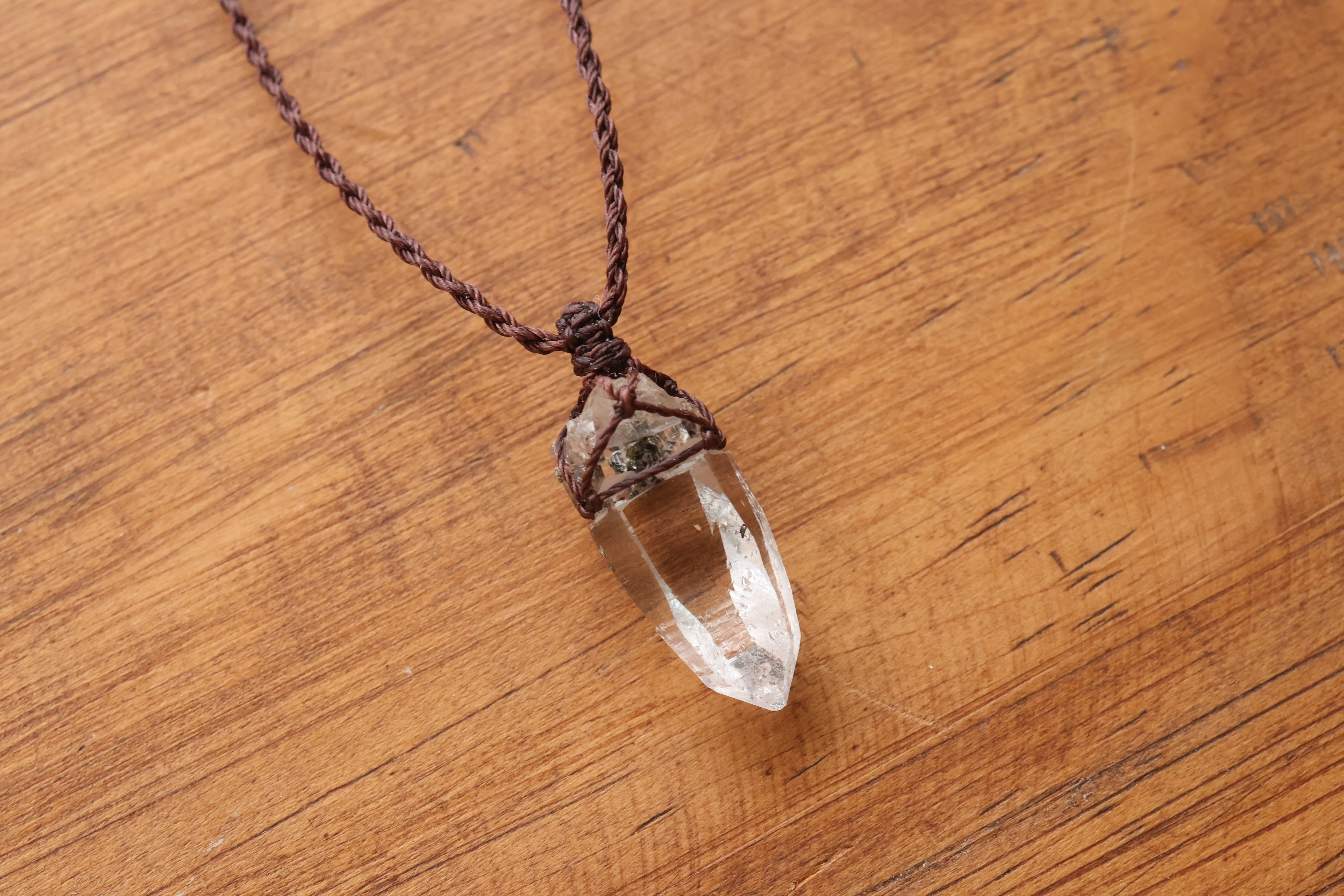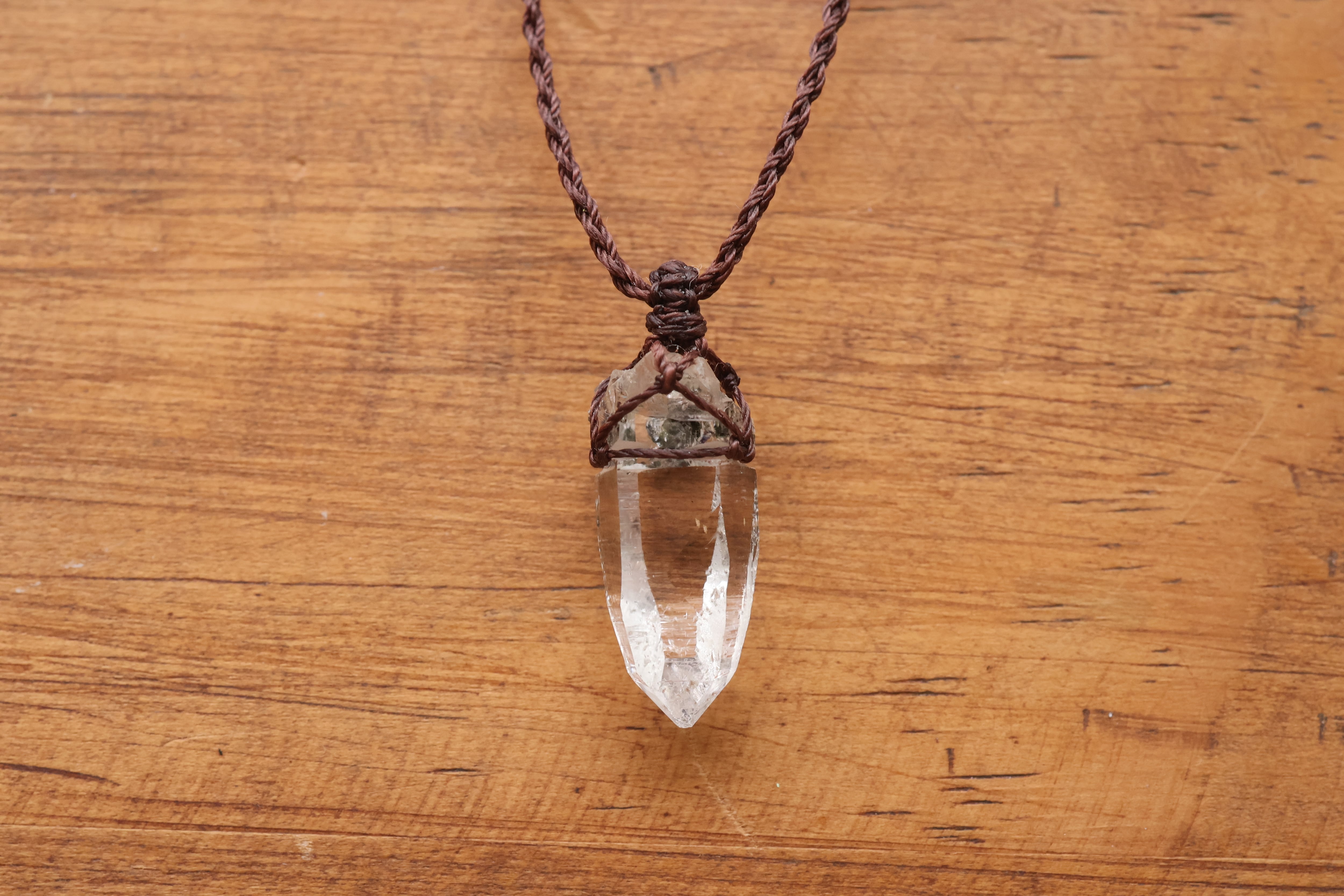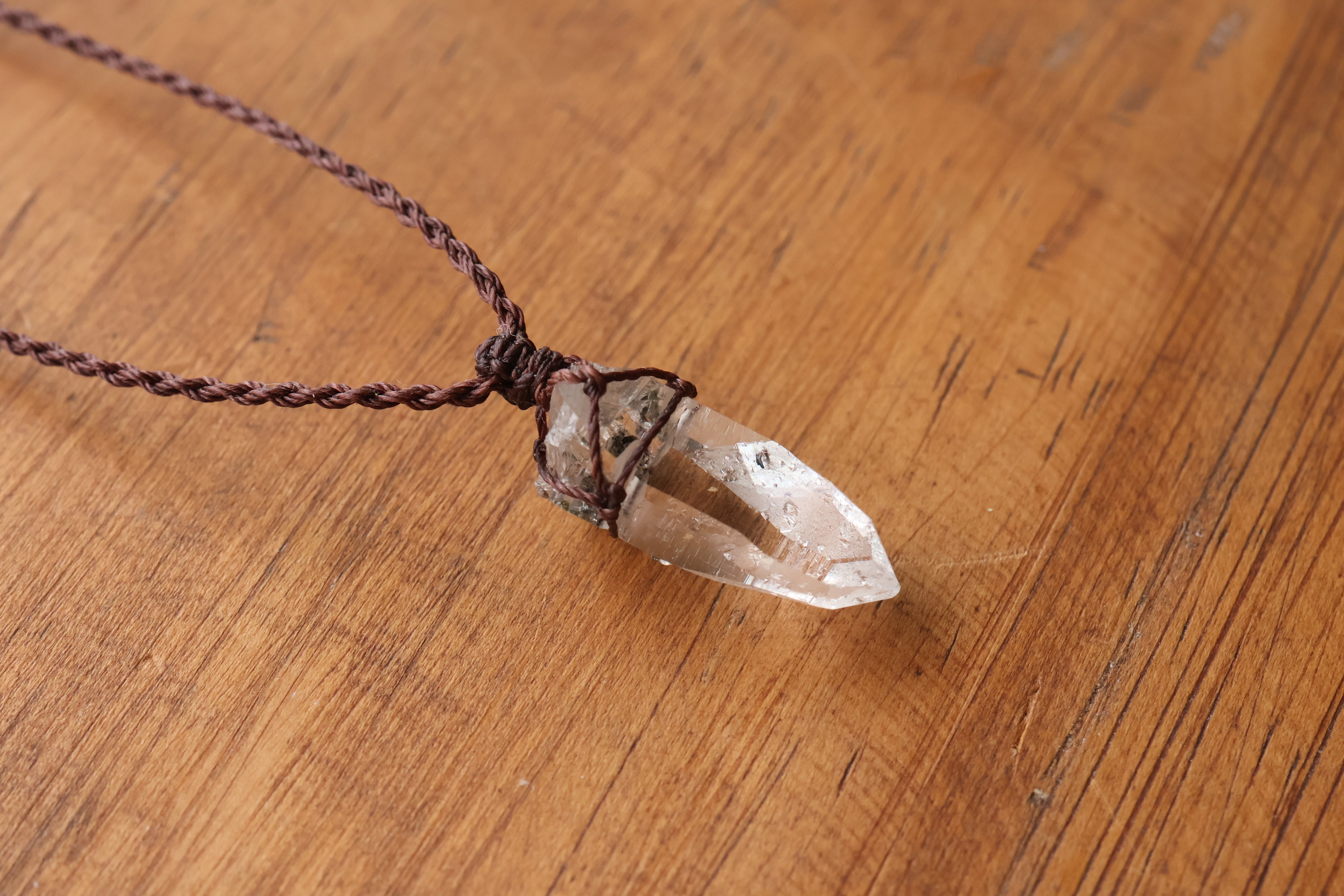 透き通る水の雫のような透明度が高いガネーシュヒマール産のヒマラヤ水晶をシンプルに編み、ペンダントに仕立てました。