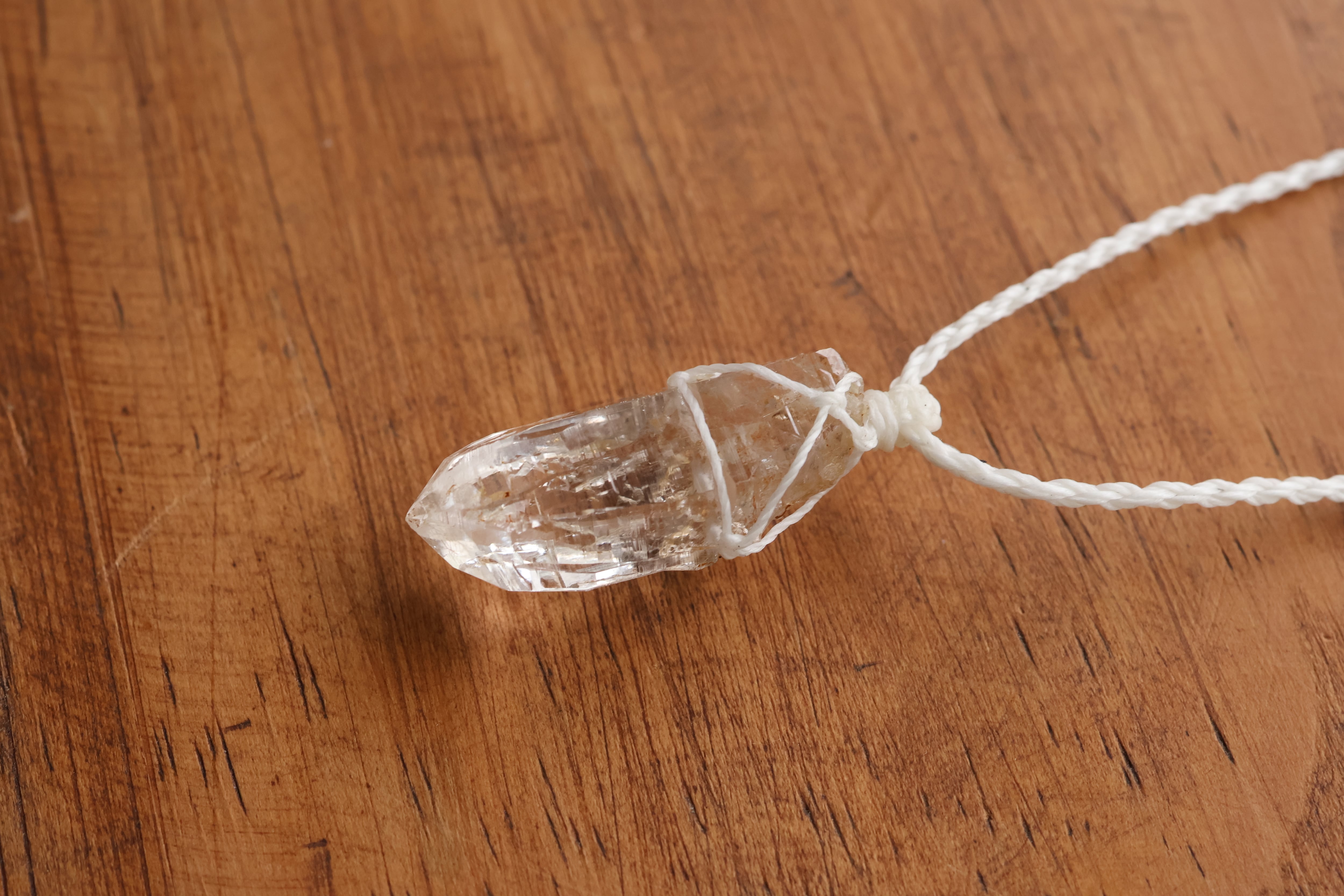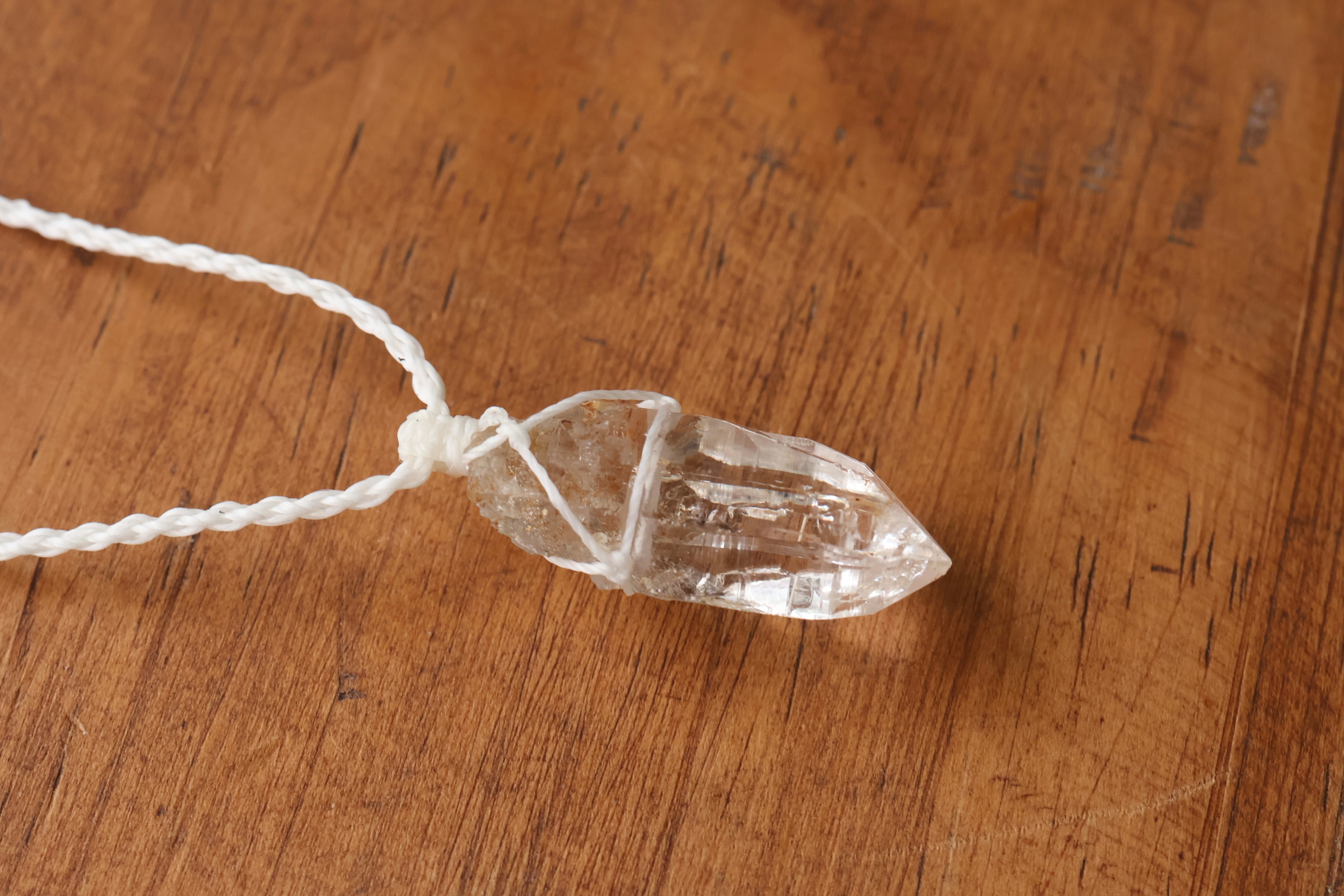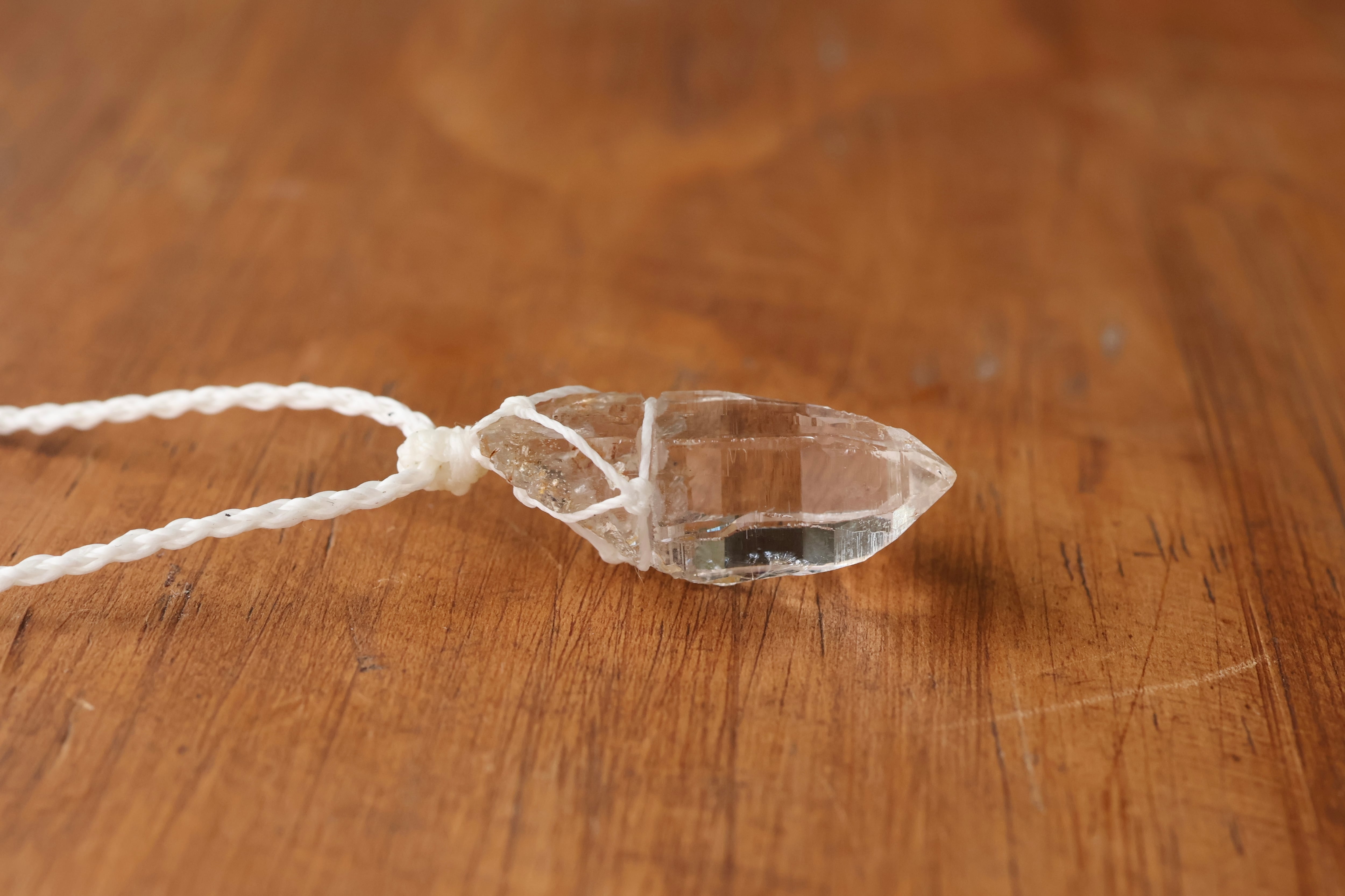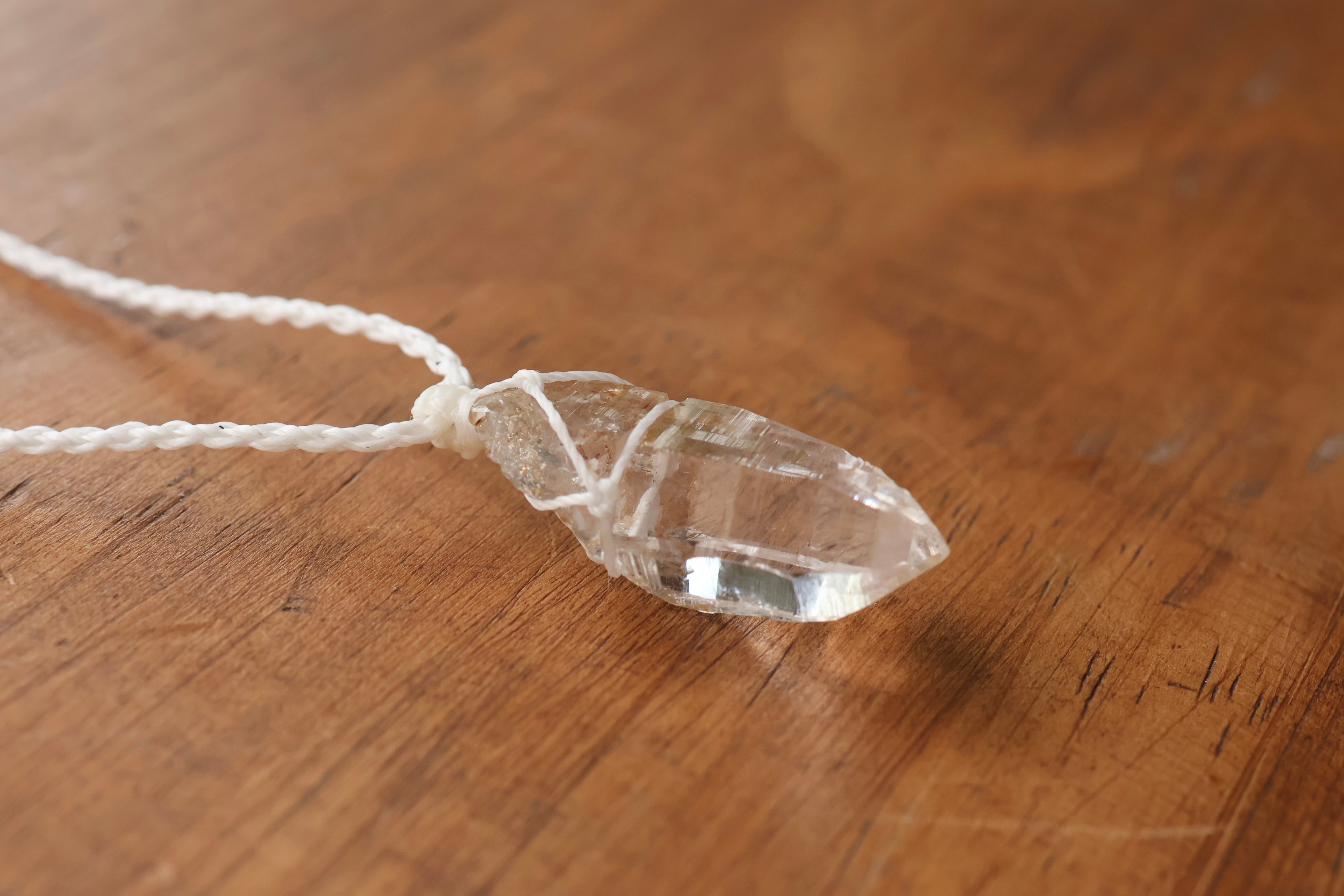 透き通る水の雫のような透明度が高いガネーシュヒマール産のヒマラヤ水晶をシンプルに編み、ペンダントに仕立てました。