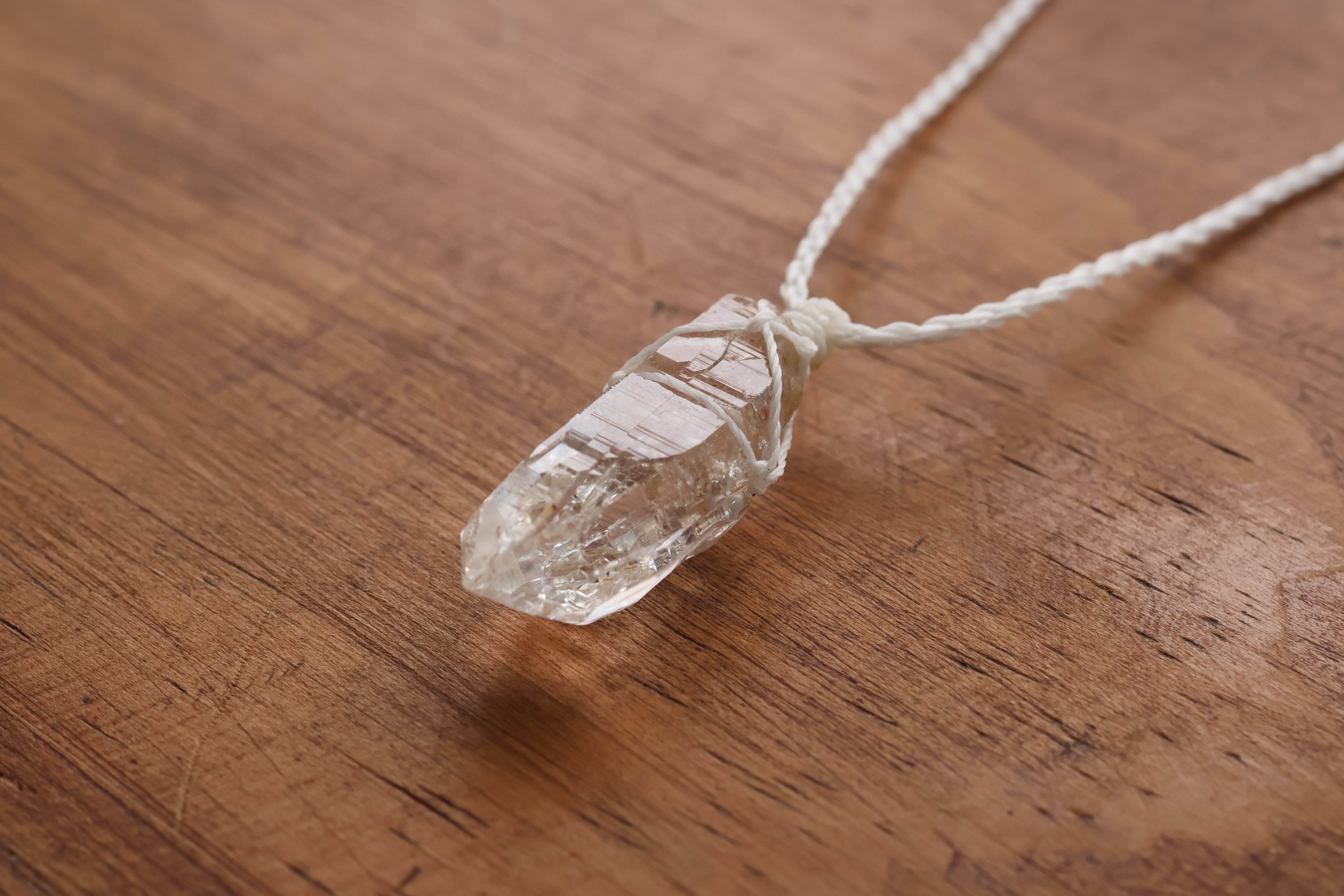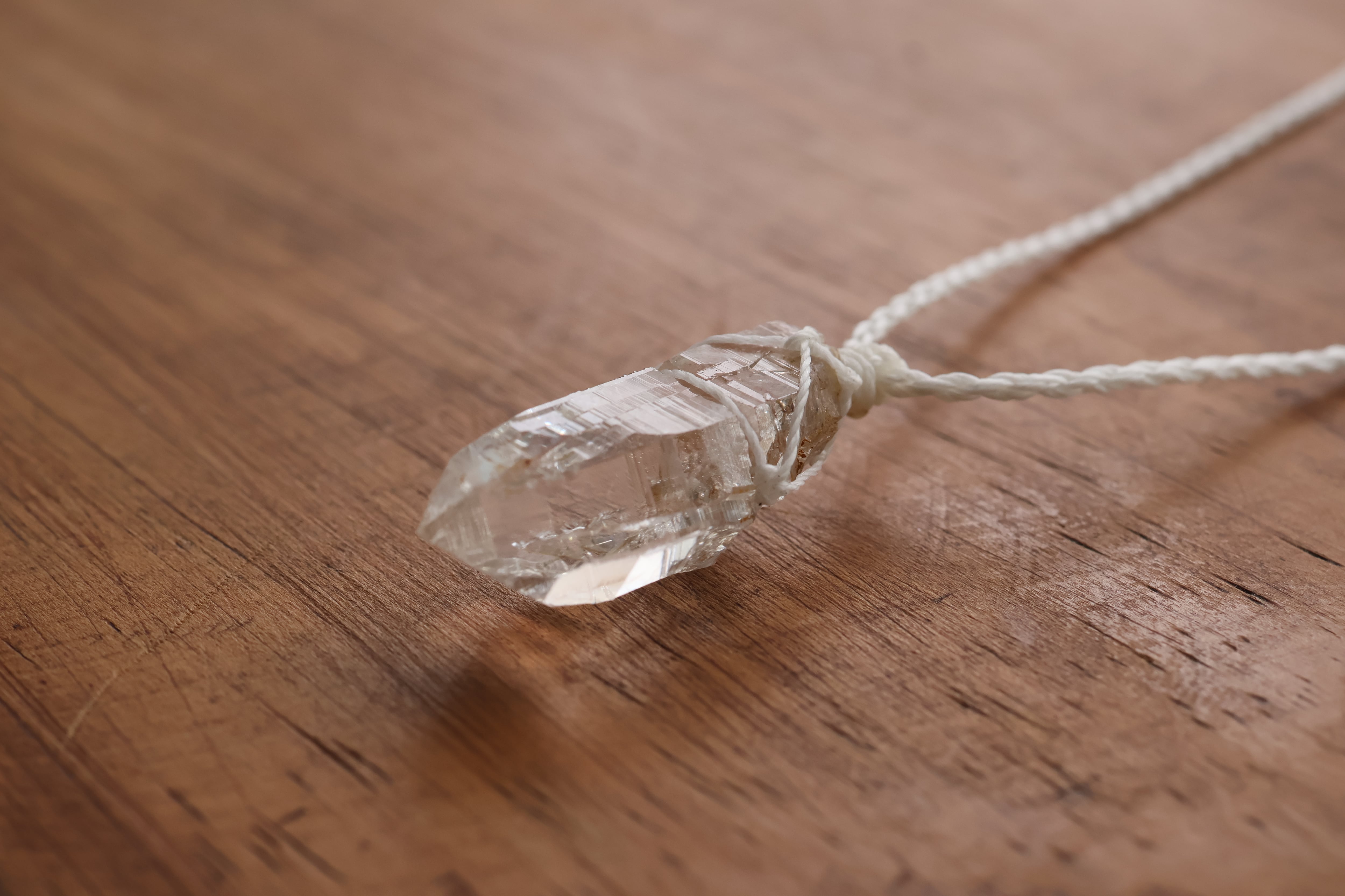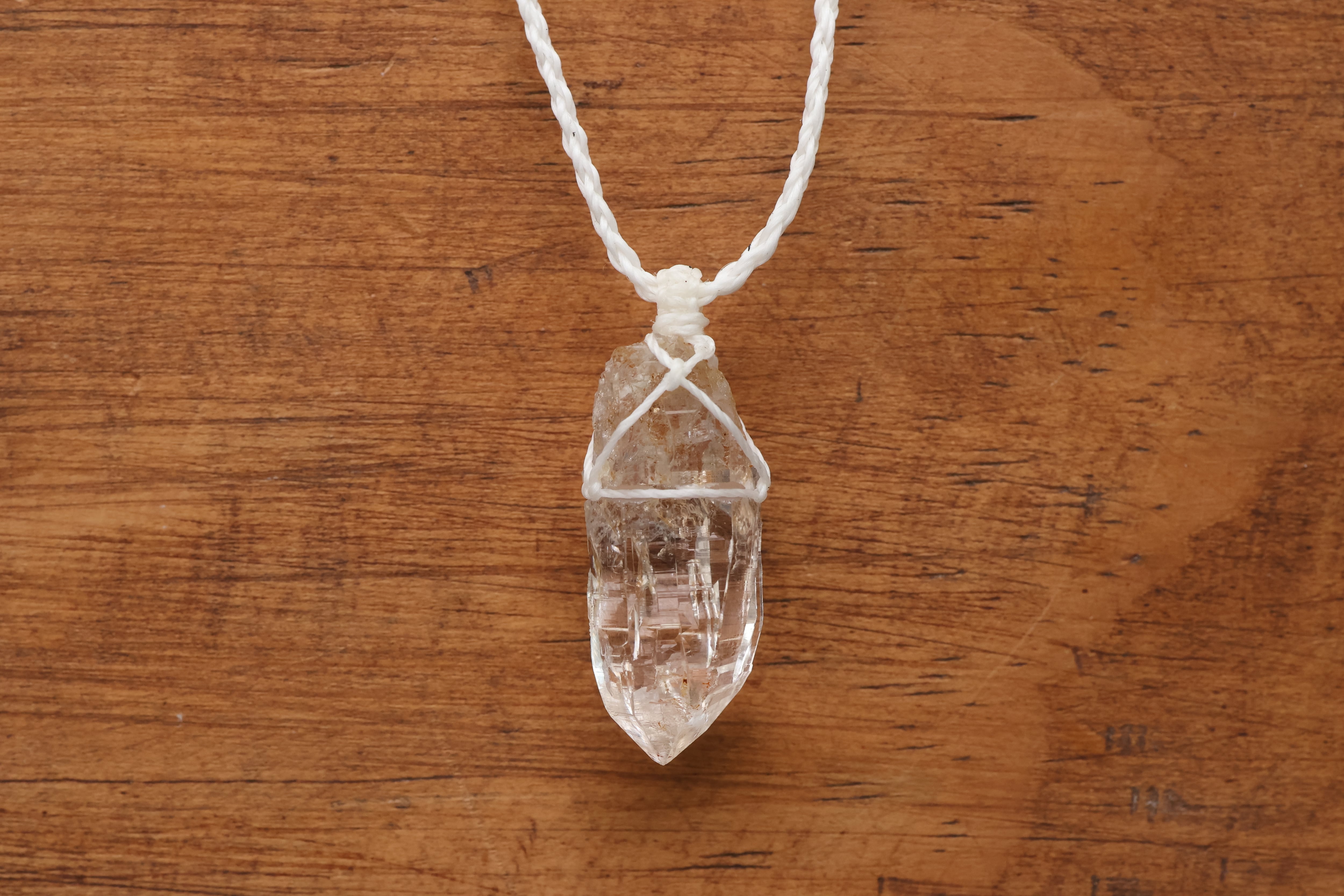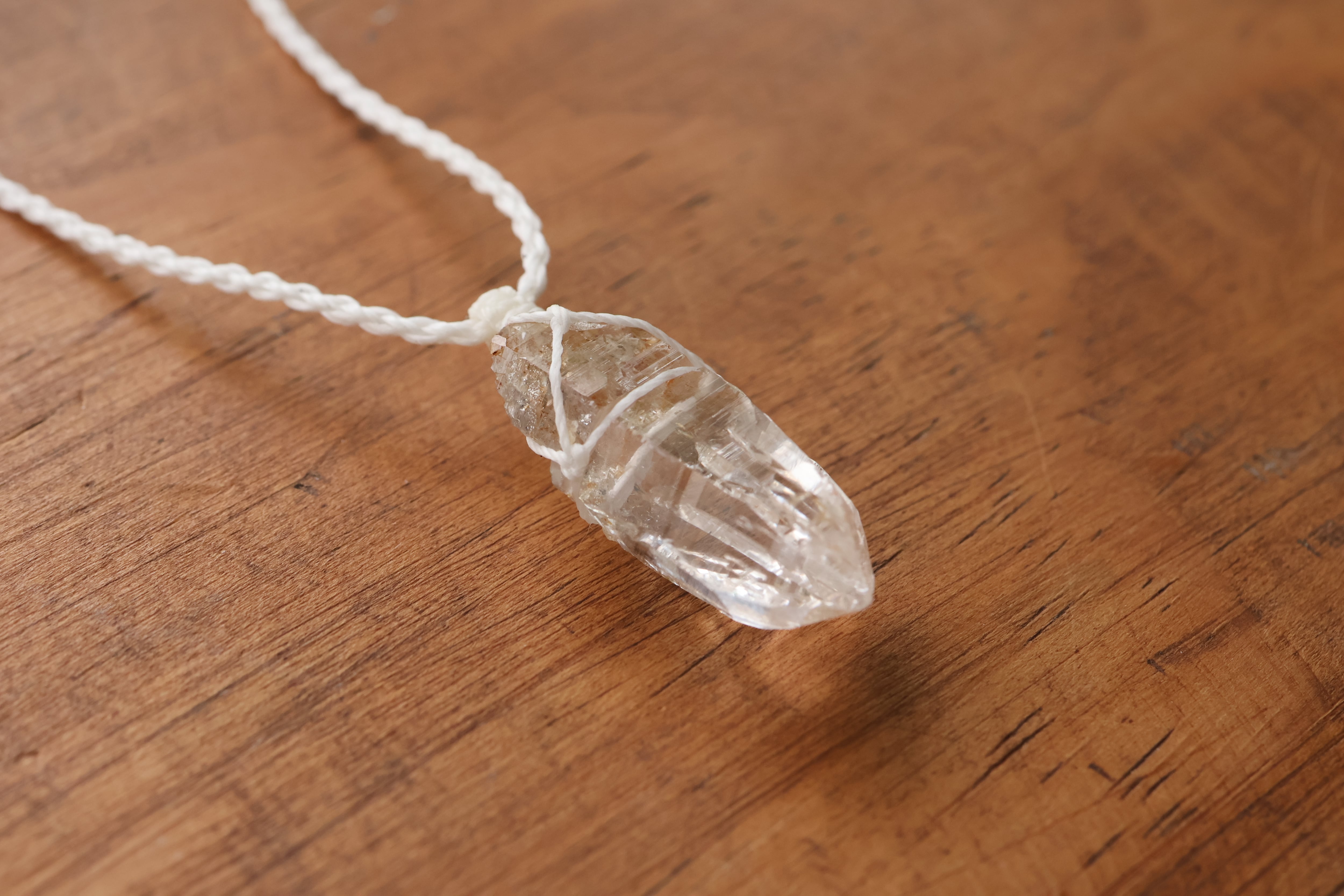 透き通る水の雫のような透明度が高いガネーシュヒマール産のヒマラヤ水晶をシンプルに編み、ペンダントに仕立てました。