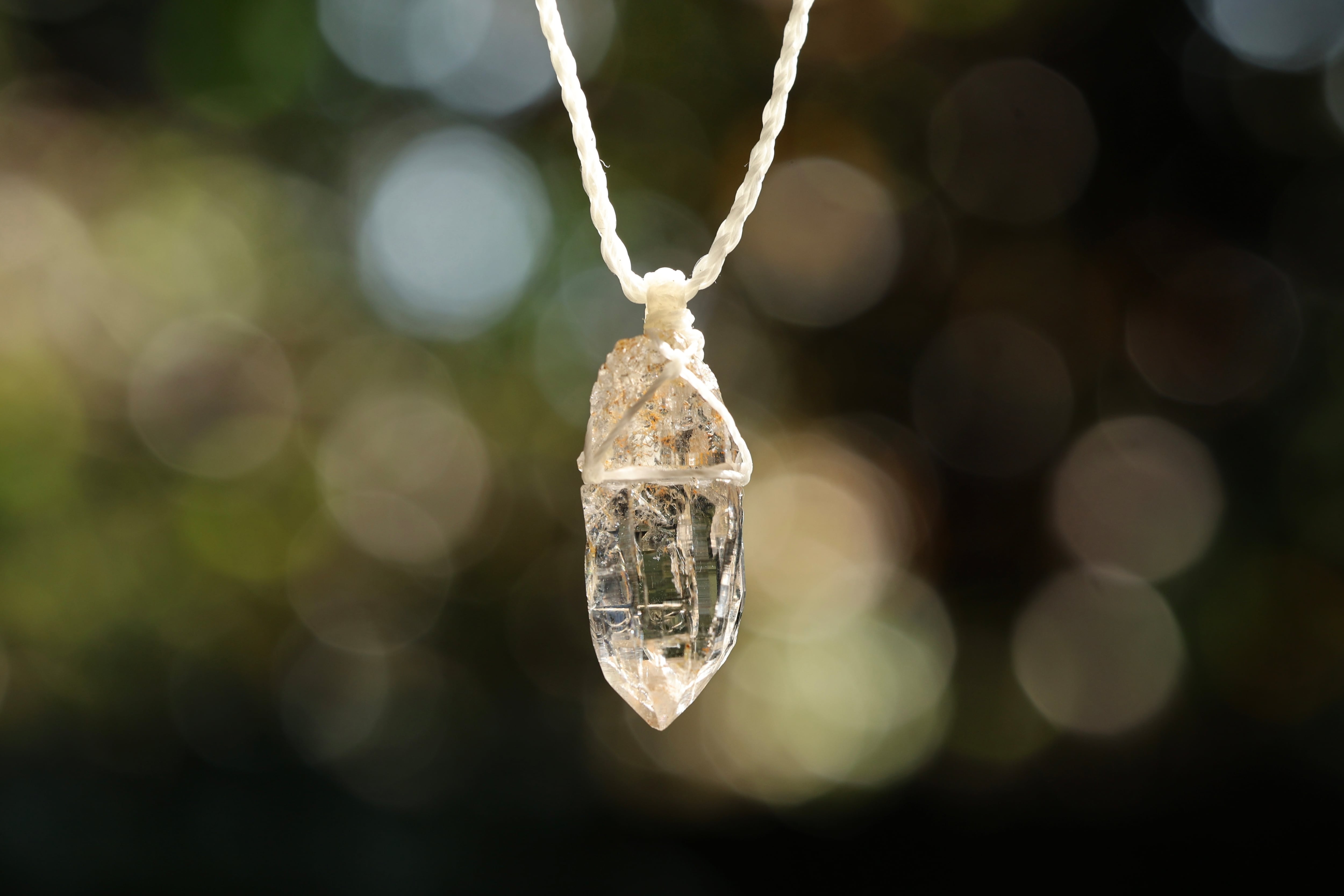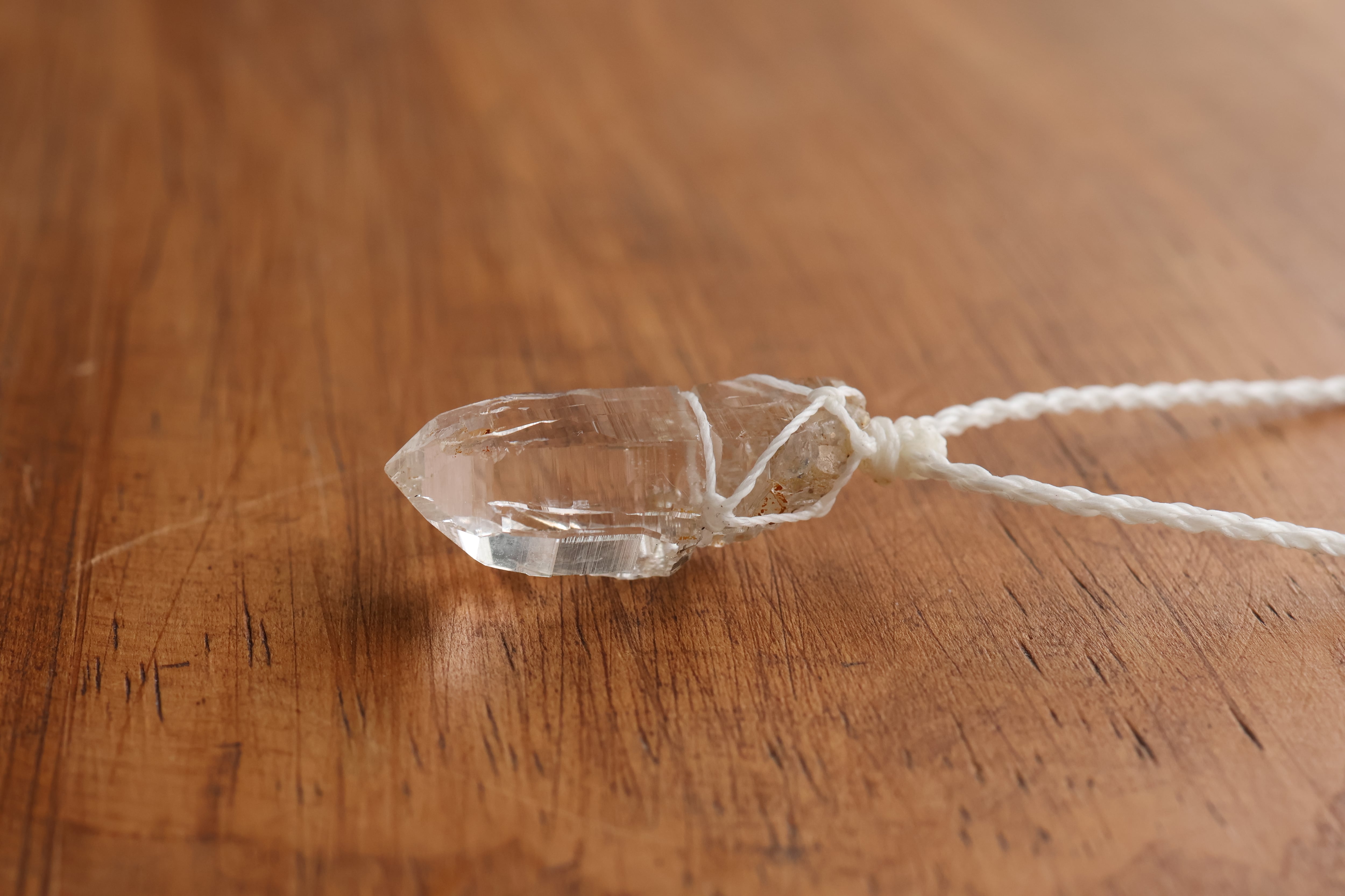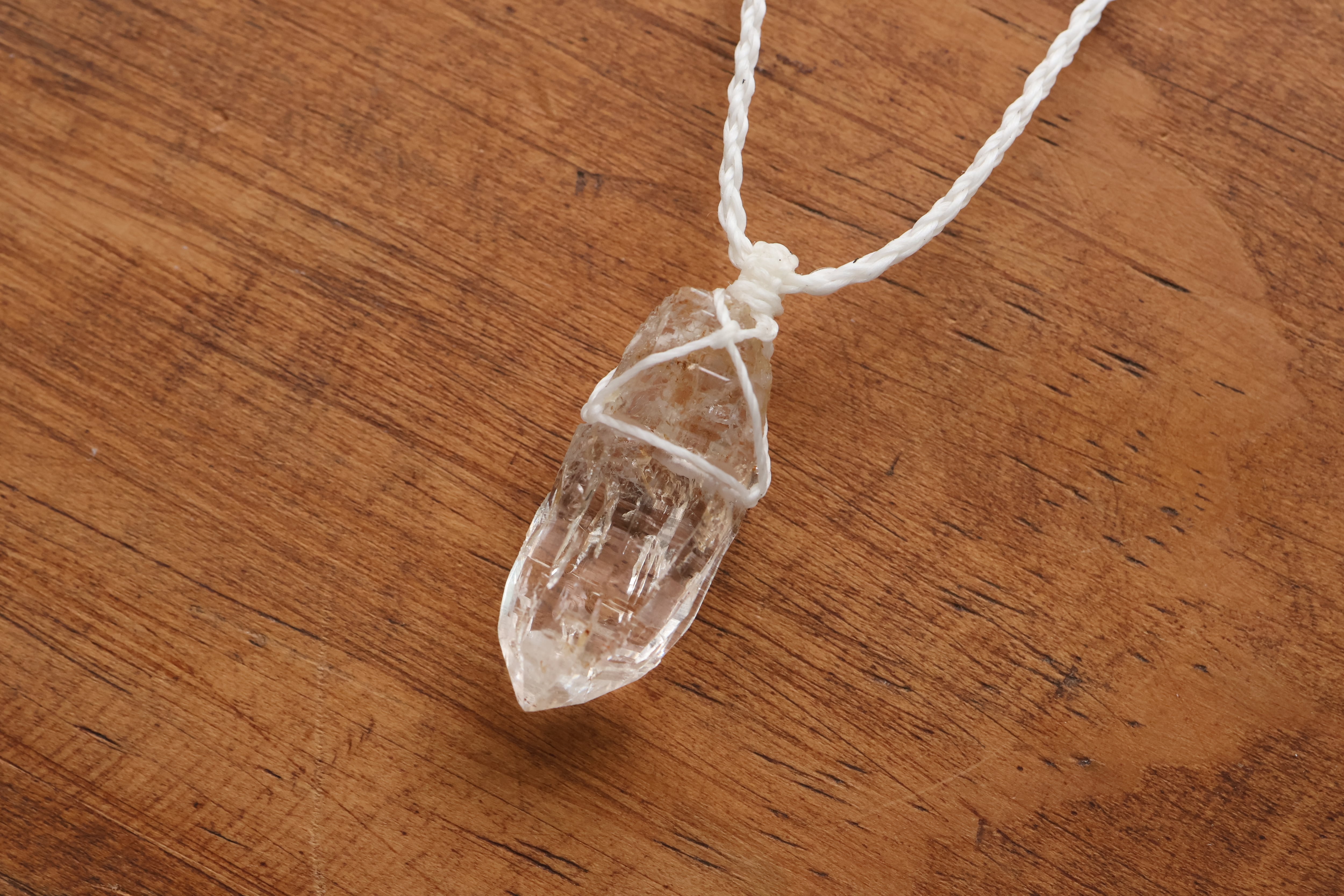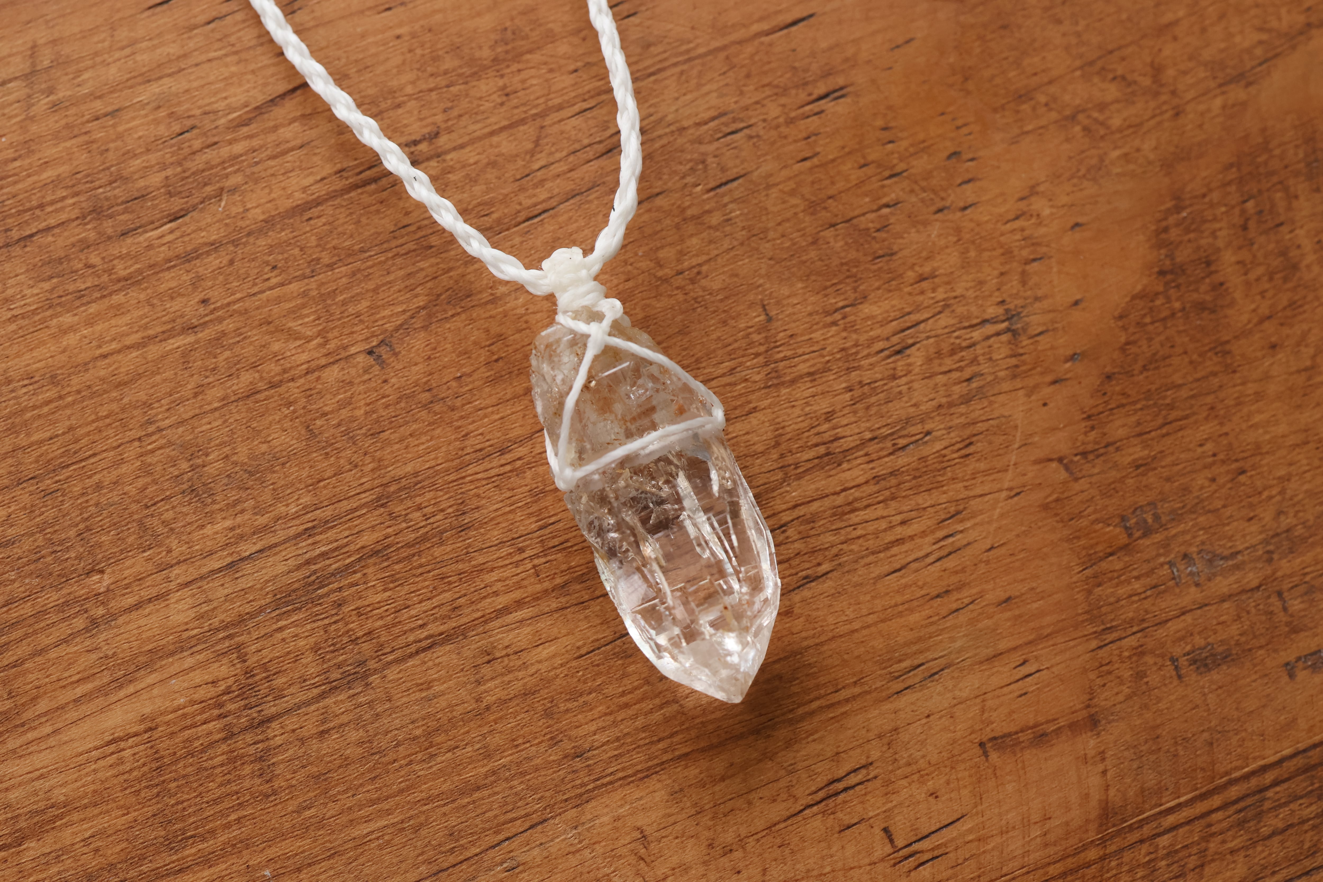 透き通る水の雫のような透明度が高いガネーシュヒマール産のヒマラヤ水晶をシンプルに編み、ペンダントに仕立てました。