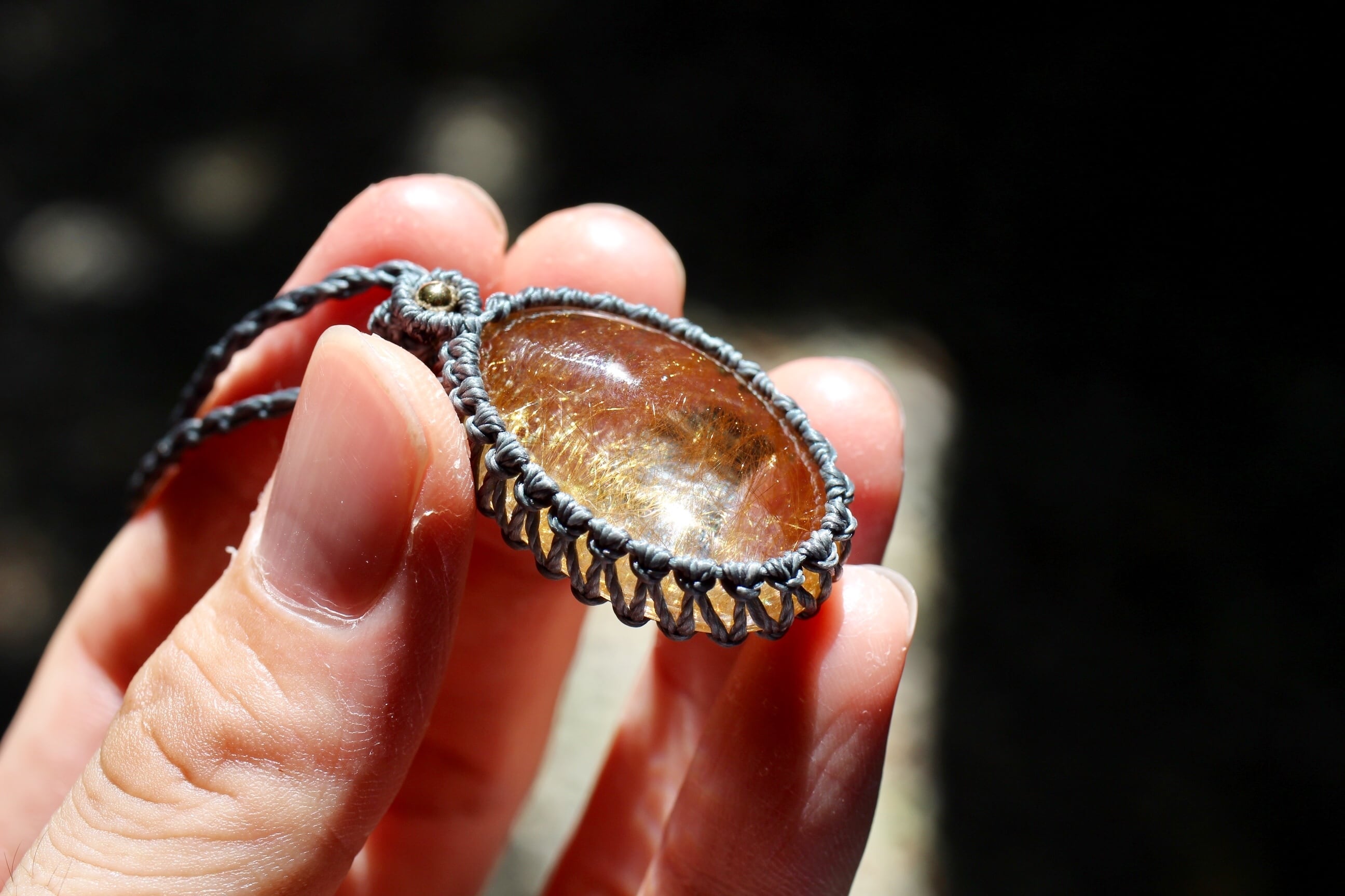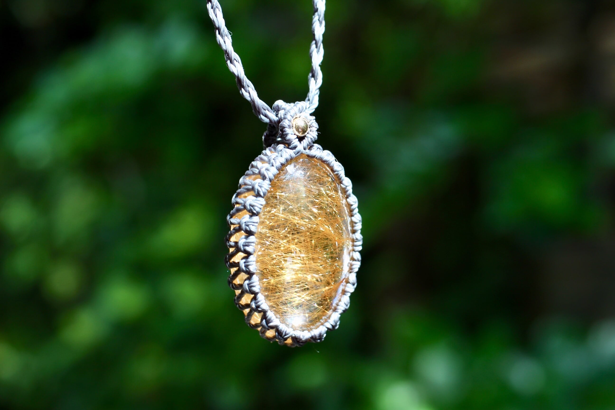 透き通る水の雫のような、黄金色のルチルがきっしりと内包されたヒマラヤ水晶をマクラメ編みのペンダントに仕立てました。